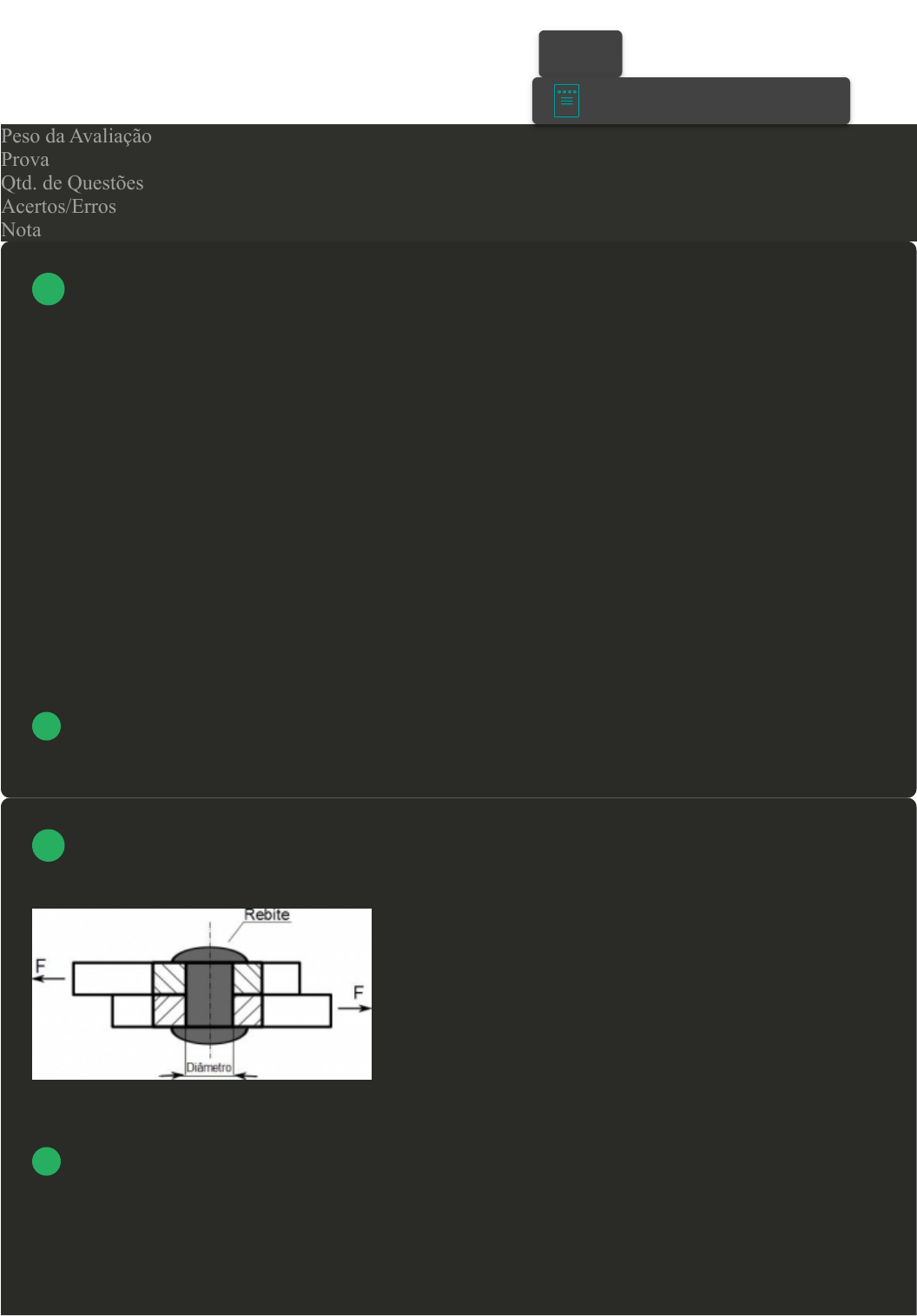 Prova Impressa GABARITO | Avaliação Final (Objetiva) - Individual (Cod.:957104) Peso da Avaliação 4,00 Prova 79738114 Qtd. de Questões 12 Acertos/Erros 9/3 Nota 9,00 Uma pedra é lançada do décimo andar de um prédio com velocidade inicial de 5 m/s. Sendo a altura nesse ponto igual a 30 m, e a aceleração da gravidade, a 10 m/s2, qual velocidade a pedra terá ao atingir o chão? A 10 m/s. B 20 m/s. C 5 m/s. D 25 m/s. A figura seguinte mostra um rebite que será usado para unir duas chapas de aço. Encontre o diâmetro do rebite, sabendo que este deve suportar um esforço cortante de 60500 N e a tensão de cisalhamento sobre a área da seção transversal do rebite é de 500 MPa. A O diâmentro do rebite é: 17,41 mm. B O diâmentro do rebite é: 12,41 mm. C O diâmentro do rebite é: 6,2 mm. VOLTAR A+ Alterar modo de visualização 1 2 D O diâmentro do rebite é: 4,07 mm. A medida direta é uma comparação puramente mecânica como a medida de um comprimento com uma régua. Já a medida indireta trata-se de uma grandeza que se quer conhecer e é calculada a partir de medidas diretas, como: medida da densidade de um corpo; temos que fazer uma medida direta da massa e uma medida direta do volume do corpo para, em seguida, encontrar através de um cálculo a densidade, r = m/V. Sobre exemplos de medidas diretas, classifique V para as sentenças verdadeiras e F para as falsas: ( ) A massa e o comprimento. ( ) A velocidade e a densidade. ( ) O trabalho e o peso. ( ) A temperatura e a energia. Assinale a alternativa que apresenta a sequência CORRETA: A V - F - F - F. B F - F - V - V. C F - V - F - V. D V - F - V - V. Deve-se levar em conta o fato da componente radial da aceleração depender do raio da trajetória circular nos projetos de estruturas e mecanismos como as asas de avião e as linhas férreas evitando-se variações repentinas na curvatura. A partir disso, considere que em uma corrida, um maratonista estava a uma velocidades de 12m/s, e teve que contornar uma curva com raio de 18m. Qual será o módulo de sua aceleração? A 8,2 m/s2. B 8,8 m/s2. C 10 m/s2. D 8 m/s2. 3 4 Considere um bloco de 120 kg, tencionada de uma pequena polia que pode virar sobre o cabo ACB, sendo que a polia e sua carga são protegidas na posição ilustrada na figura por um segundo cabo DE, paralelo ao trecho CB do cabo e desprezando o raio da polia e a massa dos cabos e da roldana. Considerando os dados apresentados, assinale a alternativa CORRETA: A A tração encontrada entre os cabos ABC é de 245,62 N com relação à base do bloco que está parado. B A diferença das forças entre os eixos x e y resulta em uma tração que compensa a resultante entre os cabos ADB. C O peso do bloco é de 1176 N, o valor refere-se aos ângulos entre os cabos CB é de 33,02° e AB de 21,54°. D O valor referente aos ângulos entre os cabos AC é de 45,32° e AB é de 90°, sendo que a resultante dos ângulos de um triângulo é de 360°. Diferentemente do MRU, o movimento retilíneo uniformemente variado- também conhecido por MRUV-, demonstra que a velocidade varia uniformemente em razão ao tempo. Acerca das características do MRU e MRUV, assinale a alternativa CORRETA: A MRU possui aceleração constante e MRUV possui velocidade constante. B MRU possui velocidade constantes e MRUV possui aceleração constante. C MRU possui velocidade constantes e MRUV não possui aceleração. D MRU possui velocidade variável e MRUV possui aceleração constante. Um ciclista programou que no final de semana deseja pedalar 48 km em um intervalo de tempo de 1 hora e 40 minutos. Se ele conseguir o seu intento, qual sua velocidade média em km/h? A Sua velocidade média será 26,2 km/h. 5 6 7 B Sua velocidade média será 28,8 km/h. C Sua velocidade média será 41,3 km/h. D Sua velocidade média será 32,4 km/h. Para que um corpo rígido esteja em equilíbrio, além de não se mover, este corpo não pode girar, sendo necessário fazer a avaliação de seus movimentos de rotação e translação. Sempre que a velocidade vetorial for constante, é possível certificar que o objeto se encontra em equilíbrio de translação. Sobre as condições de equilíbrio, assinale a alternativa CORRETA: A São determinadas as condições apropriadas para que um corpo se conserve em equilíbrio, é essencial que o somatório dos momentos seja maior que zero. B São condições necessárias e suficientes para o equilíbrio de um corpo rígido que o somatório das forças e dos momentos sejam nulos. C Os requisitos estabelecidos para que um corpo permaneça em equilíbrio em um corpo rígido, é necessário que o somatório das forças seja maior que zero. D Umas das condições de equilíbrio determinados para que um corpo se mantenha em equilíbrio estático é importante que ele mantenha sua velocidade. Conforme determinado na segunda Lei de Newton, a relação entre força, massa e aceleração define que a intensidade de uma força é o produto da massa por uma aceleração. Considere dois blocos, sendo um com massa de 9 kg e outro com 7 kg, respectivamente, e que a força aplicada ao sistema é de 36 N. Com base no exposto, assinale a alternativa CORRETA: A A resultante das forças entre os blocos define a aceleração referente à força aplicada no sistema. B A intensidade da força que atua entre os dois blocos é de 15,75N e sua aceleração de 2,25m/s2. C Os blocos estão relacionados com a intensidade da força e o produto entre o peso desprezado na aceleração. D O produto resultante entre as massas e a aceleração do sistema é definida como a força aplicada entre os blocos. Um jogador de golfe lança uma bola a partir da origem com uma velocidade inicial de 20 m/s e um ângulo de 45 graus com a horizontal. Considere =10 m/s². Determine o raio de curvatura da trajetória descrita pela bola no ponto mais alto da trajetória: 8 9 10 A 25 m. B 10 m. C 20 m. D 15 m. (ENADE 2021) O físico italiano Galileo Galilei (1564 – 16