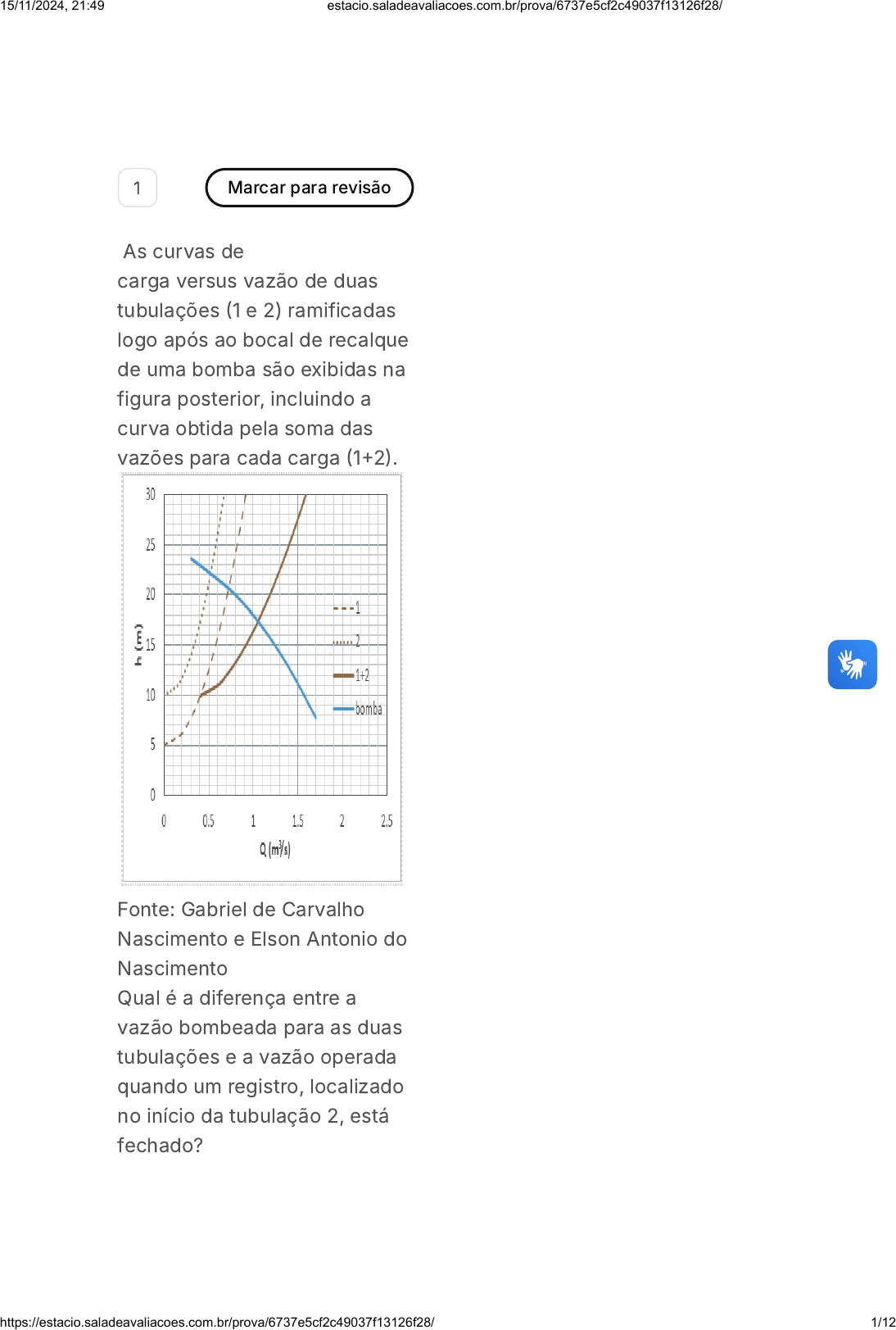 1 Marcar para revisão As curvas de carga versus vazão de duas tubulações �1 e 2) ramificadas logo após ao bocal de recalque de uma bomba são exibidas na figura posterior, incluindo a curva obtida pela soma das vazões para cada carga �1�2�. Fonte: Gabriel de Carvalho Nascimento e Elson Antonio do Nascimento Qual é a diferença entre a vazão bombeada para as duas tubulações e a vazão operada quando um registro, localizado no início da tubulação 2, está fechado? 15/11/2024, 21:49 estacio.saladeavaliacoes.com.br/prova/6737e5cf2c49037f13126f28/ https://estacio.saladeavaliacoes.com.br/prova/6737e5cf2c49037f13126f28/ 1/12 A B C D E A B C 0,34 m³/s 0,53 m³/s 1,05 m³/s 1,50 m³/s 0,20 m³/s 2 Marcar para revisão �INMETRO � Engenharia Mecânica, 2010� No contexto de dimensionamento de bombas, o aparecimento de uma cavitação se dá por meio de: Uso de tubulação de sucção reta e muito curta. Rugosidade do rotor. NPSH disponível menor que o NPSH requerido. 15/11/2024, 21:49 estacio.saladeavaliacoes.com.br/prova/6737e5cf2c49037f13126f28/ https://estacio.saladeavaliacoes.com.br/prova/6737e5cf2c49037f13126f28/ 2/12 D E Instalação de válvula de retenção nas sucções positivas. Excesso de escorvamento da bomba. 3 Marcar para revisão �ENADE � ENGENHARIA GRUPO IV, 2011� Em sistemas de escoamento de fluidos (gases ou líquidos), é muito comum ser necessário adicionar-se energia para manter o escoamento. Bombas e compressores são exemplos de equipamentos que fornecem energia aos fluidos. Suponha que, em uma estação de tratamento de efluentes que opera em uma indústria, uma das bombas centrífugas usadas para garantir o escoamento do efluente está apresentando cavitação. O fabricante da bomba forneceu a curva da bomba e o NPSH característico para a operação dessa bomba. Tendo em vista essa situação, analise as afirmações a seguir. I. Se há cavitação, significa que o NPSH do sistema nas condições de operação é superior ao NPSH indicado pelo fabricante. 15/11/2024, 21:49 estacio.saladeavaliacoes.com.br/prova/6737e5cf2c49037f13126f28/ https://estacio.saladeavaliacoes.com.br/prova/6737e5cf2c49037f13126f28/ 3/12 A B C D E II. Pode-se solucionar o problema de cavitação aumentando-se a rotação da bomba ou a vazão. III. O NPSH pode ser definido como a diferença entre a carga estática na entrada da sucção e a carga correspondente à pressão de vapor do líquido na entrada da bomba. IV. Cavitação é a formação de regiões de baixa pressão, que ocorre quando a pressão fica abaixo da pressão de vapor do líquido e ocorre a vaporização nesses pontos. As bolhas deslocam-se para regiões de maior pressão e colapsam. É correto apenas o que se afirma em: I II II e IV I e III III e IV 4 Marcar para revisão �ENADE � ENGENHARIA GRUPO III, 2011� 15/11/2024, 21:49 estacio.saladeavaliacoes.com.br/prova/6737e5cf2c49037f13126f28/ https://estacio.saladeavaliacoes.com.br/prova/6737e5cf2c49037f13126f28/ 4/12 A B C D E Uma bomba de água é movida por um motor elétrico de 18 kW, cuja eficiência é de 90%. A vazão é de 40 litros por segundo. O diâmetro na tubulação é constante, a diferença das cotas entre os pontos �1) e �2) é desprezível e a perda de carga entre esses pontos corresponde a 5 m. As pressões manométricas na entrada e na saída são, respectivamente, de 150 kPa e 400 kPa. Considerando o peso específico da água δ = 10 000 e a aceleração da gravidade g = , conclui-se que a eficiência da bomba é de: N m3 10m s2 40%. 50%. 62%. 74%. 90% 15/11/2024, 21:49 estacio.saladeavaliacoes.com.br/prova/6737e5cf2c49037f13126f28/ https://estacio.saladeavaliacoes.com.br/prova/6737e5cf2c49037f13126f28/ 5/12 A B C 5 Marcar para revisão �CESPE�CEBRASPE/2006 � Adaptada) Turbinas hidráulicas aproveitam a energia hidráulica do escoamento para a geração de energia elétrica. Acerca das turbinas usadas para geração hidroelétrica, a afirmativa correta é: As turbinas Francis, Hélice, Bulbo e Kaplan, são chamadas de turbinas de ação, pois funcionam com a pressão da água variando desde a entrada da turbina até a saída. Nas turbinas Bulbo, turbina e gerador são integrados em um só invólucro. As turbinas Kaplan têm as pás fixas posicionadas no ângulo de melhor rendimento. 00 hora : 24 min : 04 seg Ocultar Questão 9 de 10 SM2 Máquinas Hidráulicas 15/11/2024, 21:49 estacio.saladeavaliacoes.com.br/prova/6737e5cf2c49037f13126f28/ https://estacio.saladeavaliacoes.com.br/prova/6737e5cf2c49037f13126f28/ 6/12 D E A B C As turbinas Francis são máquinas de reação do tipo misto. São recomendadas para desníveis acima de 600 m e baixas vazões. As turbinas tipo Pelton possuem aletas ajustáveis para a melhor vazão. 6 Marcar para revisão A cavitação é um fenômeno que ocorre por conta de uma redução na pressão do fluido a ponto de o mesmo se aproximar da pressão de vapor ocasionando bolhas de vapor que podem degradar a máquina e prejudicar o desempenho. Um coeficiente é calculado a fim de se prevenir a máquina quanto aos efeitos da cavitação. Este coeficiente é conhecido como: Coeficiente de atrito. Coeficiente de Darcy. Coeficiente de Thoma. Respondidas �10� Em branco �0� Finalizar prova 1 2 3 4 5 6 7 8 9 10 15/11/2024, 21:49 estacio.saladeavaliacoes.com.br/prova/6737e5cf2c49037f13126f28/ https://estacio.saladeavaliacoes.com.br/prova/6737e5cf2c49037f13126f28/ 7/12 D E A B C D E Coeficiente de Moody. Coeficiente de Rouse. 7 Marcar para revisão Nas turbinas hidráulicas algumas perdas devem ser computadas para o cálculo exato das potências existentes na máquina. Sendo assim, a eficiência relacionada entre a vazão realmente escoada pelo rotor e a total disponibilizada é conhecida como: Rendimento mecânico. Rendimento volumétrico. Rendimento de atrito. Rendimento hidráulico. Rendimento total. 15/11/2024, 21:49 estacio.saladeavaliacoes.com.br/prova/6737e5cf2c49037f13126f28/ http