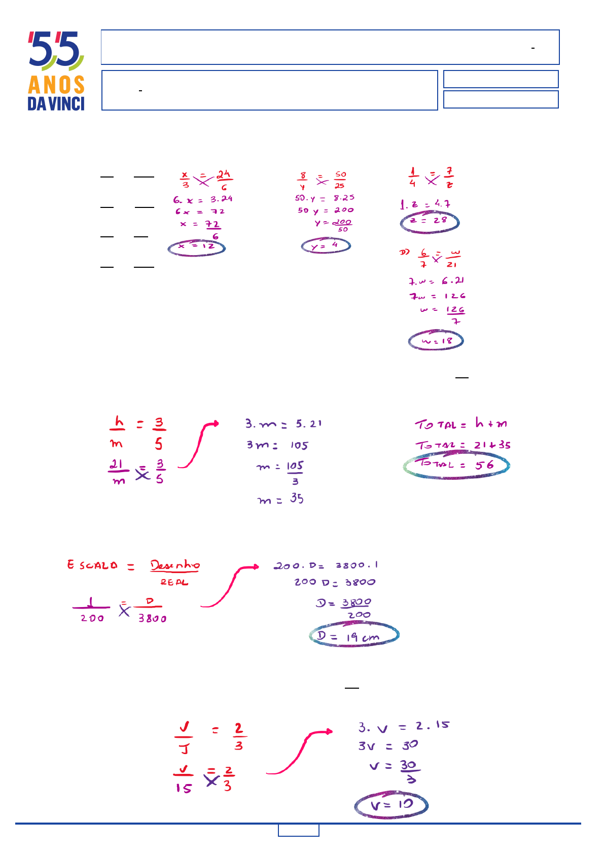 Nome: Matrícula: Período: 3o Ano: 7o Turma: Ensino: Fundamental Exercício MATEMÁTICA Lista Semanal 7 – Razão e Proporção 1. Determine o valor do termo representado pela incógnita nas proporções a seguir. a. 𝑥 3 = 24 6 b. 8 𝑦 = 50 25 c. 1 4 = 7 𝑧 d. 6 7 = 𝑤 21 2. Em uma turma, a razão entre o número de homens e o número de mulheres é . Nessa turma há 21 3 5 homens, qual o número total de alunos da turma? 3. Uma das provas da Gincana da escola de Lina é a construção de maquetes. A turma do 8º ano está construindo uma maquete da quadra que tem 3800 centímetros de comprimento. Se o desenho for feito numa escala de 1 : 200, qual deve ser o comprimento da maquete? 4. Um grupo de amigos decidiu se inscrever em um campeonato de futebol amador. A razão entre o número de vitórias e o número de jogos disputados é de . Se na competição já foram disputadas 2 3 15 partidas, então qual o número de partidas que esse time não venceu? 1 – 3 Documento Nome: Turma: Ano: 7o Ensino: Fundamental 5. Quais são os valores de x e de y nas proporções a seguir? a. b. 6. (Fuvest - Adaptada) No mapa a seguir, a distância, em linha reta, entre as cidades de Araçatuba e Campinas é de 1,5 cm. Na realidade, qual é esta distância? 7. (ENEM) Cinco marcas de pão integral apresentam as seguintes concentrações de fibras (massa de fibra por massa de pão): ● Marca A: 2 g de fibras a cada 50 g de pão; ● Marca B: 5 g de fibras a cada 40 g de pão; ● Marca C: 5 g de fibras a cada 100 g de pão; ● Marca D: 6 g de fibras a cada 90 g de pão; ● Marca E: 7 g de fibras a cada 70 g de pão. Recomenda-se a ingestão do pão que possui a maior concentração de fibras. A marca a ser escolhida é a. A b. B c. C 2 – 3 Documento André Jr Nome: Turma: Ano: 7o Ensino: Fundamental d. D e. E 2 – 3 documento