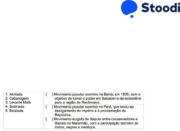 Página 1 Copyright (c) 2013 - 2020 Stoodi Ensino e Treinamento a Distância S.A. - Todos os direitos reservados 1. UFRGS 2015 No bloco à esquerda, são citadas cinco rebeliões ocorridas no Brasil durante o período regencial; no bloco à direita, as razões de ocorrências dessas rebeliões. Associe adequadamente o bloco da direita com o da esquerda. A sequência correta de preenchimento dos parênteses, de cima para baixo, é a. 1 - 3 - 5. b. 2 - 4 - 3. c. 3 - 4 - 1. d. 5 - 3 - 4. e. 3 - 2 - 5. 2. UFRGS 2012 A respeito da Revolta dos Malês, ocorrida na cidade de Salvador em 1835, é correto afirmar que ela foi um movimento liderado por a. escravos oriundos da África Oriental, inspirados na independência do Haiti. b. escravos e libertos de origem africana, que professavam a religião muçulmana. c. escravos nascidos no Brasil e grupos excluídos do processo político-partidário. d. escravos e índios aldeados no Recôncavo, que protestavam contra a exploração. e. populares que se inspiraram na Revolta dos Alfaiates. 3. UESPI 2012 Após a abdicação de D. Pedro I ao trono, o Brasil foi governado por Regências Trinas, conforme previa a Constituição, mas o Ato Adicional de 1834 provocou algumas mudanças, entre as quais se estabelecia: a. a regência una, para a qual o candidato era eleito e não mais indicado pela Assembleia Nacional, saindo vitorioso no primeiro pleito o Padre Diogo Antônio Feijó. b. a eleição direta e secreta de um regente, cuja candidatura era efetivada por seu partido político, ganhando em primeiro lugar o brigadeiro Francisco de Lima e Silva. c. a nomeação de um regente escolhido pelo presidente do Senado, a partir de uma lista composta dos nomes de três deputados, sendo nomeado o ministro Diogo Antonio Feijó. d. as regências unas provisórias, cujo regente seria escolhido entre os deputados provinciais, que revezavam-se no poder, sendo o primeiro, José da Costa Carvalho. e. a eleição popular de um regente, que ocuparia o cargo até a maioridade do herdeiro do trono, sendo eleito em primeiro lugar o senador Nicolau Vergueiro. 4. UNESP 2012 A maioridade do príncipe D. Pedro foi antecipada, em 1840, para que ele pudesse assumir o trono brasileiro. Entre os objetivos do chamado Golpe da Maioridade, podemos citar o esforço de a. obter o apoio das oligarquias regionais, insatisfeitas com a centralização política ocorrida durante o Período Regencial. b. ampliar a autonomia das províncias e reduzir a interferência do poder central nas unidades administrativas. c. abolir o Ato Adicional de 1834 e aumentar os efeitos federalistas da Lei Interpretativa do Ato, editada seis anos depois. d. promover ampla reforma constitucional de caráter liberal e democrático no país, reagindo ao centralismo da Constituição de 1824. e. restabelecer a estabilidade política, comprometida durante o Período Regencial, e conter revoltas de caráter regionalista. 5. UECE 2014 No Brasil, o período que seguiu logo após a abdicação de D. Pedro I foi marcado por um conjunto de crises. Observe o que é dito sobre o que ocorria nesse momento. I. As diversas forças políticas lutavam pelo poder, e as reivindicações populares eram por melhores condições de vida. II. Os conflitos ocorridos representavam o protesto do povo contra a centralização do governo, e eram marcados pela reivindicação por maior participação popular na vida política do País. III. As convulsões populares do período exigiam o reforço das antigas realidades sociais, bem como a submissão das forças políticas ao poder central. Página 2 Copyright (c) 2013 - 2020 Stoodi Ensino e Treinamento a Distância S.A. - Todos os direitos reservados Está correto o que se afirma somente em a. II e III. b. I. c. l e II. d. III. 6. UFV 2010 Observe a imagem a seguir: Com relação a Guarda Nacional, criada durante o Império, é CORRETO afirmar que: a. funcionava como única força armada que podia defender os interesses dos escravistas e coibir a fuga dos escravos. b. objetivava o controle da Corte e da burocracia imperial, alvos frequentes de manifestações populares de descontentamento. c. tinha por finalidade a garantia da segurança e da ordem, defendendo a Constituição, a obediência as leis e a integridade do Império. d. atuava na defesa das fronteiras externas brasileiras, impedindo a expansão dos países platinos em direção ao território brasileiro. 7. UFSJ 2013 "[...I Nada mais liberal que um conservador na oposição; nada mais conservador que um liberal no governo" SILVA, Francisco de Assis, BASTOS, Pedro Ivo de Assis. História do Brasil. São Paulo: Editora Moderna, 1976 p. 107. Analise as afirmativas a seguir, sobre a expressão acima. I. Muito propagada no Período Regencial, mostra que, embora com denominações diferentes, “conservadores" e "liberais" possuíam basicamente os mesmos interesses. II. Muito propagada no Período Regencial, mostra que “conservadores" e "liberais" possuíam posições políticas, sociais e econômicas muito distintas. III. Muito propagada no Período Regencial, mostra que “conservadores" e "liberais" possuíam as mesmas origens sociais e não se opunham, por exemplo, à escravidão. IV. Muito propagada no Período Regencial, mostra que “conservadores" e "liberais" possuíam concepções políticas muito diferentes e defendiam a participação popular no poder. De acordo com essa análise, são CORRETAS apenas as alternativas a. I e llI b. II e IV c. l e IV d. Il e IIl 8. ESPM 2014 Num momento da história do império conhecido como "avanço liberal", durante as regências, foram adotadas algumas medidas que concediam maior poder à representação local. (Sonia Guarita do Amaral. O Brasil como império) Aponte entre as alternativas aquela que apresente duas reformas liberais: a. Ato Adicional - Reforma do Código de Processo Criminal. b. Lei de Terras - Lei Saraiva Cotegipe. c. Lei Rio Branco - Código de Processo Criminal. d. Tarif