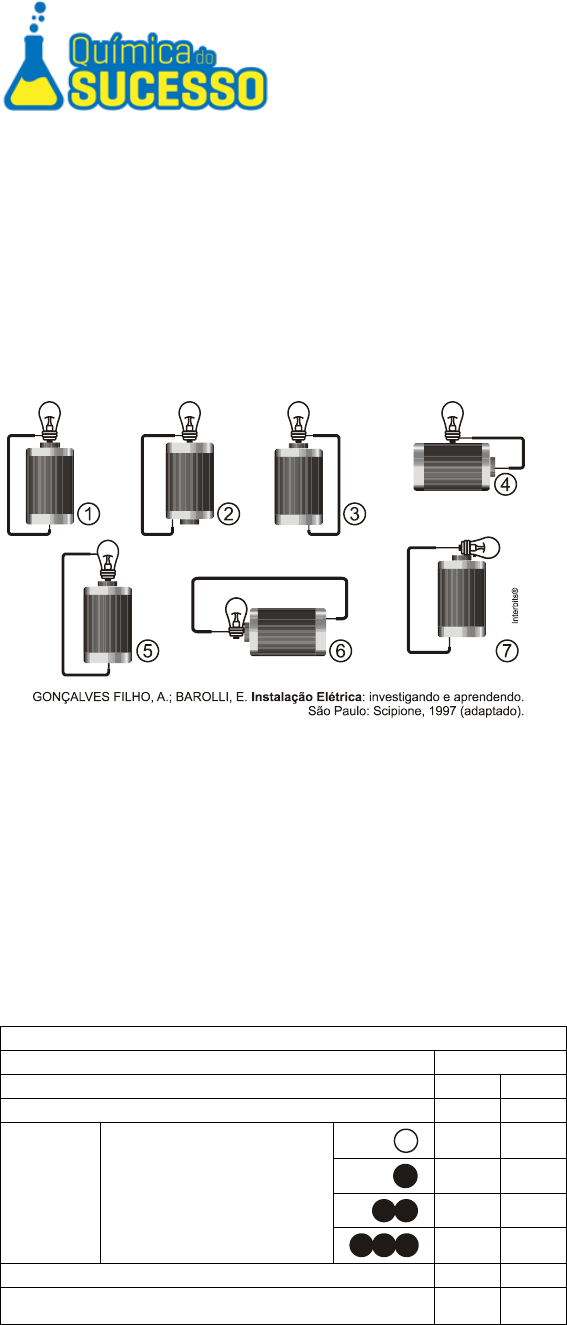 Física 01 c) refração da luz a uma grande profundidade acontece com uma intensidade menor que a do som. d) atenuação da luz nos materiais analisados é distinta da atenuação de som nestes mesmos materiais. e) reflexão da luz nas camadas de sedimentos é menos intensa do que a reflexão do som neste material. 25. (Enem 2011) Um curioso estudante, empolgado com a aula de circuito elétrico que assistiu na escola, resolve desmontar sua lanterna. Utilizando-se da lâmpada e da pilha, retiradas do equipamento, e de um fio com as extremidades descascadas, faz as seguintes ligações com a intenção de acender a lâmpada: Tendo por base os esquemas mostrados, em quais casos a lâmpada acendeu? a) (1), (3), (6) b) (3), (4), (5) c) (1), (3), (5) d) (1), (3), (7) e) (1), (2), (5) 26. (Enem 2011) Em um manual de um chuveiro elétrico são encontradas informações sobre algumas características técnicas, ilustradas no quadro, como a tensão de alimentação, a potência dissipada, o dimensionamento do disjuntor ou fusível, e a área da seção transversal dos condutores utilizados. CARACTERÍSTICAS TÉCNICAS Especificação Modelo A B Tensão (V~) 127 220 Potência (Watt) Seletor de Temperatura Multitemperaturas 0 0 2440 2540 4400 4400 5500 6000 Disjuntor ou fusível (Ampere) 50 30 Seção dos condutores 2(mm ) 10 4 Uma pessoa adquiriu um chuveiro do modelo A e, ao ler o manual, verificou que precisava ligá- lo a um disjuntor de 50 amperes. No entanto, intrigou-se com o fato de que o disjuntor a ser utilizado para uma correta instalação de um chuveiro do modelo B devia possuir amperagem 40% menor. Física 01 Considerando-se os chuveiros de modelos A e B, funcionando à mesma potência de 4 400 W, a razão entre as suas respectivas resistências elétricas, AR e BR que justifica a diferença de dimensionamento dos disjuntores, é mais próxima de: a) 0,3. b) 0,6. c) 0,8. d) 1,7. e) 3,0. 27. (Enem 2011) O manual de funcionamento de um captador de guitarra elétrica apresenta o seguinte texto: Esse captador comum consiste de uma bobina, fios condutores enrolados em torno de um ímã permanente. O campo magnético do ímã induz o ordenamento dos polos magnéticos na corda da guitarra, que está próxima a ele. Assim, quando a corda é tocada, as oscilações produzem variações, com o mesmo padrão, no fluxo magnético que atravessa a bobina. Isso induz uma corrente elétrica na bobina, que é transmitida até o amplificador e, daí, para o alto-falante. Um guitarrista trocou as cordas originais de sua guitarra, que eram feitas de aço, por outras feitas de náilon. Com o uso dessas cordas, o amplificador ligado ao instrumento não emitia mais som, porque a corda de náilon a) isola a passagem de corrente elétrica da bobina para o alto-falante. b) varia seu comprimento mais intensamente do que ocorre com o aço. c) apresenta uma magnetização desprezível sob a ação do ímã permanente. d) induz correntes elétricas na bobina mais intensas que a capacidade do captador. e) oscila com uma frequência menor do que a que pode ser percebida pelo captador. 28. (Enem 2011) Ao diminuir o tamanho de um orifício atravessado por um feixe de luz, passa menos luz por intervalo de tempo, e próximo da situação de completo fechamento do orifício, verifica-se que a luz apresenta um comportamento como o ilustrado nas figuras. Sabe-se que o som, dentro de suas particularidades, também pode se comportar dessa forma. Em qual das situações a seguir está representado o fenômeno descrito no texto? a) Ao se esconder atrás de um muro, um menino ouve a conversa de seus colegas. b) Ao gritar diante de um desfiladeiro, uma pessoa ouve a repetição do seu próprio grito. c) Ao encostar o ouvido no chão, um homem percebe o som de uma locomotiva antes de ouvi- lo pelo ar. Física 01 d) Ao ouvir uma ambulância se aproximando, uma pessoa percebe o som mais agudo do que quando aquela se afasta. e) Ao emitir uma nota musical muito aguda, uma cantora de ópera faz com que uma taça de cristal se despedace. 29. (Enem 2ª aplicação 2010) Rua da Passagem Os automóveis atrapalham o trânsito. Gentileza é fundamental. Não adianta esquentar a cabeça. Menos peso do pé no pedal. O trecho da música, de Lenine e Arnaldo Antunes (1999), ilustra a preocupação com o trânsito nas cidades, motivo de uma campanha publicitária de uma seguradora brasileira. Considere dois automóveis, A e B, respectivamente conduzidos por um motorista imprudente e por um motorista consciente e adepto da campanha citada. Ambos se encontram lado a lado no instante inicial t = 0 s, quando avistam um semáforo amarelo (que indica atenção, parada obrigatória ao se tornar vermelho). O movimento de A e B pode ser analisado por meio do gráfico, que representa a velocidade de cada automóvel em função do tempo. As velocidades dos veículos variam com o tempo em dois intervalos: (I) entre os instantes 10s e 20s; (II) entre os instantes 30s e 40s. De acordo com o gráfico, quais são os módulos das taxas de variação da velocidade do veículo conduzido pelo motorista imprudente, em m/s2, nos intervalos (I) e (II), respectivamente? a) 1,0 e 3,0 b) 2,0 e 1,0 c) 2,0 e 1,5 d) 2,0 e 3,0 e) 10,0 e 30,0 30. (Enem 2010) Com o objetivo de se testar a eficiência de fornos de micro-ondas, planejou- se o aquecimento em 10°C de amostras de diferentes substâncias, cada uma com determinada massa, em cinco fornos de marcas distintas. Nesse teste, cada forno operou à potência máxima. O forno mais eficiente foi aquele que a) forneceu a maior quantidade de energia às amostras. b) cedeu energia à amostra de maior massa em mais tempo. c) forneceu a maior quantidade de energia em menos tempo. d) cedeu energia à amostra de menor calor específico mais lentamente. e) forneceu a menor quantidade de energia às amostras em menos tempo. 31. (Enem 2010) Deseja-se instalar uma estação de geração de energia elétrica em um município localizado no