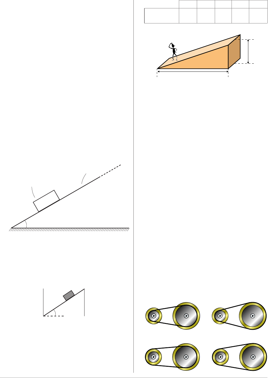 10 Despreze a massa da corda e atritos de qualquer natureza. a) Esboce o diagrama de forças para cada um dos dois corpos. b) Se o corpo II move-se para baixo com aceleração a = 4 m/s2, determine a tração T na corda. 74. (UFRN) Paulinho, após ter assistido a uma aula de Física sobre plano inclinado, decide fazer uma aplicação prática do assunto: analisar o que ocorre com ele e sua tábua de morro (usada no “es- quibunda”), ao descer uma duna, inclinada de 30° em relação à horizontal e cuja extensão é de 40 m. Inicialmente, Paulinho passa numa farmácia e verifica que a mas- sa total, mT, do conjunto (isto é, sua massa mais a massa da tá- bua) é de 60 kg. Sendo a tábua de fórmica, bastante lisa e lubrifi- cada com parafina, ele decide, numa primeira aproximação, desprezar o atrito entre a tábua e a areia da duna bem como a re- sistência do ar. Admitindo que, em nenhum momento da descida, Paulinho coloca os pés em contato com a areia, considerando que a aceleração da gravidade é 10 m/s2 e lembrando que sen 30° = 1 :—2 a) determine a velocidade, em m/s e em km/h, com que o conjun- to (Paulinho com a tábua) chegará à base da duna, supondo que ele tenha partido, do topo, do estado de repouso; b) reproduza a figura abaixo e faça o diagrama das forças exter- nas que atuam no conjunto, colocando essas forças no centro de massa do bloco; (Observe que, na figura, o bloco representa o conjunto, e o pla- no inclinado representa a duna.) c) calcule o valor da força resultante que atua no conjunto; d) indique se a velocidade com que o conjunto chegará à base da duna será maior, igual ou menor que a velocidade determinada no subitem a, se o atrito entre a tábua e a areia for levado em conta. Justifique. 75. (Unifor-CE) A inclinação do plano representado abaixo é tal que um corpo, nele abandonado, desliza para baixo mantendo cons- tante a sua velocidade. O coeficiente de atrito cinético entre o corpo e o plano, nessas condições, é igual a: a) sen �. d) sec �. b) cos �. e) cotg �. c) tg �. 76. (UFPA) Para revestir uma rampa foram encontrados 5 (cinco) tipos de piso, cujos coeficientes de atrito estático, com calçados com sola de couro, são dados na tabela a seguir. Piso 1 Piso 2 Piso 3 Piso 4 Piso 5 Coeficientes de atrito 0,2 0,3 0,4 0,5 0,6 A rampa possui as dimensões indicadas na figura abaixo. Considere que o custo do piso é proporcional ao coeficiente de atrito indicado na tabela. Visando economia e eficiência, qual o tipo de piso que deve ser usado para o revestimento da rampa? Justifique sua resposta com argumentos e cálculos necessários. 77. (UFJF-MG) Um carro desce por um plano inclinado, continua mo- vendo-se por um plano horizontal e, em seguida, colide com um poste. Ao investigar o acidente, um perito de trânsito verificou que o carro tinha um vazamento de óleo que fazia pingar no chão gotas em intervalos de tempo iguais. Ele verificou também que a distância entre as gotas era constante no plano inclinado e dimi- nuía gradativamente no plano horizontal. Desprezando a resistên- cia do ar, o perito pode concluir que o carro: a) vinha acelerando na descida e passou a frear no plano hori- zontal. b) descia livremente no plano inclinado e passou a frear no plano horizontal. c) vinha freando desde o trecho no plano inclinado. d) não reduziu a velocidade até o choque. 78. (UAM-SP) O coração humano, em média, executa 6 480 000 pul- sações em um dia. A frequência cardíaca, em hertz, é de: a) 35. b) 55. c) 75. d) 95. 79. (PUC-RJ) Um disco está girando com uma rotação constante em torno de um eixo vertical que passa pelo seu centro. Um certo ponto Q está duas vezes mais afastado deste centro do que um outro ponto P. A velocidade angular de Q, num certo instante, é: a) a mesma que a de P. b) duas vezes maior que a de P. c) metade da de P. d) quatro vezes maior que a de P. e) um quarto da de P. 80. (Mack-SP) Quatro polias, solidárias duas a duas, podem ser aco- pladas por meio de uma única correia, conforme as possibilidades abaixo ilustradas. 30° conjunto (Paulinho + tábua) duna � � � 12,0 m 4,0 m Os raios das polias A, B, C e D são, respectivamente, 4,0 cm, 6,0 cm, 8,0 cm e 10 cm. Sabendo que a frequência do eixo do conjunto CD é 4 800 rpm, a maior frequência obtida para o eixo do conjunto AB, dentre as combinações citadas, é: a) 400 Hz. b) 200 Hz. c) 160 Hz. d) 133 Hz. e) 107 Hz. 81. (Mack-SP) Um automóvel, cujos pneus têm diâmetro externo de 52 cm, percorre, com velocidade constante, 483,6 m em 1min. Desprezando sua deformação, o período do movimento de rota- ção desses pneus é: (Adote: π = 3,1.) a) 0,1s. b) 0,2s. c) 0,3s. d) 0,4s. e) 0,5s. 82. (UFC-CE) Considere um relógio de pulso em que o ponteiro dos se- gundos tem um comprimento, rs = 7 mm, e o ponteiro dos minutos tem um comprimento, rm = 5 mm (ambos medidos a partir do eixo central do relógio). Sejam, vs a velocidade da extremidade do ponteiro dos segundos, e vm, a velocidade da extremidade do ponteiro dos minutos. A razão vs é igual a:—vm a) 35. b) 42. c) 70. d) 84. e) 96. 83. (Vunesp) O comprimento da banda de rodagem (circunferência ex- terna) do pneu de uma bicicleta é de aproximadamente 2 m. a) Determine o número n de voltas (rotações) dadas pela roda da bicicleta, quando o ciclista percorre uma distância de 6,0 km. b) Supondo que esta distância tenha sido percorrida com veloci- dade constante de 18 km/h, determine, em hertz, a frequência de rotação da roda durante o percurso. 84. (Unicamp-SP) O gráfico abaixo representa, em função do tempo, a altura em relação ao chão de um ponto localizado na borda de uma das rodas de um automóvel em movimento. Aproxime π ≅ 3,1. Considere uma volta completa da roda e determine: a) a velocidade angular da roda; b) o componente vertical da velocidade média do ponto em rela- ção ao chão; c) o componente horizontal da velocidade média do ponto em re- lação ao