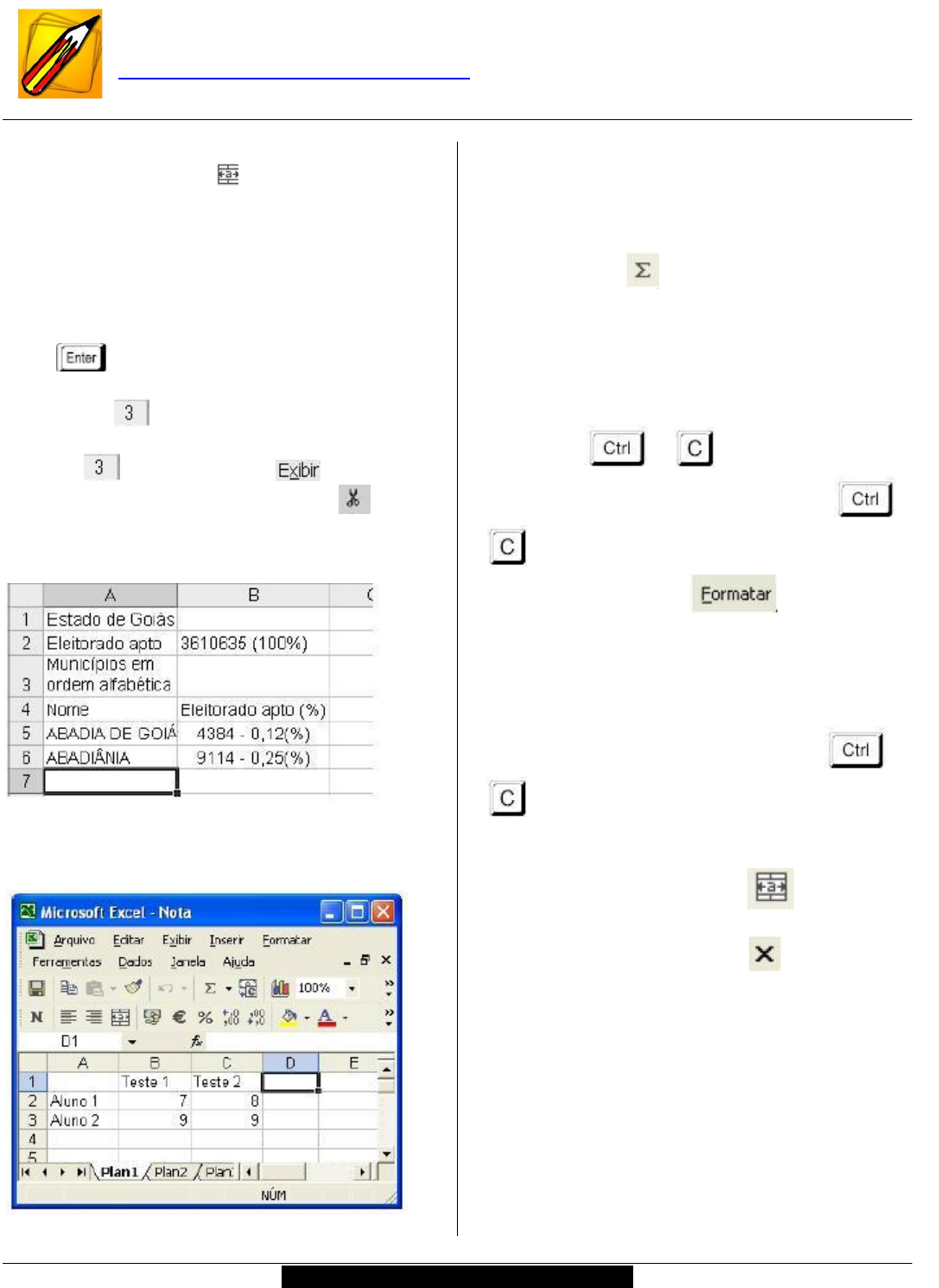 217 www.1001questoesdeconcurso.com.br Quer entrar para lista preferencial para receber mais 1001 QUESTÕES DE CONCURSO de outras bancas ou matérias? Sim?! Então, cadastre o seu email no meu site www.1001questoesdeconcurso.com.br para receber mais questões e outras surpresas. c) Caso se selecione as células A1, A2, B1 e B2 e, em seguida, se clique , essas células ficarão mescladas em uma única célula, que conterá todo o texto existente nas células selecionadas. d) Para se obter o número constante da célula B7 - 9114 -, referente aos eleitores aptos a votar em Abadiânia, e pôr o resultado na célula B8, é suficiente realizar o seguinte procedimento: clicar a célula B8, digitar =B2*0,25/100 e, em seguida, teclar . e) A eliminação das células em branco da linha indicada por pode ser obtida realizando-se as seguintes ações: clicar o cabeçalho da linha referida - -; clicar o menu ; na lista de opções decorrente dessa ação, clicar . Após esse procedimento, obtém-se a planilha ilustrada parcialmente na figura a seguir. 947 - CESPE - 2007 - TRE-PA - ANALISTA JUDICIÁRIO A figura acima mostra uma janela do Excel 2002 que contém uma planilha com dados relativos a notas de dois alunos. Acerca dessa planilha, assinale a opção correta. a) Ao se selecionar as células B2 e C2 e, a seguir, se clicar , será exibida, na célula D2, a média aritmética das duas provas do aluno 1. b) Para se copiar os conteúdos das células B2 e B3 para as células D2 e D3, é suficiente realizar a seguinte seqüência de ações: clicar, com o botão direito do mouse, a célula B2 e, em seguida, a célula B3; pressionar simultaneamente as teclas e ; clicar a célula D3; pressionar simultaneamente as teclas e . c) Ao se clicar o menu , é exibida uma lista de opções, entre as quais, uma opção que possui funcionalidades que permitem, entre outras ações, aplicar formatação negrito ou itálico aos conteúdos de células selecionadas. d) Ao se selecionar as células de B1 a C3, e se pressionar simultaneamente as teclas e , todos os conteúdos dessas células serão centralizados. Esse efeito de centralizar o conteúdo de células selecionadas também pode ser obtido ao se clicar o botão . e) Para se minimizar a janela do Excel, é suficiente clicar o botão na barra de ferramentas. 948 - CESPE - 2007 - TSE - ANALISTA JUDICIÁRIO 218 www.1001questoesdeconcurso.com.br Quer entrar para lista preferencial para receber mais 1001 QUESTÕES DE CONCURSO de outras bancas ou matérias? Sim?! Então, cadastre o seu email no meu site www.1001questoesdeconcurso.com.br para receber mais questões e outras surpresas. A figura acima mostra parte de uma janela do Excel 2002, com parte de uma planilha. Assinale a opção que descreve uma forma correta de calcular a média aritmética dos conteúdos das células B1, B2 e B3, expondo o resultado na célula B4. a) Clicar a célula B4; digitar =B1+B2+B3/3 e, em seguida, teclar . b) Clicar a célula B4, clicar . c) Clicar a célula B4, clicar ; teclar . d) Clicar a célula B4, digitar =média(B1:B3) e, em seguida, teclar . 949 - CESPE - 2007 - TSE - TÉCNICO JUDICIÁRIO Texto para as questões 16 e 17 A figura acima ilustra uma janela do Excel 2002 que está sendo executada em um computador com o sistema operacional Windows XP. Ainda com relação à janela do Excel mostrada no texto, considere a seguinte seqüência de ações: clicar a célula F4; digitar =$C3+D$4 e teclar ; clicar novamente a célula F4; clicar ; clicar a célula E3; clicar . Após essa seqüência de ações, os conteúdos das células E3 e F4 serão, respectivamente, a) 17 e 6. b) 12 e 6. c) 13 e 6. d) 6 e 6. 950 - CESPE - 2007 - TSE - TÉCNICO JUDICIÁRIO Com relação à janela mostrada na figura acima e ao Excel 2002, assinale a opção correta. a) O trecho a seguir descreve corretamente uma forma de alterar para a cor amarela a fonte usada nos conteúdos das células A2, A3 e A4: selecionar as referidas células; clicar fazendo que seja exibida uma caixa com diversas opções de cores; selecionar a cor amarela. b) Para inserir uma nova linha, em branco, entre as linhas 3 e 4, movendo-se a linha 4 uma posição abaixo, é suficiente selecionar a linha 3 e, em seguida, clicar . c) Ao se clicar o botão , será criada uma nova planilha com conteúdo exatamente igual ao da planilha Operações, cujo nome será Operações2. d) Após selecionar as células D2, D3 e D4 e clicar , o número 9 será exibido na célula D5. 219 www.1001questoesdeconcurso.com.br Quer entrar para lista preferencial para receber mais 1001 QUESTÕES DE CONCURSO de outras bancas ou matérias? Sim?! Então, cadastre o seu email no meu site www.1001questoesdeconcurso.com.br para receber mais questões e outras surpresas. 951 - CESPE - 2006 - Caixa - Técnico Bancário Sistemas de amortização Os bancos oferecem algumas alternativas de financiamento e amortização de dívidas. O sistema de amortização é que define a forma de cálculo da prestação. Os sistemas atualmente praticados pelas instituições financeiras incluem: sistema de amortização constante (SAC) e sistema francês de amortização (Tabela Price). Suponha que Paulo conseguiu financiar, pelo sistema francês de amortização, um microcomputador no valor de R$ 5.000,00, em três parcelas mensais e iguais, com taxa de juros de 5% ao mês, com o 1.º pagamento feito 30 dias após a assinatura do contrato. A tabela a seguir representa uma planilha do Excel 2003 contendo dados referentes ao financiamento obtido por Paulo. O conteúdo das células B1 e C2 não foram fornecidos e deverão ser calculados. Os valores apresentados na planilha foram calculados utilizando-se o Excel 2003, com as células formatadas para número com duas casas decimais, o que ocasiona arredondamento para cima quando o algarismo da terceira casa decimal é maior ou igual a 5. Descrição da planilha Excel acima referida. célula A1 (referente ao juros no primeiro mês, em rea