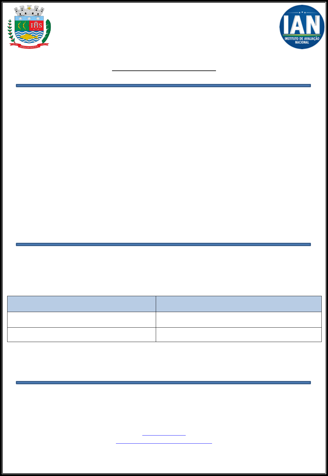 PREFEITURA MUNICIPAL DE MANGARATIBA Estado do Rio de Janeiro C0NCURSO PÚBLICO 01/2024 www.ian.org.br concursomangaratiba@ian.org.br Página 1 de 154 EDITAL DE ABERTURA Publicado em 16 agosto de 2024 A PREFEITURA MUNICIPAL DE MANGARATIBA, Estado do Rio de Janeiro, no uso de suas atribuições legais, considerando o disposto no Capítulo VII da Constituição Federal, considerando a Lei Orgânica do Município de Mangaratiba/RJ e demais legislações correlatas, TORNA PÚBLICO O EDITAL DE ABERTURA com as instruções e as regras referentes ao CONCURSO PÚBLICO 01/2024, para o preenchimento de 585 (QUINHENTAS E OITENTA E CINCO) VAGAS IMEDIATAS mais cadastro de reserva, distribuídas em diversos cargos de Nível Fundamental Incompleto (Alfabetizado), Nível Fundamental Completo, Nível Médio Completo, Nível Médio Técnico e Nível Superior Completo, do quadro permanente de pessoal DA SECRETARIA MUNICIPAL DE ADMINISTRAÇÃO, DA SECRETARIA MUNICIPAL DE SAÚDE E DA SECRETARIA MUNICIPAL DE EDUCAÇÃO, ESPORTES E LAZER. O Concurso Público de que trata este Edital será regido pela Constituição Federal, pela Lei Orgânica do Município de Mangaratiba/RJ, pela legislação pertinente em vigor, e pelas regras estabelecidas neste Edital de Abertura, seus anexos e suas eventuais retificações. EVENTO DATA Início das Inscrições 16 de agosto de 2024 Término das Inscrições 16 de setembro de 2024 http://www.ian.org.br/ PREFEITURA MUNICIPAL DE MANGARATIBA Estado do Rio de Janeiro C0NCURSO PÚBLICO 01/2024 www.ian.org.br concursomangaratiba@ian.org.br Página 2 de 154 ÍNDICE CAPÍTULO PÁGINA Cap. 1: Das Disposições Preliminares. 3 Cap. 2: Denominação do Cargo Público, Escolaridade Mínima Exigida, Requisitos Básicos, Vencimento Básico Mensal, Carga Horária Semanal e Total de Vagas Imediatas. 6 Cap. 3: Das Exigências Mínimas para a Investidura no Cargo. 22 Cap. 4: Das Inscrições. 24 Cap. 5: Das Regras Gerais para Pessoa com Deficiência. 32 Cap. 6: Do Atendimento Especial. 39 Cap. 7: Do Atendimento Especial à Lactante. 42 Cap. 8: Da Prova Objetiva. 46 Cap. 9: Da Prova de Títulos. 67 Cap. 10: Dos Critérios de Desempate e do Resultado Final do Concurso Público. 72 Cap. 11: Dos Recursos. 74 Cap. 12: Da Convocação e do Provimento. 76 Cap. 13: Das Disposições Finais. 78 Anexo I: Atribuições dos Cargos. 81 Anexo II: Cronograma Previsto. 117 Anexo III: Conteúdo Programático. 121 http://www.ian.org.br/ PREFEITURA MUNICIPAL DE MANGARATIBA Estado do Rio de Janeiro C0NCURSO PÚBLICO 01/2024 www.ian.org.br concursomangaratiba@ian.org.br Página 3 de 154 1.1. Este Edital de Abertura contém as cláusulas e as condições que regem o presente Concurso Público, em conformidade com a legislação pertinente em vigor. 1.2. O Concurso Público de que trata este Edital será organizado e executado pelo INSTITUTO DE AVALIAÇÃO NACIONAL, doravante denominado IAN, com endereço eletrônico em www.ian.org.br, e cujas atribuições mínimas são as seguintes: 1.2.1. Elaborar os editais de acordo com as normas pertinentes em vigor, observando inclusive as determinações e deliberações da Comissão Especial de Elaboração e Acompanhamento do Edital de Abertura do Concurso Público 01/2024. 1.2.1.1. A Prefeitura Municipal de Mangaratiba/RJ, através da Portaria nº 0695 de 28 de maio de 2024, nomeou a Comissão Especial de Elaboração e Acompanhamento do Edital de Abertura do Concurso Público 01/2024 para a fiscalização, o acompanhamento e o assessoramento nas diversas etapas do Concurso Público de que trata este Edital. 1.2.2. Assessorar na elaboração de editais, avisos, retificações, erratas, comunicados, portarias, decretos, os quais irão normatizar todas as fases do Concurso Público. 1.2.3. Dar publicidade a todos os atos referentes ao Concurso Público. 1.2.4. Disponibilizar e gerenciar sítio eletrônico do IAN para o recebimento das inscrições via internet, e demais procedimentos referentes ao Concurso Público, emitindo relatórios sempre que solicitado pela Prefeitura Municipal de Mangaratiba/RJ. 1.2.5. Elaborar as questões das provas, contratando profissionais altamente qualificados para compor a Banca de Professores. 1.2.6. Confeccionar os Cadernos de Questões e as Folhas de Respostas em unidades compatíveis com o número de candidatos. 1.2.7. Promover a criação, a impressão personalizada e a leitura das Folhas de Respostas. 1.2.7.1. O processo de leitura das Folhas de Respostas da Prova Objetiva será por meio de leitora óptica. 1.2.8. Transportar os malotes com os materiais do Concurso Público até os locais de destino, garantindo o sigilo e a segurança indispensáveis à lisura do certame. 1.2.9. Disponibilizar profissionais treinados para a aplicação das provas. CAPÍTULO 1: DAS DISPOSIÇÕES PRELIMINARES. http://www.ian.org.br/ http://www.ian.org.br/ PREFEITURA MUNICIPAL DE MANGARATIBA Estado do Rio de Janeiro C0NCURSO PÚBLICO 01/2024 www.ian.org.br concursomangaratiba@ian.org.br Página 4 de 154 1.2.10. Aplicar as provas em locais com infraestrutura adequada ao evento. 1.2.11. Disponibilizar, em seu site, os Cadernos de Questões acompanhados dos respectivos gabaritos, além das imagens das Folhas de Repostas, para a interposição de recursos. 1.2.12. Receber e pontuar os títulos enviados pelos candidatos. 1.2.13. Responder a todos os recursos previstos no item 11.1 deste Edital. 1.2.14. Publicar os resultados e classificações preliminar e final, por cargo público, em ordem decrescente de pontuação. 1.2.15. Encaminhar à Prefeitura Municipal de Mangaratiba/RJ toda a estrutura documental para a Homologação do Resultado Final do Concurso Público. 1.3. A elaboração, a aplicação e a correção das provas, em todas as fases, são de responsabilidade exclusiva do IAN, assim como os pareceres referentes aos recursos previstos no item 11.1 deste Edital. 1.4. Este Edital de Abertura foi PUBLICADO no Diário Oficial do Município de Mangaratiba
