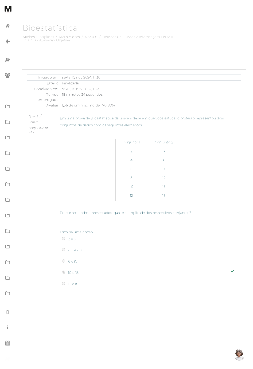 Minhas Disciplinas / Meus cursos / 422068 / Unidade 03 - Dados e Informações Parte II / UN 3 - Avaliação Objetiva Bioestatística Questão 1 Correto Atingiu 0,34 de 0,34 Iniciado em sexta, 15 nov 2024, 11:30 Estado Finalizada Concluída em sexta, 15 nov 2024, 11:49 Tempo empregado 18 minutos 34 segundos Avaliar 1,36 de um máximo de 1,70(80%) Em uma prova de Bioestatística da universidade em que você estuda, o professor apresentou dois conjuntos de dados com os seguintes elementos. Conjunto 1 Conjunto 2 2 3 4 6 6 9 8 12 10 15 12 18 Frente aos dados apresentados, qual é a amplitude dos respectivos conjuntos? Escolha uma opção: 2 e 3. - 15 e -10. 6 e 9. 10 e 15. 12 e 18. https://avap.multivix.edu.br/my/ https://avap.multivix.edu.br/course/view.php?id=29408 https://avap.multivix.edu.br/course/view.php?id=29408§ion=4 https://avap.multivix.edu.br/mod/quiz/view.php?id=1716658 https://avap.multivix.edu.br/my/ https://avap.multivix.edu.br/course/view.php?id=29408 https://avap.multivix.edu.br/user/index.php?id=29408 https://avap.multivix.edu.br/course/view.php?id=29408§ion=1 https://avap.multivix.edu.br/course/view.php?id=29408§ion=2 https://avap.multivix.edu.br/course/view.php?id=29408§ion=3 https://avap.multivix.edu.br/course/view.php?id=29408§ion=4 https://avap.multivix.edu.br/course/view.php?id=29408§ion=5 https://avap.multivix.edu.br/course/view.php?id=29408§ion=6 https://avap.multivix.edu.br/course/view.php?id=29408§ion=7 https://avap.multivix.edu.br/course/view.php?id=29408§ion=8 https://avap.multivix.edu.br/course/view.php?id=29408§ion=9 https://avap.multivix.edu.br/course/view.php?id=29408§ion=10 https://avap.multivix.edu.br/course/view.php?id=29408§ion=11 https://avap.multivix.edu.br/course/view.php?id=29408§ion=12 https://avap.multivix.edu.br/course/view.php?id=29408§ion=13 https://avap.multivix.edu.br/hooks/portal/ https://avap.multivix.edu.br/mod/page/view.php?id=1252%2F%22%20target%3D%22_blank https://avap.multivix.edu.br/calendar/view.php/ https://avap.multivix.edu.br/local/staticpage/view.php?page=biblioteca https://multivix.edu.br/office-365/ https://avap.multivix.edu.br/ Questão 2 Correto Atingiu 0,34 de 0,34 Em uma pesquisa de mercado relacionada à presença da cafeína em produtos industrializados, foram encontradas as seguintes concentrações por produto. Produto Medida (xícara) Cafeína (mg) Café expresso 1 100 Chá preto 2 35 Café �ltrado 2 80 Refrigerante de Cola 6 95 Energético 16 42 Analgésico 16 32 Baseando-se nesses níveis de cafeína, qual será a média aritmética por xícara da concentração de cafeína? Escolha uma opção: 95 mg. 2 mg. 43 mg. 384 mg. 8,93 mg. https://avap.multivix.edu.br/my/ https://avap.multivix.edu.br/course/view.php?id=29408 https://avap.multivix.edu.br/user/index.php?id=29408 https://avap.multivix.edu.br/course/view.php?id=29408§ion=1 https://avap.multivix.edu.br/course/view.php?id=29408§ion=2 https://avap.multivix.edu.br/course/view.php?id=29408§ion=3 https://avap.multivix.edu.br/course/view.php?id=29408§ion=4 https://avap.multivix.edu.br/course/view.php?id=29408§ion=5 https://avap.multivix.edu.br/course/view.php?id=29408§ion=6 https://avap.multivix.edu.br/course/view.php?id=29408§ion=7 https://avap.multivix.edu.br/course/view.php?id=29408§ion=8 https://avap.multivix.edu.br/course/view.php?id=29408§ion=9 https://avap.multivix.edu.br/course/view.php?id=29408§ion=10 https://avap.multivix.edu.br/course/view.php?id=29408§ion=11 https://avap.multivix.edu.br/course/view.php?id=29408§ion=12 https://avap.multivix.edu.br/course/view.php?id=29408§ion=13 https://avap.multivix.edu.br/hooks/portal/ https://avap.multivix.edu.br/mod/page/view.php?id=1252%2F%22%20target%3D%22_blank https://avap.multivix.edu.br/calendar/view.php/ https://avap.multivix.edu.br/local/staticpage/view.php?page=biblioteca https://multivix.edu.br/office-365/ Questão 3 Incorreto Atingiu 0,00 de 0,34 Questão 4 Correto Atingiu 0,34 de 0,34 Em uma experiência de pêndulo simples, em uma aula experimental de Mecânica, foram obtidos os seguintes dados relacionados ao período desse sistema físico. Período (em segundos) 2,43 s 2,45 s 2,42 s 2,45 s 2,40 s 2,41 s Seguindo o roteiro experimental, um dos questionamentos era sobre a soma dos desvios em relação à média dos dados. Qual será esse valor? Escolha uma opção: 0,10. 0,01. 0,02. 0. 0,05. Imagine que você foi contratado por uma grande empresa fomentadora de pesquisa cientí�ca. Uma das suas atribuições é analisar os dados coletados em determinado experimento cientí�co. Os dados foram coletados e organizados segunda o seguinte quadro. Dados coletado 19 32 27 14 5 Como início do tratamento estatístico, é imprescindível que você calcule a amplitude desse conjunto de dados. Qual valor você obterá? Escolha uma opção: 32. 10. 19. 27. 5. https://avap.multivix.edu.br/my/ https://avap.multivix.edu.br/course/view.php?id=29408 https://avap.multivix.edu.br/user/index.php?id=29408 https://avap.multivix.edu.br/course/view.php?id=29408§ion=1 https://avap.multivix.edu.br/course/view.php?id=29408§ion=2 https://avap.multivix.edu.br/course/view.php?id=29408§ion=3 https://avap.multivix.edu.br/course/view.php?id=29408§ion=4 https://avap.multivix.edu.br/course/view.php?id=29408§ion=5 https://avap.multivix.edu.br/course/view.php?id=29408§ion=6 https://avap.multivix.edu.br/course/view.php?id=29408§ion=7 https://avap.multivix.edu.br/course/view.php?id=29408§ion=8 https://avap.multivix.edu.br/course/view.php?id=29408§ion=9 https://avap.multivix.edu.br/course/view.php?id=29408§ion=10 https://avap.multivix.edu.br/course/view.php?id=29408§ion=11 https://avap.multivix.edu.br/course/view.php?id=29408§ion=12 https://avap.multivix.edu.br/course/view.php?id=29408§ion=13 https://avap.multivix.edu.br/hooks/portal/ https://avap.multivix.edu.br/mod/page/view.php?id=1252%2F%22%20target%3D%22_blank https://avap.multivix.edu.br/calendar/view.php/ https://avap.multivix.edu.br/local/stati