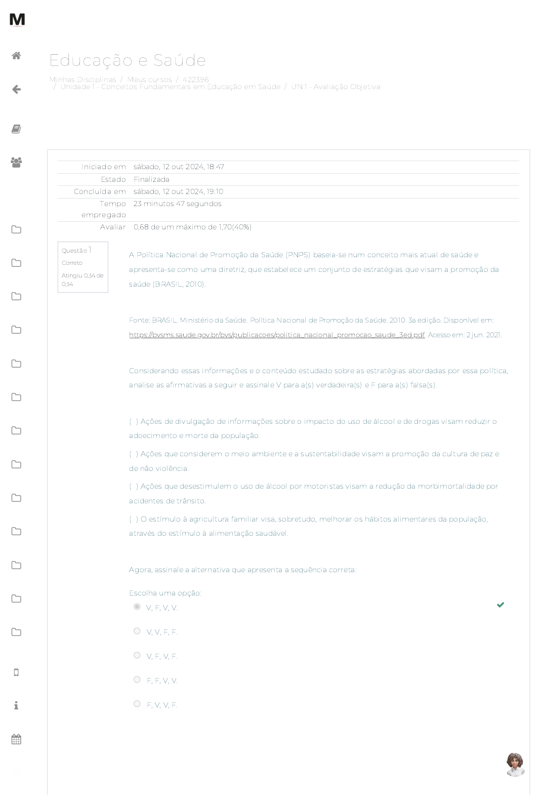 Minhas Disciplinas / Meus cursos / 422396 / Unidade 1 - Conceitos Fundamentais em Educação em Saúde / UN 1 - Avaliação Objetiva Educação e Saúde Questão 1 Correto Atingiu 0,34 de 0,34 Iniciado em sábado, 12 out 2024, 18:47 Estado Finalizada Concluída em sábado, 12 out 2024, 19:10 Tempo empregado 23 minutos 47 segundos Avaliar 0,68 de um máximo de 1,70(40%) A Política Nacional de Promoção da Saúde (PNPS) baseia-se num conceito mais atual de saúde e apresenta-se como uma diretriz, que estabelece um conjunto de estratégias que visam a promoção da saúde (BRASIL, 2010). Fonte: BRASIL. Ministério da Saúde. Política Nacional de Promoção da Saúde. 2010. 3a edição. Disponível em: https://bvsms.saude.gov.br/bvs/publicacoes/politica_nacional_promocao_saude_3ed.pdf. Acesso em: 2 jun. 2021. Considerando essas informações e o conteúdo estudado sobre as estratégias abordadas por essa política, analise as a�rmativas a seguir e assinale V para a(s) verdadeira(s) e F para a(s) falsa(s). ( ) Ações de divulgação de informações sobre o impacto do uso de álcool e de drogas visam reduzir o adoecimento e morte da população. ( ) Ações que considerem o meio ambiente e a sustentabilidade visam a promoção da cultura de paz e de não violência. ( ) Ações que desestimulem o uso de álcool por motoristas visam a redução da morbimortalidade por acidentes de trânsito. ( ) O estímulo à agricultura familiar visa, sobretudo, melhorar os hábitos alimentares da população, através do estímulo à alimentação saudável. Agora, assinale a alternativa que apresenta a sequência correta: Escolha uma opção: V, F, V, V. V, V, F, F. V, F, V, F. F, F, V, V. F, V, V, F. https://avap.multivix.edu.br/my/ https://avap.multivix.edu.br/course/view.php?id=29448 https://avap.multivix.edu.br/course/view.php?id=29448§ion=2 https://avap.multivix.edu.br/mod/quiz/view.php?id=1717417 https://bvsms.saude.gov.br/bvs/publicacoes/politica_nacional_promocao_saude_3ed.pdf https://avap.multivix.edu.br/my/ https://avap.multivix.edu.br/course/view.php?id=29448 https://avap.multivix.edu.br/user/index.php?id=29448 https://avap.multivix.edu.br/course/view.php?id=29448§ion=1 https://avap.multivix.edu.br/course/view.php?id=29448§ion=2 https://avap.multivix.edu.br/course/view.php?id=29448§ion=3 https://avap.multivix.edu.br/course/view.php?id=29448§ion=4 https://avap.multivix.edu.br/course/view.php?id=29448§ion=5 https://avap.multivix.edu.br/course/view.php?id=29448§ion=6 https://avap.multivix.edu.br/course/view.php?id=29448§ion=7 https://avap.multivix.edu.br/course/view.php?id=29448§ion=8 https://avap.multivix.edu.br/course/view.php?id=29448§ion=9 https://avap.multivix.edu.br/course/view.php?id=29448§ion=10 https://avap.multivix.edu.br/course/view.php?id=29448§ion=11 https://avap.multivix.edu.br/course/view.php?id=29448§ion=12 https://avap.multivix.edu.br/course/view.php?id=29448§ion=13 https://avap.multivix.edu.br/hooks/portal/ https://avap.multivix.edu.br/mod/page/view.php?id=1252%2F%22%20target%3D%22_blank https://avap.multivix.edu.br/calendar/view.php/ https://avap.multivix.edu.br/local/staticpage/view.php?page=biblioteca https://multivix.edu.br/office-365/ https://avap.multivix.edu.br/ Questão 2 Incorreto Atingiu 0,00 de 0,34 No decorrer dos anos, o conceito de saúde e doença se modi�cou, com base em contextos sociais, culturais, econômicos, dentre outros aspectos que afetaram o modo da população ver e entender a saúde e o aparecimento de doenças. Considerando essas informações e o conteúdo estudado sobre as teorias que levaram a formação de conceitos de saúde ao longo dos anos, analise as ferramentas a seguir e as associe a suas respectivas características: 1) Divindade 2) Miasmas 3) Microbiana 4) Multicausalidade ( ) A água, os locais de moradia e os ventos estão relacionados à saúde e à doença; a qual é transmitida por “gases” de dejetos e animais em decomposição. ( ) Desenvolvida por Luis Pasteur, esta teoria defende, sobretudo, que a maioria das doenças são causadas por microrganismos. ( ) Defende que as doenças eram causadas por castigos divinos e que a saúde é considerada uma dádiva de algumas pessoas. ( ) Defende que fatores individuais de diferentes aspectos estão relacionados com as condições de saúde das pessoas. Fonte: Elaborado pela autora (2021). Agora, assinale a alternativa que apresenta a sequência correta: a. 3, 4, 2, 1. b. 2, 3, 1, 4. c. 2, 1, 4, 3. d. 3, 4, 1, 2. e. 1, 4, 3, 2. https://avap.multivix.edu.br/my/ https://avap.multivix.edu.br/course/view.php?id=29448 https://avap.multivix.edu.br/user/index.php?id=29448 https://avap.multivix.edu.br/course/view.php?id=29448§ion=1 https://avap.multivix.edu.br/course/view.php?id=29448§ion=2 https://avap.multivix.edu.br/course/view.php?id=29448§ion=3 https://avap.multivix.edu.br/course/view.php?id=29448§ion=4 https://avap.multivix.edu.br/course/view.php?id=29448§ion=5 https://avap.multivix.edu.br/course/view.php?id=29448§ion=6 https://avap.multivix.edu.br/course/view.php?id=29448§ion=7 https://avap.multivix.edu.br/course/view.php?id=29448§ion=8 https://avap.multivix.edu.br/course/view.php?id=29448§ion=9 https://avap.multivix.edu.br/course/view.php?id=29448§ion=10 https://avap.multivix.edu.br/course/view.php?id=29448§ion=11 https://avap.multivix.edu.br/course/view.php?id=29448§ion=12 https://avap.multivix.edu.br/course/view.php?id=29448§ion=13 https://avap.multivix.edu.br/hooks/portal/ https://avap.multivix.edu.br/mod/page/view.php?id=1252%2F%22%20target%3D%22_blank https://avap.multivix.edu.br/calendar/view.php/ https://avap.multivix.edu.br/local/staticpage/view.php?page=biblioteca https://multivix.edu.br/office-365/ Questão 3 Incorreto Atingiu 0,00 de 0,34 Questão 4 Incorreto Atingiu 0,00 de 0,34 Historicamente, a educação em saúde, tanto no mundo como no Brasil, passou por diferentes fases e diferentes modelos de estruturação, com modelos de ação distin