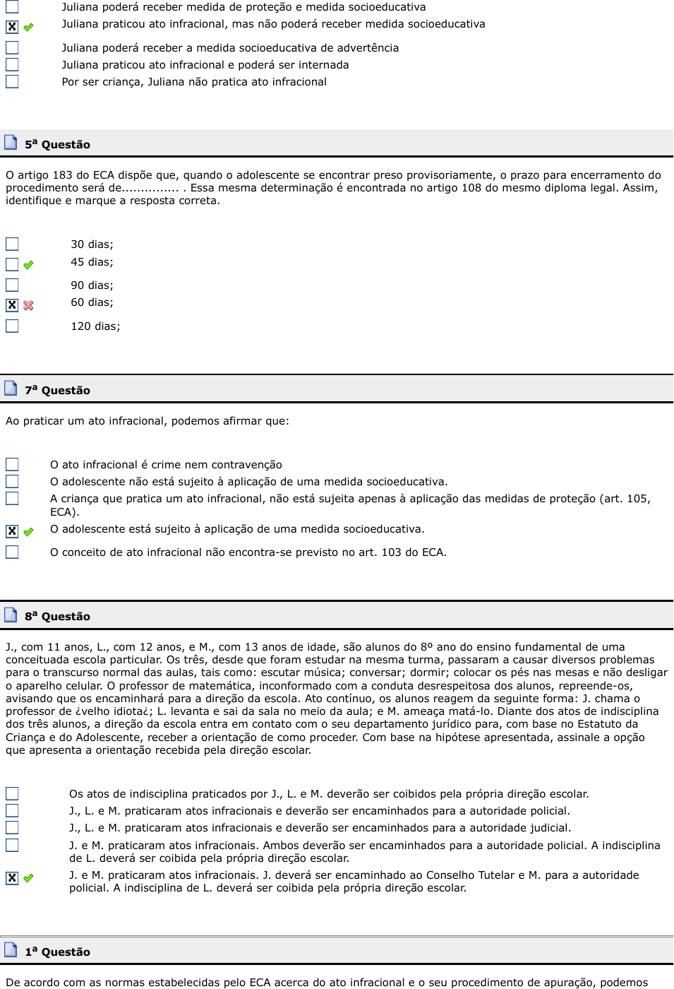Juliana poderá receber medida de proteção e medida socioeducativa Juliana praticou ato infracional, mas não poderá receber medida socioeducativa Juliana poderá receber a medida socioeducativa de advertência Juliana praticou ato infracional e poderá ser internada Por ser criança, Juliana não pratica ato infracional 5a Questão O artigo 183 do ECA dispõe que, quando o adolescente se encontrar preso provisoriamente, o prazo para encerramento do procedimento será de............... . Essa mesma determinação é encontrada no artigo 108 do mesmo diploma legal. Assim, identifique e marque a resposta correta. 30 dias; 45 dias; 90 dias; 60 dias; 120 dias; 7a Questão Ao praticar um ato infracional, podemos afirmar que: O ato infracional é crime nem contravenção O adolescente não está sujeito à aplicação de uma medida socioeducativa. A criança que pratica um ato infracional, não está sujeita apenas à aplicação das medidas de proteção (art. 105, ECA). O adolescente está sujeito à aplicação de uma medida socioeducativa. O conceito de ato infracional não encontra-se previsto no art. 103 do ECA. 8a Questão J., com 11 anos, L., com 12 anos, e M., com 13 anos de idade, são alunos do 8º ano do ensino fundamental de uma conceituada escola particular. Os três, desde que foram estudar na mesma turma, passaram a causar diversos problemas para o transcurso normal das aulas, tais como: escutar música; conversar; dormir; colocar os pés nas mesas e não desligar o aparelho celular. O professor de matemática, inconformado com a conduta desrespeitosa dos alunos, repreende-os, avisando que os encaminhará para a direção da escola. Ato contínuo, os alunos reagem da seguinte forma: J. chama o professor de ¿velho idiota¿; L. levanta e sai da sala no meio da aula; e M. ameaça matá-lo. Diante dos atos de indisciplina dos três alunos, a direção da escola entra em contato com o seu departamento jurídico para, com base no Estatuto da Criança e do Adolescente, receber a orientação de como proceder. Com base na hipótese apresentada, assinale a opção que apresenta a orientação recebida pela direção escolar. Os atos de indisciplina praticados por J., L. e M. deverão ser coibidos pela própria direção escolar. J., L. e M. praticaram atos infracionais e deverão ser encaminhados para a autoridade policial. J., L. e M. praticaram atos infracionais e deverão ser encaminhados para a autoridade judicial. J. e M. praticaram atos infracionais. Ambos deverão ser encaminhados para a autoridade policial. A indisciplina de L. deverá ser coibida pela própria direção escolar. J. e M. praticaram atos infracionais. J. deverá ser encaminhado ao Conselho Tutelar e M. para a autoridade policial. A indisciplina de L. deverá ser coibida pela própria direção escolar. 1a Questão De acordo com as normas estabelecidas pelo ECA acerca do ato infracional e o seu procedimento de apuração, podemos afirmar que: A medida socioeducativa não pode ser aplicada a criança que pratica ato infracional. Crianças não praticam ato infracional. o adolescente somente poderá receber medida de proteção A medida socioeducativa pode ser aplicada tanto a criança quanto ao adolescente que pratica ato infracional. a criança receberá medida de proteção e medida socioeducativa 2a Questão De acordo com o que dispõe o ECA acerca do procedimento de apuração do ato infracional, podemos afirmar que o adolescente somente poderá ser privado de sua liberdade nas seguintes condições: em flagrante de ato infracional ou por solicitação devidamente fundamentada do Conselho Tutelar. sob acusação de prática de crime, associada à inexistência de endereço fixo; em flagrante de ato infracional ou quando não for possível localizar seus pais ou responsável; sob acusação de prática de crime, quando cometido com grave ameaça física à vítima; em flagrante de ato infracional ou por ordem escrita e fundamentada da autoridade judiciária competente; 3a Questão Assinale a opção CORRETA em relação as normas de apuração de ato infracional previstas pelo ECA: Iniciado o procedimento, a concessão da remissão pela autoridade judiciária importará na suspensão ou extinção do processo. O adolescente apreendido por força de ordem judicial deverá ser, desde logo, encaminhado à autoridade policial competente. O MP e o Juiz da Infância e da Juventude podem conceder a remissão em qualquer fase do processo. O MP poderá conceder a remissão em qualquer fase do processo. Comparecendo ao estabelecimento policial um dos pais, ou representante legal do adolescente apreendido em flagrante de ato infracional, a autoridade policial deve liberar o adolescente, sem exceção, em garantia ao direito à convivência familiar do adolescente. 4a Questão Assinale a opção CORRETA, de acordo com as normas previstas no ECA acerca do ato infracional: Consiste na conduta descrita como crime ou contravenção penal, e somente pode ser praticado por adolescente. Consiste na conduta descrita como crime ou contravenção penal, podendo ser praticado por criança ou adolescente. Se praticado por adolescente, não cabe, em hipótese alguma, a aplicação de medida de proteção. Se praticado por pessoa menor de 12 anos importará na aplicação de medida específica de proteção, como, por exemplo, a advertência. Se praticado por criança ou adolescente importará na aplicação de medida socioeducativa. 5a Questão