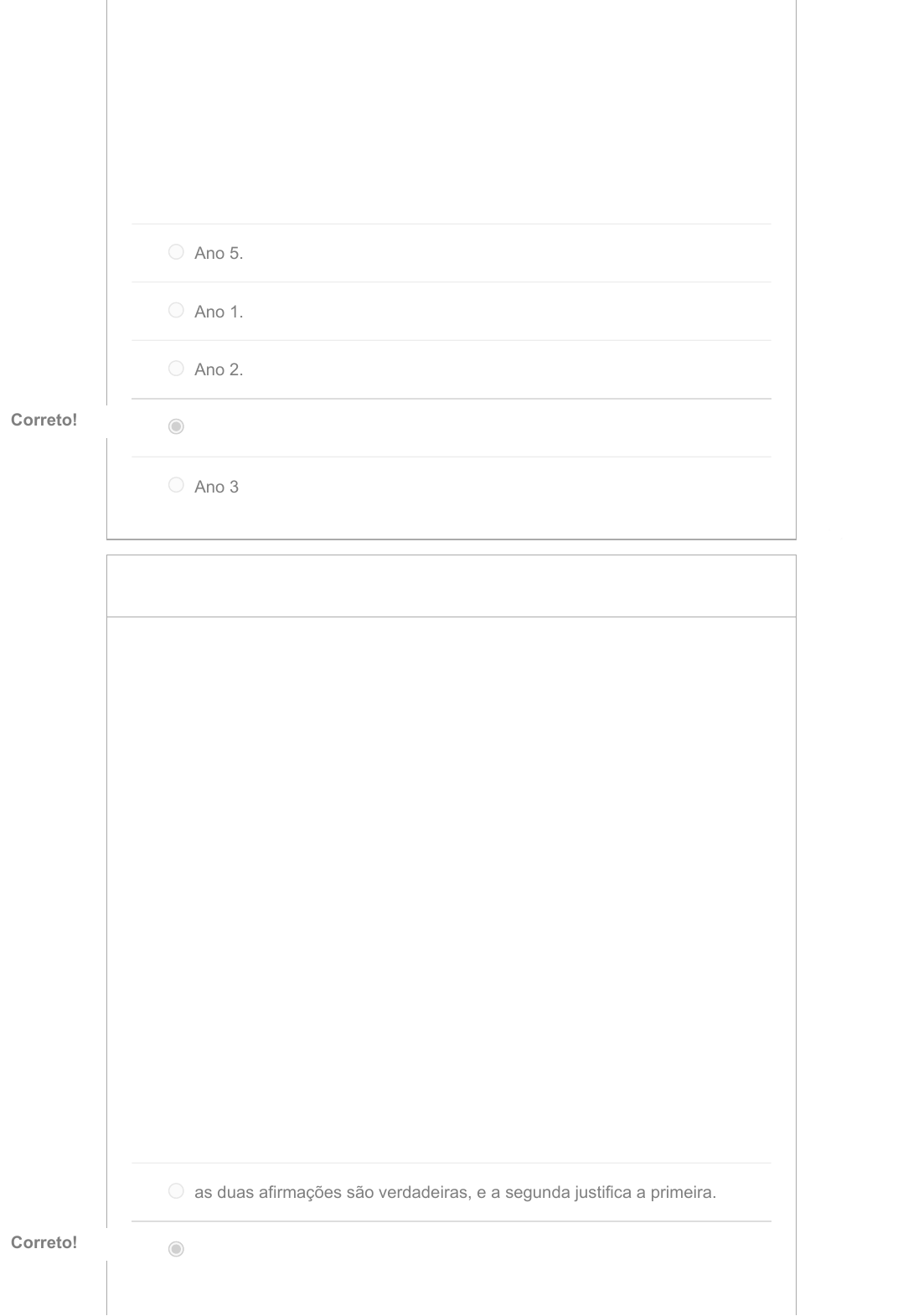 15/10/2023, 15:31 Prova Eletrônica: Eletiva B_P https://gruposeb.instructure.com/courses/16684/quizzes/37606 5/8 Posição de caixa -10.000 -5.000 20.000 50.000 80.000 Tendo em vista que o investimento inicial foi de R$ 30.000,00, quando ocorre o payback? Ano 5. Ano 1. Ano 2. Ano 4 Correto!Correto! Ano 3 3 / 3 ptsPergunta 7 Considere as duas afirmativas e a seguinte relação: Uma oportunidade de negócio é uma ideia. PORQUE Ao analisar uma oportunidade, o empreendedor deve considerar, dentre outras questões, o potencial e a participação de mercado. A respeito dessas duas afirmações, é CORRETO afirmar que: as duas afirmações são verdadeiras, e a segunda justifica a primeira. a primeira afirmação é falsa, e a segunda é verdadeira Correto!Correto! 15/10/2023, 15:31 Prova Eletrônica: Eletiva B_P https://gruposeb.instructure.com/courses/16684/quizzes/37606 6/8 a primeira afirmação é verdadeira, e a segunda é falsa. as duas afirmações são falsas. as duas afirmações são verdadeiras, e a segunda não justifica a primeira. 3 / 3 ptsPergunta 8 Adaptada do ENADE) No planejamento de um empreendimento, deve-se analisar sua viabilidade econômica e financeira, o que significa estimar e analisar as perspectivas de desempenho financeiro dos bens e/ou serviços que se pretende produzir e comercializar. Com base nessa condição, analise as afirmações e a relação entre elas: I. Para analisar o potencial de sucesso do empreendimento, deve-se realizar, dentre outras atividades, uma análise da viabilidade econômico- financeira. PORQUE II. Os principais indicadores de viabilidade econômico-financeira são: valor presente líquido (VPL), prazo de retorno do investimento (payback) e taxa interna de retorno (TIR). A respeito dessas asserções, assinale a opção correta: As asserções I e II são proposições falsas. As asserções I e II são proposições verdadeiras, e a II é uma justificativa da I. A asserção I é uma proposição verdadeira, e a II é uma proposição falsa. A asserção I é uma proposição falsa, e a II é uma proposição verdadeira.