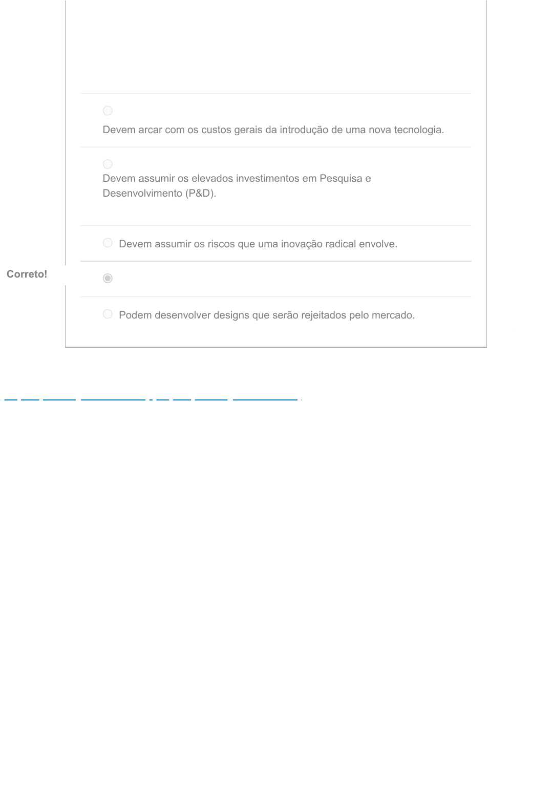 13/10/23, 13:07 Prova Eletrônica: Eletiva B_P https://dombosco.instructure.com/courses/16684/quizzes/37606 9/9 (https://portal.rybena.com.br) (https://portal.rybena.com.br) É uma desvantagem da estratégia de empresas que optam por seguir empresas inovadoras: Devem arcar com os custos gerais da introdução de uma nova tecnologia. Devem assumir os elevados investimentos em Pesquisa e Desenvolvimento (P&D). Devem assumir os riscos que uma inovação radical envolve. Acumulam recursos e capacitações críticas depois dos concorrentes. Correto!Correto! Podem desenvolver designs que serão rejeitados pelo mercado. Pontuação do teste: 30 de 30 https://portal.rybena.com.br/ https://portal.rybena.com.br/