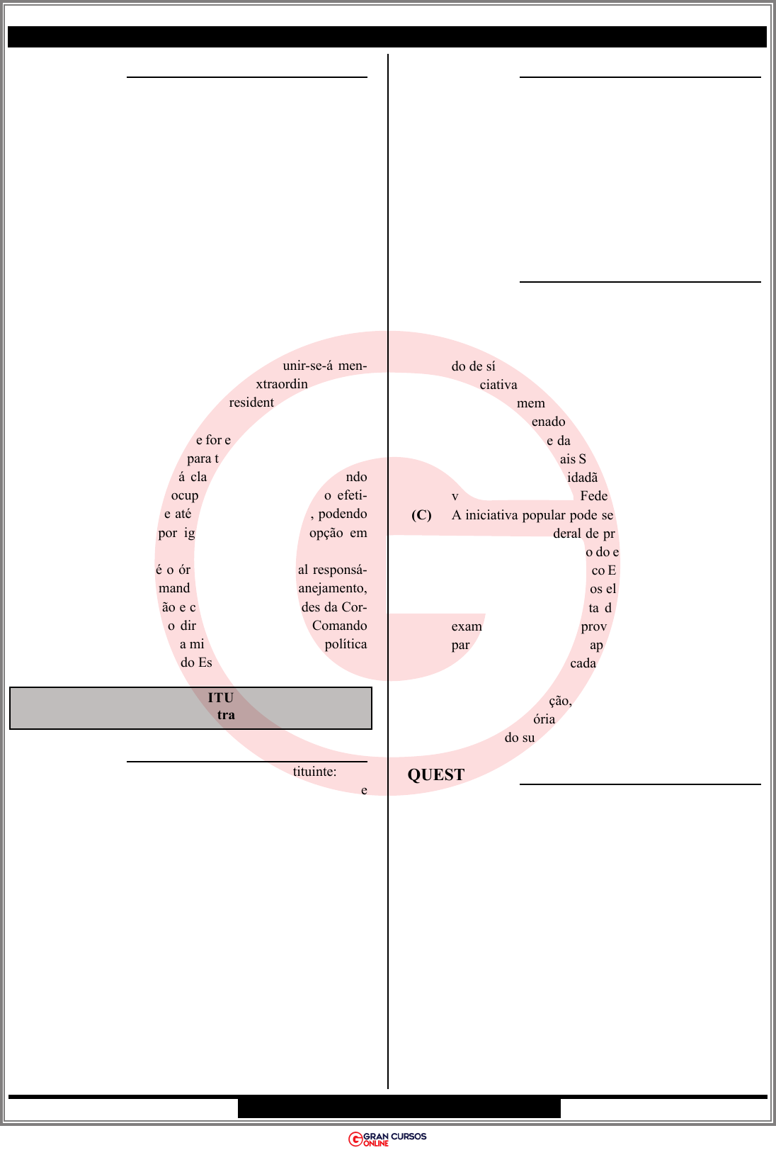 P R O V A O B J E T I V A OFICIALSIMULADO – PMPA PÁGINA 6 QUESTÃO 15 Com base na Lei Complementar n. 53/2006, que dispõe so- bre a organização básica e fixa o efetivo da Polícia Militar do Pará (PMPA) e dá outras providências, assinale a afirmação INCORRETA: (A) O Comandante-Geral é equiparado a Diretores de En- tidades Administrativas, fazendo jus às prerrogativas e honras de cargo de Secretário de Estado, sendo no- meado pelo Governador do Estado dentre os oficiais da ativa da Corporação, do último posto do Quadro de Oficiais Policiais Militares Combatentes, não convoca- do da reserva, possuidor do Curso Superior de Polícia, nos termos da legislação vigente. (B) O Alto Comando da Policia Militar é o órgão cole- giado, com atribuições deliberativas, normativas e consultivas. (C) O Alto Comando da Polícia Militar reunir-se-á men- salmente em caráter ordinário e, extraordinariamente, mediante convocação de seu presidente ou de um terço de seus membros. (D) O Comandante-Geral que for exonerado do cargo e não tiver tempo de serviço para transferência à inatividade, conforme a lei, ficará classificado no Alto Comando da Polícia Militar, ocupando vaga de membro efeti- vo, pelo período de até um ano ininterrupto, podendo ser reconduzido por igual período, salvo opção em contrário. (E) O Estado-Maior é o órgão de direção geral responsá- vel, perante o Comandante Geral, pelo planejamento, organização, direção e controle das atividades da Cor- poração, elaborando diretrizes e ordens de Comando em consonância com a missão institucional e a política de segurança pública do Estado. DIREITO CONSTITUCIONAL Luciano Dutra QUESTÃO 16 Assinale a alternativa correta sobre o Poder Constituinte: (A) De acordo com a doutrina majoritária, a possibilidade de o município de Belém editar a sua própria lei orgâni- ca provém do Poder Constituinte Derivado Decorrente. (B) O Poder Constituinte Derivado tem como característi- ca, dentre outras, ser limitado, pois sua obra é limitada por regras estabelecidas pelo Constituinte Originário. (C) O Poder capaz de criar uma nova realidade a partir da elaboração de uma Constituição Federal é chamado de Poder Constituinte Supranacional. (D) O Poder Constituinte Originário é político, extrajurídi- co, sem limites formais e esgotou-se com a promulga- ção da Constituição Federal. (E) A Constituição Federal pode ser modificada pela atu- ação de Poder Constituinte Derivado Decorrente, obe- decidas as normas nela inseridas pelo Poder Consti- tuinte Originário. QUESTÃO 17 Sempre que a falta de norma regulamentadora torne inviável o exercício dos direitos e liberdades constitucionais e das prerro- gativas inerentes à nacionalidade, à soberania e à cidadania, o prejudicado poderá ajuizar: (A) mandado de injunção. (B) mandado de segurança. (C) ação civil pública. (D) ação popular. (E) habeas data. QUESTÃO 18 Acerca das regras constitucionais federais sobre o processo le- gislativo, marque a alternativa errada: (A) A Constituição não poderá ser emendada na vigência de intervenção federal, de estado de defesa ou de esta- do de sítio. (B) A iniciativa das leis complementares e ordinárias cabe a qualquer membro ou Comissão da Câmara dos De- putados, do Senado Federal ou do Congresso Nacio- nal, ao Presidente da República, ao Supremo Tribunal Federal, aos Tribunais Superiores, ao Procurador-Geral da República e aos cidadãos, na forma e nos casos pre- vistos na Constituição Federal. (C) A iniciativa popular pode ser exercida pela apresenta- ção ao Senado Federal de projeto de lei subscrito por, no mínimo, um por cento do eleitorado nacional, distri- buído pelo menos por cinco Estados, com não menos de três décimos por cento dos eleitores de cada um deles. (D) Caberá à comissão mista de Deputados e Senadores examinar as medidas provisórias e sobre elas emitir parecer, antes de serem apreciadas, em sessão separa- da, pelo plenário de cada uma das Casas do Congres- so Nacional. (E) É vedada a reedição, na mesma sessão legislativa, de medida provisória que tenha sido rejeitada ou que te- nha perdido sua eficácia por decurso de prazo. QUESTÃO 19 Acerca das disposições gerais sobre o Poder Judiciário, mar- que a alternativa errada: (A) O Supremo Tribunal Federal, o Conselho Nacional de Justiça e os Tribunais Superiores têm sede na Capi- tal Federal. (B) Não será promovido o juiz que, injustificadamente, re- tiver autos em seu poder além do prazo legal, não po- dendo devolvê-los ao cartório sem o devido despacho ou decisão. (C) Todos os julgamentos dos órgãos do Poder Judiciário serão públicos, e fundamentadas todas as decisões, sob pena de nulidade, podendo a lei limitar a presença, em determinados atos, às próprias partes e a seus advoga- dos, ou somente a estes, em casos nos quais a preserva- ção do direito à intimidade do interessado no sigilo não prejudique o interesse público à informação.