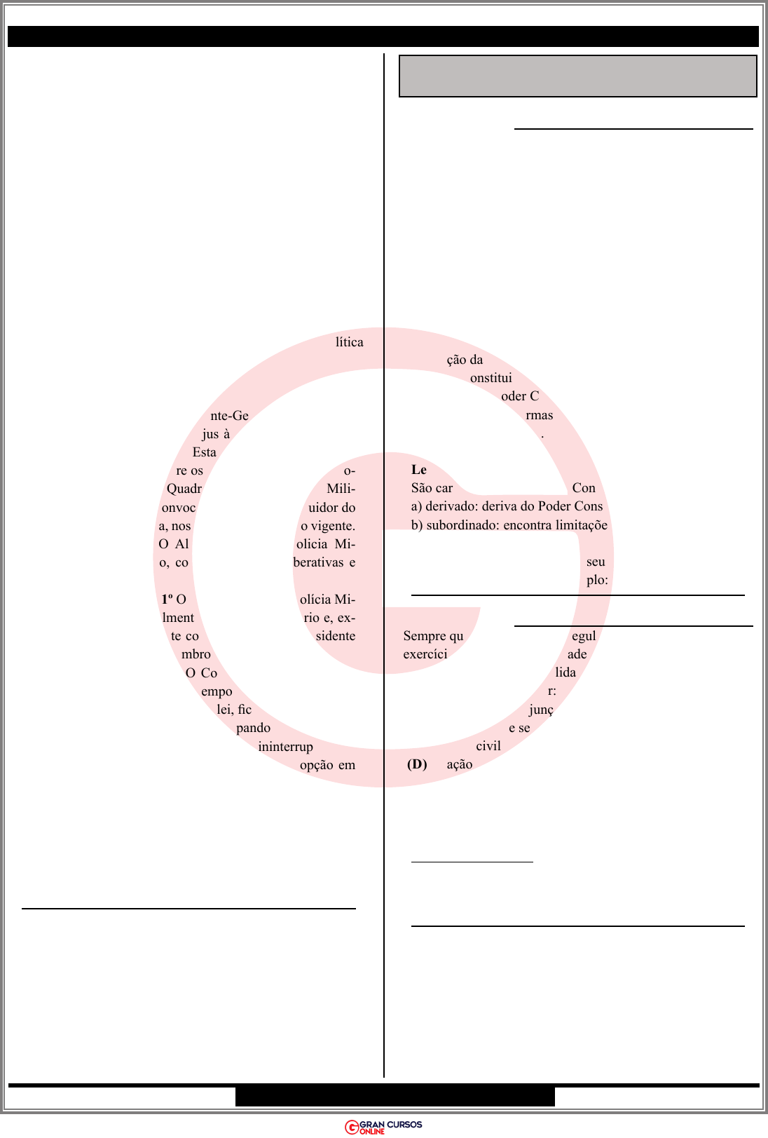 P R O V A O B J E T I V A OFICIALSIMULADO – PMPA PÁGINA 23 (C) O Alto Comando da Polícia Militar reunir-se-á men- salmente em caráter ordinário e, extraordinariamente, mediante convocação de seu presidente ou de um terço de seus membros. (D) O Comandante-Geral que for exonerado do cargo e não tiver tempo de serviço para transferência à inatividade, conforme a lei, ficará classificado no Alto Comando da Polícia Militar, ocupando vaga de membro efeti- vo, pelo período de até um ano ininterrupto, podendo ser reconduzido por igual período, salvo opção em contrário. (E) O Estado-Maior é o órgão de direção geral responsá- vel, perante o Comandante Geral, pelo planejamento, organização, direção e controle das atividades da Cor- poração, elaborando diretrizes e ordens de Comando em consonância com a missão institucional e a política de segurança pública do Estado. Letra e. (A) Errada. Art. 7° O Comandante-Geral é equiparado a Secretários de Estado, fazendo jus às prerrogativas e hon- ras de cargo de Secretário de Estado, sendo nomeado pelo Governador do Estado dentre os oficiais da ativa da Corpo- ração, do último posto do Quadro de Oficiais Policiais Mili- tares Combatentes, não convocado da reserva, possuidor do Curso Superior de Polícia, nos termos da legislação vigente. (B) Errada. Art. 8º-A O Alto Comando da Policia Mi- litar é o órgão colegiado, com atribuições deliberativas e consultivas. (C) Errada. Art. 8º-B, § 1º O Alto Comando da Polícia Mi- litar reunir-se-á semestralmente em caráter ordinário e, ex- traordinariamente, mediante convocação de seu presidente ou de dois terços de seus membros. (D) Errada. Art. 8º-B, § 4º O Comandante Geral que for exonerado do cargo e não tiver tempo de serviço para trans- ferência à inatividade, conforme a lei, ficará classificado no Alto Comando da Polícia Militar, ocupando vaga de mem- bro efetivo, pelo período de até dois anos ininterruptos, po- dendo ser reconduzido por igual período, salvo opção em contrário. (E) Certa. Art. 9º-A O Estado-Maior é o órgão de direção geral responsável, perante o Comandante Geral, pelo pla- nejamento, organização, direção e controle das atividades da Corporação, elaborando diretrizes e ordens de Comando em consonância com a missão institucional e a política de segurança pública do Estado. DIREITO CONSTITUCIONAL Luciano Dutra QUESTÃO 16 Assinale a alternativa correta sobre o Poder Constituinte: (A) De acordo com a doutrina majoritária, a possibilidade de o município de Belém editar a sua própria lei orgâni- ca provém do Poder Constituinte Derivado Decorrente. (B) O Poder Constituinte Derivado tem como característi- ca, dentre outras, ser limitado, pois sua obra é limitada por regras estabelecidas pelo Constituinte Originário. (C) O Poder capaz de criar uma nova realidade a partir da elaboração de uma Constituição Federal é chamado de Poder Constituinte Supranacional. (D) O Poder Constituinte Originário é político, extrajurídi- co, sem limites formais e esgotou-se com a promulga- ção da Constituição Federal. (E) A Constituição Federal pode ser modificada pela atu- ação de Poder Constituinte Derivado Decorrente, obe- decidas as normas nela inseridas pelo Poder Consti- tuinte Originário. Letra b. São características do Poder Constituinte Derivado: a) derivado: deriva do Poder Constituinte originário; b) subordinado: encontra limitações no texto constitucional (exemplo: cláusulas pétreas); c) condicionado (ou limitado): seu exercício deve obedecer às regras constitucionais (exemplo: art. 60). QUESTÃO 17 Sempre que a falta de norma regulamentadora torne inviável o exercício dos direitos e liberdades constitucionais e das prerro- gativas inerentes à nacionalidade, à soberania e à cidadania, o prejudicado poderá ajuizar: (A) mandado de injunção. (B) mandado de segurança. (C) ação civil pública. (D) ação popular. (E) habeas data. Letra a. Segundo o art. 5º, inc. LXXI, da CF/1988, conceder-se-á mandado de injunção sempre que a falta de norma regula- mentadora torne inviável o exercício dos direitos e liberda- des constitucionais e das prerrogativas inerentes à naciona- lidade, à soberania e à cidadania.