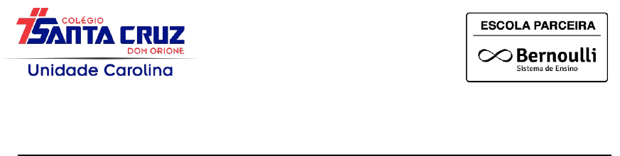 Cronograma das Avaliações Mensais 2° ano ➢ Dia 28/10, Segunda-feira Avaliação Mensal de Língua Portuguesa - Capítulo 7 – Olha quem está falando! • Gênero textual - Textos dialogados páginas 40, 41, 48 e 49. • Partes de um texto dialogado, página 52. • Estudo da escrita, página 61. • Estudo da língua Feminino e Masculino páginas 64, 65. • Diminutivo e Aumentativo páginas 87. ➢ Dia 29/10, Terça-feira Avaliação Mensal de Geografia - Capítulo 6 – Por dentro da escola. • Convivendo na escola página 30. • Escola: Lugar de Aprender e ser Feliz, páginas 34. • Espaços de uma escola, página 38. • A sala de aula, página 42. • Observando os objetos da sala de aula, página 45. ➢ Dia 30/10, Quarta-feira Avaliação Mensal de Ciências - Capítulo 6 – Luz do Sol • Sombra, páginas 32, 35, 36. • O Caminho do Sol, páginas 38 e 39. • Tomando Sol, páginas 46, 47, 48 e 49. ➢ Dia 31/10, Quinta-feira Avaliação Mensal de Língua Inglesa - Capítulo 6 – My Food ➢ Dia 01/11, Sexta-feira Avaliação Mensal de Matemática - Capítulo 7 – Matemática na medida certa • Medindo comprimento, página 42. • O milímetro, o centímetro e o metrô páginas 44. • Instrumento de medidas convencionais, página 45. • Aprofundando o estudo da centena, páginas 50, 51, 52 e 53. • Calculando dobros, página 86. • Calculando triplos, páginas 89. • Estudar as atividades no caderno. ➢ Dia 04/11, Segunda-feira Avaliação Mensal de História - Capítulo 6 – Diferentes escolas, diferentes histórias. • A escola e a passagem do tempo, páginas 32 e 33. • Diferentes escolas brasileiros, páginas 38, 39. • A história das escolas e suas fontes, páginas 41. Bons Estudos! image1.png image2.png