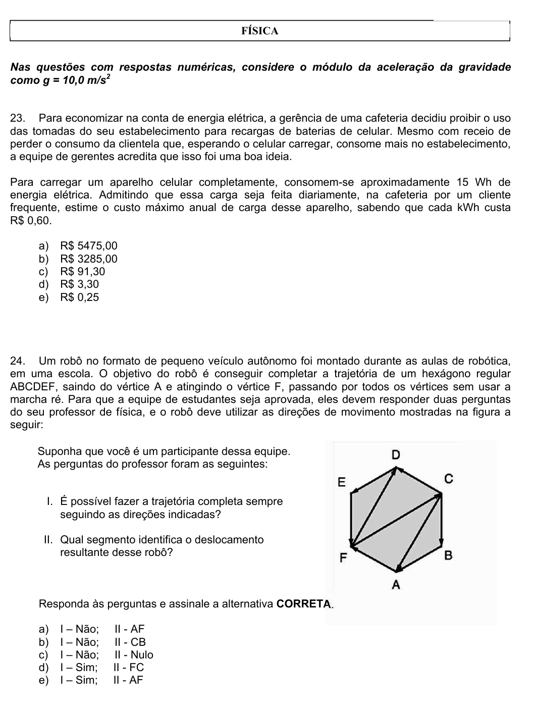 SSA – 1ª Fase 1º Dia Página 16 Nas questões com respostas numéricas, considere o módulo da aceleração da gravidade como g = 10,0 m/s2 23. Para economizar na conta de energia elétrica, a gerência de uma cafeteria decidiu proibir o uso das tomadas do seu estabelecimento para recargas de baterias de celular. Mesmo com receio de perder o consumo da clientela que, esperando o celular carregar, consome mais no estabelecimento, a equipe de gerentes acredita que isso foi uma boa ideia. Para carregar um aparelho celular completamente, consomem-se aproximadamente 15 Wh de energia elétrica. Admitindo que essa carga seja feita diariamente, na cafeteria por um cliente frequente, estime o custo máximo anual de carga desse aparelho, sabendo que cada kWh custa R$ 0,60. a) R$ 5475,00 b) R$ 3285,00 c) R$ 91,30 d) R$ 3,30 e) R$ 0,25 24. Um robô no formato de pequeno veículo autônomo foi montado durante as aulas de robótica, em uma escola. O objetivo do robô é conseguir completar a trajetória de um hexágono regular ABCDEF, saindo do vértice A e atingindo o vértice F, passando por todos os vértices sem usar a marcha ré. Para que a equipe de estudantes seja aprovada, eles devem responder duas perguntas do seu professor de física, e o robô deve utilizar as direções de movimento mostradas na figura a seguir: I. É possível fazer a trajetória completa sempre seguindo as direções indicadas? II. Qual segmento identifica o deslocamento resultante desse robô? Responda às perguntas e assinale a alternativa CORRETA. a) I – Não; II - AF b) I – Não; II - CB c) I – Não; II - Nulo d) I – Sim; II - FC e) I – Sim; II - AF FÍSICA Suponha que você é um participante dessa equipe. As perguntas do professor foram as seguintes: SSA – 1ª Fase 1º Dia Página 28 39. Sobre o conhecimento mitológico, atente ao texto a seguir: Sobre esse aspecto do conhecimento mitológico, é CORRETO afirmar que a) a função do mito é obscura, e o discurso a ele referente, pronunciado pela autoridade, está fundado na realidade e não explica a existência. b) o mito retrata um tipo de compreensão não significativa, possibilitando ao homem viver e lutar contra tudo o que lhe é contraditório. c) na narrativa mitológica, proferida para os ouvintes, está presente o puro delírio da fantasia e a confiabilidade na pessoa do narrador. d) a narrativa do mito é baseada na lógica da abstração e deixa, à margem, o desejo de dominação do mundo. e) o mito revela alguma coisa que é aceita sem contestação nem questionamento. Trata-se, portanto, de uma primeira narrativa que atribui sentido ao mundo. 40. Sobre a ‘condição humana’, atente ao texto a seguir: Há grande abismo entre o comportamento dos animais e o dos seres humanos. Mesmo o chimpanzé mais evoluído apresenta, apenas, rudimentos do raciocínio, que permitiriam a construção da linguagem simbólica e de tudo o que dela resulta. COTRIM, Gilberto. Fundamentos da Filosofia, 2002, p. 12. FILOSOFIA cultura.culturamix.com Para os gregos, mito é um discurso pronunciado ou proferido para ouvintes que recebem como verdadeira a narrativa, porque confiam naquele que narra; é uma narrativa feita em público, baseada, portanto, na autoridade e confiabilidade da pessoa do narrador. (CHAUÍ, Marilena. Convite à Filosofia, 1996, p. 28). SSA – 1ª Fase 1º Dia Página 29 Com base no texto de Cotrim, analise as afirmativas a seguir: I. O ser humano já nasce pronto, de acordo com a natureza. A linguagem simbólica é secundária na sua evolução. II. A dimensão subjetiva é significativa na ação do homem sobre a natureza. III. A linguagem é característica básica dos seres humanos com uma função específica na comunicação, embora não exprima pensamentos e raciocínios evidentes. IV. À condição humana é dada uma abertura para criar novas ferramentas e objetos com o intuito de satisfazer as necessidades existenciais do homem. Estão CORRETAS, apenas, a) I, III e IV. b) II e IV. c) I, II e IV. d) I e III. e) III e IV. 41. Sobre a gênese da filosofia entre os gregos, observe o texto a seguir: Seja como termo, seja como conceito, a filosofia é considerada pela quase totalidade dos estudiosos como uma criação própria do gênio dos gregos. Quem não levar isso em conta não poderá compreender por que, sob o impulso dos gregos, a civilização ocidental tomou uma direção completamente diferente da oriental. (ANTISERI, Dario e RELAE, Giovanni. História da Filosofia, 1990, p. 11). Sobre a gênese do pensamento filosófico entre os gregos, é CORRETO afirmar que a) a experiência concreta da racionalidade estava isenta da vida política na Pólis Grega. b) a prática político-democrática, atrelada ao enfoque irracional da vida em sociedade, foi o terreno fértil para a gênese do pensamento filosófico. c) sob o impulso dos gregos, a dimensão racional se impõe como critério de verdade. A filosofia é fruto desse projeto da razão. d) a filosofia é fruto do momento cultural em que a sensibilidade e a fantasia impõem-se sobre a razão. e) na gênese do pensamento filosófico grego, na civilização ocidental, a forma de sabedoria que se sobrepunha à ciência filosófica, eram as convicções religiosas fundamentadas na razão pura. 42. Atente ao texto a seguir: Sobre o pensamento grego Disponível em: http://www.google.com.br Apesar de a filosofia possuir data e local de nascimento, suas origens não são um fato simples, mas, objeto de controvérsias (o que, aliás, é muito próprio da filosofia). A causa da controvérsia é, justamente, o conteúdo da filosofia nascente, isto é, a cosmologia. CHAUÍ, Marilena. Introdução à História da Filosofia, 1994. SSA – 1ª Fase 1º Dia Página 30 No tocante ao pensamento grego, assinale a alternativa CORRETA. a) O pensamento grego, no enfoque da filosofia, é a expressão máxima da racionalidade no trato com o conhecimento. b) No pensamento grego, a singularidade da f