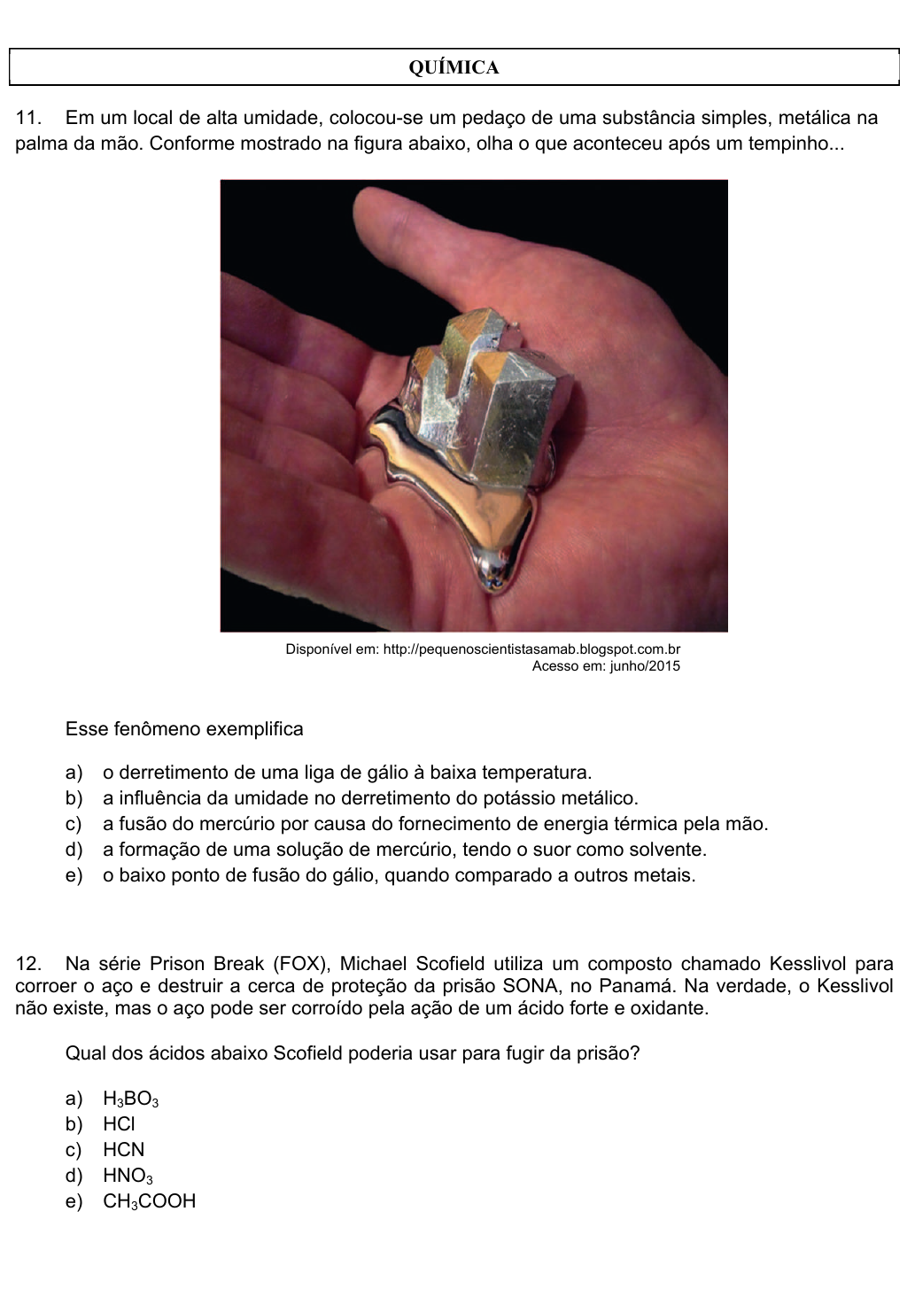 SSA – 1ª Fase 2º Dia Página 9 11. Em um local de alta umidade, colocou-se um pedaço de uma substância simples, metálica na palma da mão. Conforme mostrado na figura abaixo, olha o que aconteceu após um tempinho... Disponível em: http://pequenoscientistasamab.blogspot.com.br Acesso em: junho/2015 Esse fenômeno exemplifica a) o derretimento de uma liga de gálio à baixa temperatura. b) a influência da umidade no derretimento do potássio metálico. c) a fusão do mercúrio por causa do fornecimento de energia térmica pela mão. d) a formação de uma solução de mercúrio, tendo o suor como solvente. e) o baixo ponto de fusão do gálio, quando comparado a outros metais. 12. Na série Prison Break (FOX), Michael Scofield utiliza um composto chamado Kesslivol para corroer o aço e destruir a cerca de proteção da prisão SONA, no Panamá. Na verdade, o Kesslivol não existe, mas o aço pode ser corroído pela ação de um ácido forte e oxidante. Qual dos ácidos abaixo Scofield poderia usar para fugir da prisão? a) H3BO3 b) HCl c) HCN d) HNO3 e) CH3COOH QUÍMICA SSA – 1ª Fase 2º Dia Página 10 13. Uma mistura de alumínio e iodo foi colocada em um tubo de ensaio. Depois, foi transferido um pouco de água para a vidraria. Houve a produção de muito calor, de uma fumaça violeta e de uma intensa luminescência branca, conforme mostra a figura ao lado. Quando misturados, o iodo e o alumínio reagem. No caso da água, apesar de não participar dessa reação, aumenta a sua velocidade. No fenômeno ilustrado, a) um dos reagentes é uma substância iônica. b) a cor da luz produzida é a mesma para a queima dos demais metais. c) a reação química entre o iodo e o alumínio produz o carbonato de alumínio. d) a fumaça violeta contém iodo, pois o calor liberado na reação faz com que parte do I2 destile. e) a luminescência branca é produzida a partir da emissão de energia, na forma de luz, por elétrons excitados, que voltam para níveis de energia menos energéticos de átomos de alumínio. Disponível em: http://misteriosdomundo.org/18/ Acesso em: junho 2015 14. A fabricação de determinadas moedas exige o uso de níquel com elevada pureza. Para obtê-lo, pode-se utilizar o processo Mond. Desenvolvido por Ludwig Mond, em 1899, consiste inicialmente no aquecimento do óxido de níquel, produzindo níquel metálico, que deve ser purificado. Numa segunda etapa, o níquel impuro é colocado em uma atmosfera de monóxido de carbono, a uma temperatura de cerca de 50oC e pressão de 1 atm, formando um composto volátil e altamente inflamável, chamado tetracarbonilníquel, de acordo com a equação química: As impurezas permanecem em estado sólido, e o níquel pode ser recuperado, posteriormente, pela decomposição desse gás, que ocorre a 240oC. Uma fábrica produz 314 kg de moedas de níquel puro por semana, a partir de 400 kg de níquel impuro. Qual a massa aproximada de monóxido de carbono, usada semanalmente, por essa fábrica? a) 300 Kg b) 375 Kg c) 450 Kg d) 600 Kg e) 760 Kg Dados: Massas molares: C = 12 g/mol; O = 16 g/mol; Ni = 58,7 g/mol , → SSA – 1ª Fase 2º Dia Página 11 15. Analise a seguinte charge: Disponível em: http://hquimica.webnode.com.br/ Acesso em: junho/2015 As estudantes Eugênia e Lolita estão falando, respectivamente, sobre os modelos atômicos de a) Dalton e Thomson. b) Dalton e Rutherford-Bohr. c) Thomson e Rutherford-Bohr. d) Modelo Quântico e Thomson. e) Rutherford-Bohr e Modelo Quântico. 16. Um pedreiro descascou uma coluna que apresentava desgaste e deixou parte das ferragens livres de concreto. Em seguida, aplicou uma solução aquosa de ácido fosfórico (a 90%) para remover a ferrugem (Fe2O3) existente. Após um borbulhamento no local, verificou-se a formação de uma camada preta recobrindo a superfície do metal. A substância presente na camada preta é a) iônica. b) metálica. c) diatômica. d) covalente polar. e) covalente apolar. 17. A análise de amostras de uma mercadoria apreendida por causa de sonegação fiscal indicou os principais constituintes químicos: cal (CaO), sílica (SiO2), alumina (Al2O3) e óxido de ferro (Fe2O3). Além disso, também foram detectadas certa quantidade de magnésia (MgO) e uma pequena porcentagem de anidrido sulfúrico (SO3). De acordo com essas características, como é comercializada a mercadoria em questão? a) Areia lavada b) Cimento c) Desengordurante d) Fertilizante e) Gesso Não, Eugênia, É uma cebola. SSA – 1ª Fase 2º Dia Página 12 18. As imagens abaixo foram capturadas de um vídeo que mostra a transformação de um bloco de estanho branco (metálico) sob a influência da redução da temperatura ambiente. Quando a temperatura cai para menos de 13 oC, o estanho branco torna-se uma versão mais frágil, o estanho cinzento (p.f. = 13 oC). No estanho branco, a ligação é um misto de ligação metálica e covalente, e a estrutura cristalina é tetragonal de corpo centrado. Por sua vez, o estanho cinzento possui estrutura cristalina cúbica e é um semicondutor. Disponível em: http://www.cienciadosmateriais.org/Acesso em: junho 2015. (Adaptado) Esse fenômeno exemplifica a) recristalizações do Sn. b) duas formas alotrópicas do Sn. c) reações entre átomos de metais diferentes. d) propriedades de elementos químicos distintos. e) transformação de uma substância molecular iônica. 19. Militar, marinheiro e minerador inglês, Martin Frobisher afirmou ter encontrado ouro na Ilha de Baffin, região norte do Canadá, em 1576. Ao retornar à Inglaterra, carregando navios com 200 toneladas de um material, que acreditava ser minério de ouro, descobriu que havia levado 200 toneladas de pirita, dissulfeto de ferro. Também conhecida como “ouro dos trouxas” ou "ouro dos tolos", a pirita não é maleável e comumente aparece na forma de belos cristais. Frágil, ela exala um gás venenoso quando é aquecida. Um aspecto contributivo para Martin Frobisher lotar os porões 