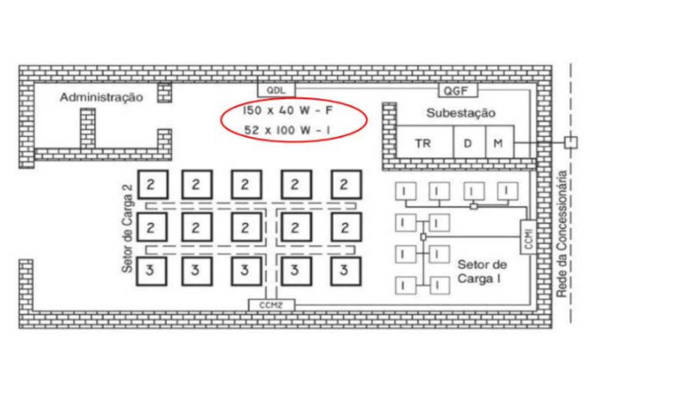 Determine a demanda do QGF, QDL, CCM1, CCM2 e a potência do transformador da subestação. Considerar F lâmpadas fluorescentes FP= 0,4 e Fm=1,8, fator de multiplicação de perdas e harmônicas, I= lâmpadas incandescentes. Todos motores de indução, rotor gaiola, IV polos. Definido a demanda, calcular o fator de demanda desta indústria. Legenda : 1- Motores de 75 cv, 2- Motores de 30, 3- Motores de 50 cv