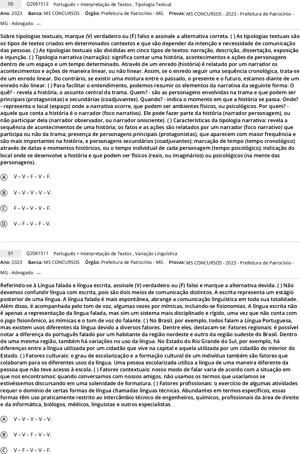 Ano: 2023 Banca: MS CONCURSOS Órgão: Prefeitura de Patrocínio - MG Sobre tipologias textuais, marque (V) verdadeiro ou (F) falso e assinale a alternativa correta. ( ) As tipologias textuais são os tipos de textos criados em determinados contextos e que vão depender da intenção e necessidade de comunicação das pessoas. ( ) As tipologias textuais são divididas em cinco tipos de textos: narração, descrição, dissertação, exposição e injunção. ( ) Tipologia narrativa (narração): signi�ca contar uma história, acontecimentos e ações de personagens dentro de um espaço e um tempo determinado. Através de um enredo (história) é relatado por um narrador os acontecimentos e ações de maneira linear, ou não linear. Assim, se o enredo seguir uma sequência cronológica, trata-se de um enredo linear. Do contrário, se existir uma mistura entre o passado, o presente e o futuro, estamos diante de um enredo não linear. ( ) Para facilitar o entendimento, podemos resumir os elementos da narrativa da seguinte forma: O quê? - revela a história, o assunto central da trama. Quem? - são as personagens envolvidas na trama e que podem ser principais (protagonistas) e secundárias (coadjuvantes). Quando? - indica o momento em que a história se passa. Onde? - representa o local (espaço) onde a narrativa ocorre, que podem ser ambientes físicos, ou psicológicos. Por quem? - aquele que conta a história é o narrador (foco narrativo). Ele pode fazer parte da história (narrador personagem), ou não participar dela (narrador observador, ou narrador onisciente). ( ) Características da tipologia narrativa: revela a sequência de acontecimentos de uma história; os fatos e as ações são relatados por um narrador (foco narrativo) que participa ou não da trama; presença de personagens principais (protagonistas), que aparecem com maior frequência e são mais importantes na história, e personagens secundários (coadjuvantes); marcação de tempo (tempo cronológico) através de datas e momentos históricos, ou o tempo individual de cada personagem (tempo psicológico); indicação do local onde se desenvolve a história e que podem ser físicos (reais, ou imaginários) ou psicológicos (na mente das personagens). A V – V – F – V – F. B V – V – V – V – V. C F – V – V – V – F. D V – F – V – F – V. Ano: 2023 Banca: MS CONCURSOS Órgão: Prefeitura de Patrocínio - MG Referindo-se à Língua falada e língua escrita, assinale (V) verdadeiro ou (F) falso e marque a alternativa devida. ( ) Não devemos confundir língua com escrita, pois são dois meios de comunicação distintos. A escrita representa um estágio posterior de uma língua. A língua falada é mais espontânea, abrange a comunicação linguística em toda sua totalidade. Além disso, é acompanhada pelo tom de voz, algumas vezes por mímicas, incluindo-se �sionomias. A língua escrita não é apenas a representação da língua falada, mas sim um sistema mais disciplinado e rígido, uma vez que não conta com o jogo �sionômico, as mímicas e o tom de voz do falante. ( ) No Brasil, por exemplo, todos falam a Língua Portuguesa, mas existem usos diferentes da língua devido a diversos fatores. Dentre eles, destacam-se: Fatores regionais: é possível notar a diferença do português falado por um habitante da região nordeste e outro da região sudeste do Brasil. Dentro de uma mesma região, também há variações no uso da língua. No Estado do Rio Grande do Sul, por exemplo, há diferenças entre a língua utilizada por um cidadão que vive na capital e aquela utilizada por um cidadão do interior do Estado. ( ) Fatores culturais: o grau de escolarização e a formação cultural de um indivíduo também são fatores que colaboram para os diferentes usos da língua. Uma pessoa escolarizada utiliza a língua de uma maneira diferente da pessoa que não teve acesso à escola. ( ) Fatores contextuais: nosso modo de falar varia de acordo com a situação em que nos encontramos: quando conversamos com nossos amigos, não usamos os termos que usaríamos se estivéssemos discursando em uma solenidade de formatura. ( ) Fatores pro�ssionais: o exercício de algumas atividades requer o domínio de certas formas de língua chamadas línguas técnicas. Abundantes em termos especí�cos, essas formas têm uso praticamente restrito ao intercâmbio técnico de engenheiros, químicos, pro�ssionais da área de direito e da informática, biólogos, médicos, linguistas e outros especialistas. A V – V – V – V – V. B V – V – F – V – V. C V – F – V – V – F. 50 Q2061512 >Português Interpretação de Textos , Tipologia Textual Provas: MS CONCURSOS - 2023 - Prefeitura de Patrocínio - MG - Advogado ... 51 Q2061511 >Português Interpretação de Textos , Variação Linguística Provas: MS CONCURSOS - 2023 - Prefeitura de Patrocínio - MG - Advogado ... https://www.qconcursos.com/questoes-de-concursos/bancas/ms-concursos https://www.qconcursos.com/questoes-de-concursos/institutos/prefeitura-de-patrocinio-mg https://www.qconcursos.com/questoes-de-concursos/bancas/ms-concursos https://www.qconcursos.com/questoes-de-concursos/institutos/prefeitura-de-patrocinio-mg https://www.qconcursos.com/questoes-de-concursos/questoes/345584a7-a0 https://www.qconcursos.com/questoes-de-concursos/disciplinas/letras-portugues https://www.qconcursos.com/questoes-de-concursos/disciplinas/letras-portugues/interpretacao-de-textos https://www.qconcursos.com/questoes-de-concursos/disciplinas/letras-portugues/tipologia-textual https://www.qconcursos.com/questoes-de-concursos/provas/ms-concursos-2023-prefeitura-de-patrocinio-mg-advogado https://www.qconcursos.com/questoes-de-concursos/questoes/34537d25-a0 https://www.qconcursos.com/questoes-de-concursos/disciplinas/letras-portugues https://www.qconcursos.com/questoes-de-concursos/disciplinas/letras-portugues/interpretacao-de-textos https://www.qconcursos.com/
