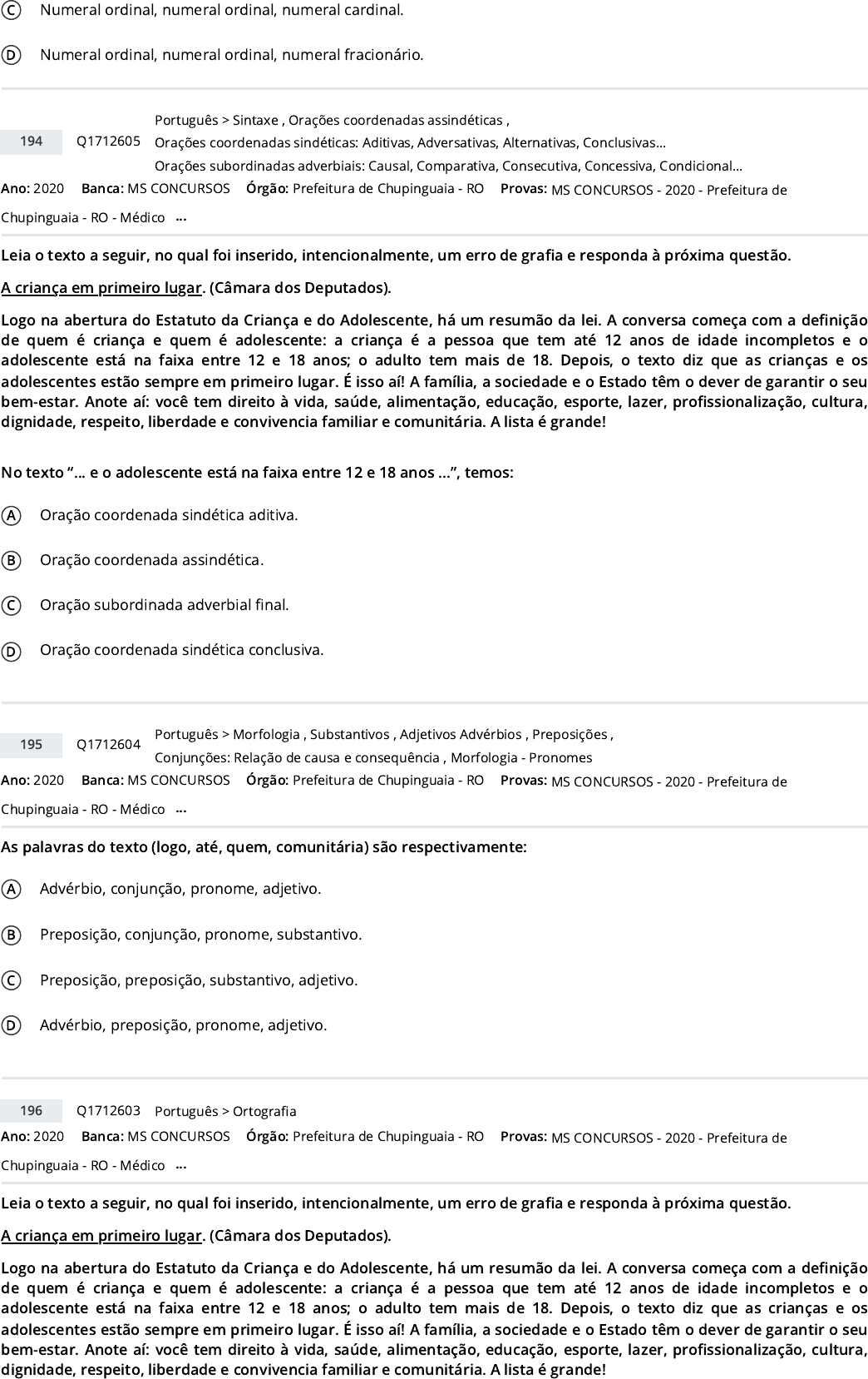 C Numeral ordinal, numeral ordinal, numeral cardinal. D Numeral ordinal, numeral ordinal, numeral fracionário. Ano: 2020 Banca: MS CONCURSOS Órgão: Prefeitura de Chupinguaia - RO Leia o texto a seguir, no qual foi inserido, intencionalmente, um erro de gra�a e responda à próxima questão. A criança em primeiro lugar. (Câmara dos Deputados). Logo na abertura do Estatuto da Criança e do Adolescente, há um resumão da lei. A conversa começa com a de�nição de quem é criança e quem é adolescente: a criança é a pessoa que tem até 12 anos de idade incompletos e o adolescente está na faixa entre 12 e 18 anos; o adulto tem mais de 18. Depois, o texto diz que as crianças e os adolescentes estão sempre em primeiro lugar. É isso aí! A família, a sociedade e o Estado têm o dever de garantir o seu bem-estar. Anote aí: você tem direito à vida, saúde, alimentação, educação, esporte, lazer, pro�ssionalização, cultura, dignidade, respeito, liberdade e convivencia familiar e comunitária. A lista é grande! No texto “... e o adolescente está na faixa entre 12 e 18 anos ...”, temos: A Oração coordenada sindética aditiva. B Oração coordenada assindética. C Oração subordinada adverbial �nal. D Oração coordenada sindética conclusiva. Ano: 2020 Banca: MS CONCURSOS Órgão: Prefeitura de Chupinguaia - RO As palavras do texto (logo, até, quem, comunitária) são respectivamente: A Advérbio, conjunção, pronome, adjetivo. B Preposição, conjunção, pronome, substantivo. C Preposição, preposição, substantivo, adjetivo. D Advérbio, preposição, pronome, adjetivo. Ano: 2020 Banca: MS CONCURSOS Órgão: Prefeitura de Chupinguaia - RO Leia o texto a seguir, no qual foi inserido, intencionalmente, um erro de gra�a e responda à próxima questão. A criança em primeiro lugar. (Câmara dos Deputados). Logo na abertura do Estatuto da Criança e do Adolescente, há um resumão da lei. A conversa começa com a de�nição de quem é criança e quem é adolescente: a criança é a pessoa que tem até 12 anos de idade incompletos e o adolescente está na faixa entre 12 e 18 anos; o adulto tem mais de 18. Depois, o texto diz que as crianças e os adolescentes estão sempre em primeiro lugar. É isso aí! A família, a sociedade e o Estado têm o dever de garantir o seu bem-estar. Anote aí: você tem direito à vida, saúde, alimentação, educação, esporte, lazer, pro�ssionalização, cultura, dignidade, respeito, liberdade e convivencia familiar e comunitária. A lista é grande! 194 Q1712605 >Português Sintaxe , Orações coordenadas assindéticas , Orações coordenadas sindéticas: Aditivas, Adversativas, Alternativas, Conclusivas... Orações subordinadas adverbiais: Causal, Comparativa, Consecutiva, Concessiva, Condicional... Provas: MS CONCURSOS - 2020 - Prefeitura de Chupinguaia - RO - Médico ... 195 Q1712604 >Português Morfologia , Substantivos , Adjetivos Advérbios , Preposições , Conjunções: Relação de causa e consequência , Morfologia - Pronomes Provas: MS CONCURSOS - 2020 - Prefeitura de Chupinguaia - RO - Médico ... 196 Q1712603 >Português Ortogra�a Provas: MS CONCURSOS - 2020 - Prefeitura de Chupinguaia - RO - Médico ... https://www.qconcursos.com/questoes-de-concursos/bancas/ms-concursos https://www.qconcursos.com/questoes-de-concursos/institutos/prefeitura-de-chupinguaia-ro https://www.qconcursos.com/questoes-de-concursos/bancas/ms-concursos https://www.qconcursos.com/questoes-de-concursos/institutos/prefeitura-de-chupinguaia-ro https://www.qconcursos.com/questoes-de-concursos/bancas/ms-concursos https://www.qconcursos.com/questoes-de-concursos/institutos/prefeitura-de-chupinguaia-ro https://www.qconcursos.com/questoes-de-concursos/questoes/df08d02f-8e https://www.qconcursos.com/questoes-de-concursos/disciplinas/letras-portugues https://www.qconcursos.com/questoes-de-concursos/disciplinas/letras-portugues/sintaxe https://www.qconcursos.com/questoes-de-concursos/disciplinas/letras-portugues/oracoes-coordenadas-assindeticas https://www.qconcursos.com/questoes-de-concursos/disciplinas/letras-portugues/oracoes-coordenadas-sindeticas-aditivas-adversativas-alternativas-conclusivas https://www.qconcursos.com/questoes-de-concursos/disciplinas/letras-portugues/oracoes-subordinadas-adverbiais-causal-comparativa-consecutiva-concessiva-condicional https://www.qconcursos.com/questoes-de-concursos/provas/ms-concursos-2020-prefeitura-de-chupinguaia-ro-medico https://www.qconcursos.com/questoes-de-concursos/questoes/df057116-8e https://www.qconcursos.com/questoes-de-concursos/disciplinas/letras-portugues https://www.qconcursos.com/questoes-de-concursos/disciplinas/letras-portugues/morfologia https://www.qconcursos.com/questoes-de-concursos/disciplinas/letras-portugues/substantivos https://www.qconcursos.com/questoes-de-concursos/disciplinas/letras-portugues/adjetivos https://www.qconcursos.com/questoes-de-concursos/disciplinas/letras-portugues/adverbios https://www.qconcursos.com/questoes-de-concursos/disciplinas/letras-portugues/preposicoes https://www.qconcursos.com/questoes-de-concursos/disciplinas/letras-portugues/conjuncoes-relacao-de-causa-e-consequencia https://www.qconcursos.com/questoes-de-concursos/disciplinas/letras-portugues/morfologia-pronomes https://www.qconcursos.com/questoes-de-concursos/provas/ms-concursos-2020-prefeitura-de-chupinguaia-ro-medico https://www.qconcursos.com/questoes-de-concursos/questoes/defea2cc-8e https://www.qconcursos.com/questoes-de-concursos/disciplinas/letras-portugues https://www.qconcursos.com/questoes-de-concursos/disciplinas/letras-portugues/ortografia https://www.qconcursos.com/questoes-de-concursos/provas/ms-concursos-2020-prefeitura-de-chupinguaia-ro-medico
