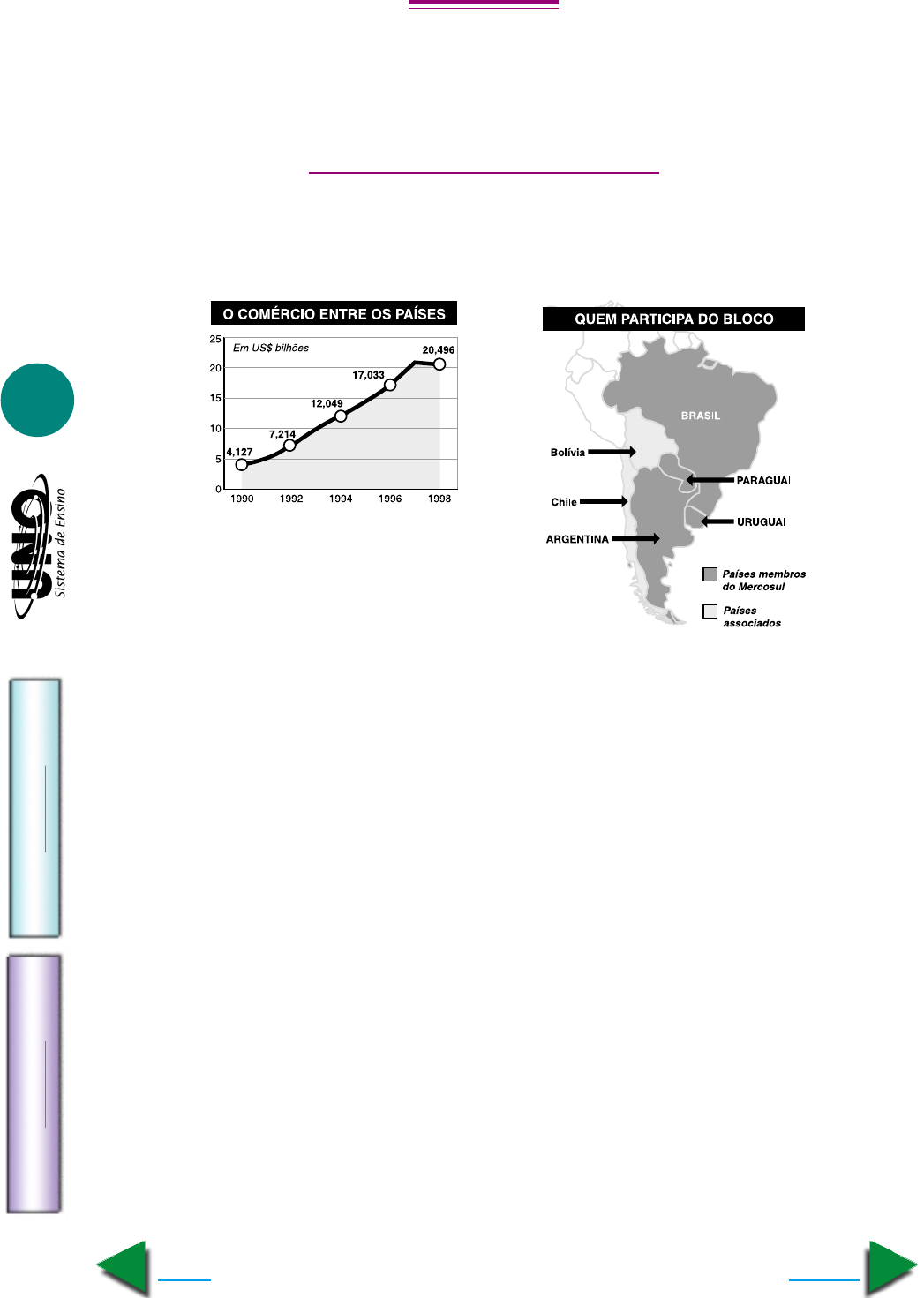 GEOGRAFIA - América e MERCOSUL IM PR IM IR Voltar GA BA RI TO Avançar 1 1. U. Santa Ursula-RJ Saiba mais sobre o MERCOSUL Sobre o MERCOSUL podemos afirmar que: I. O comércio entre os países mem- bros do MERCOSUL intensificou- se durante a década de 90. II. Os países pequenos, como Uruguai e Paraguai, precisam estar dentro do MERCOSUL para facilitar a colocação de seus produtos. III. A criação da ALCA (Área de Livre Comércio das Américas) representa uma solução para os problemas do MERCOSUL, já que garante o protecionismo para os produtos regionais. Assinale a alternativa correta: a) I e II, são verdadeiras as afirmativas. b) II e III, são verdadeiras as afirmativas. c) I e III, são verdadeiras as afirmativas. d) I, II e III, são verdadeiras as afirmativas. e) somente a afirmativa I verdadeira. 2. Acafe-SC Assinale a alternativa que completa corretamente o texto: O MERCOSUL foi criado em 1991 com o objetivo de integrar as economias e procedi- mentos aduaneiros dos países componentes: Brasil, Argentina, Uruguai e Paraguai. Pos- teriormente, Chile e Bolívia passaram a participar do Mercado Comum do Cone Sul, como membros associados. O ano de 2005 será decisivo para o crescimento ou sobrevi- vência do Mercosul em conseqüência: a) da provável desvalorização do euro; b) da dolarização no Extremo Oriente; c) da desistência do Chile e da Bolívia; d) da concorrência da ALCA; e) do crescimento extraordinário do NAFTA. Fonte: Centro de Economia Internacional da chancelaria argentina. Dados de 1998. A M É R IC A E M E R C O SUL G E O G R A F IA GEOGRAFIA - América e MERCOSUL IM PR IM IR Voltar GA BA RI TO Avançar 2 3. UFSE Considere o texto apresentado abaixo. “Um americano consome 30 vezes mais petróleo e minerais que um hindu. (...) mais 75 milhões de americanos equivalem a um aumento planetário de 3 bilhões e 750 milhões de hindus.” Adaptado de POURSIN, Jean-Marie e DUPUY, Gabriel. Malthus. São Paulo: Cultrix/EDUSP,1975. Sobre o crescimento da população mundial, o texto procura destacar que: a) existem ritmos diferenciados de crescimento populacional entre os países do globo, em especial entre os países ricos e os pobres, nos quais o crescimento demográfico encontra-se estabilizado. b) o crescimento da população dos países pobres ameaça o bem-estar da população dos países ricos em função de sua proporção muito maior, ainda que com baixa capacida- de de consumo. c) nos países pobres, o crescimento demográfico encontra-se na fase expansiva, geran- do um desequilíbrio entre população e poder de consumo, o que não ocorre nos países ricos de crescimento demográfico negativo. d) enquanto a população dos países ricos cresce em ritmo aritmético e de forma equili- brada quanto aos recursos, a população nos países pobres cresce em escala geométri- ca gerando, com isso, escassez de recursos. e) o poder de consumo das populações dos países ricos faz com que seu crescimento demográfico tenha maior impacto econômico e ecológico que o crescimento popula- cional nos países pobres. 4. Cefet-PR Assinale a alternativa em que todos os países indicados integram o MERCOSUL. a) Argentina, Brasil, Paraguai e Uruguai. b) Brasil, Peru, Paraguai e Argentina. c) Argentina, Brasil, Chile, Paraguai, Colômbia e Uruguai. d) Argentina, Brasil, Chile, Peru e Uruguai. e) Argentina, Brasil, Chile, Bolívia, Paraguai e Uruguai. 5. VUNESP-SP O perfil representa um sistema de barragens e eclusas que permite a nave- gação em superfícies líquidas de diferentes altitudes em relação ao nível do mar. O perfil corresponde ao a) Estreito de Bering. d) Canal do Panamá. b) Canal da Mancha. e) Canal de Suez. c) Estreito de Dardanelos. 6. UFSE Atualmente, a América do Norte e a Europa Ocidental são grandes pólos de atra- ção populacional. Os fluxos migratórios que para lá se dirigem são, em grande maioria. a) de africanos e asiáticos que se refugiam das guerras étnicas de seus países. b) dos países islâmicos que fogem dos conflitos e tensões no Oriente Médio. c) de sul-americanos e australianos devido a integração das economias no mercado mundial. d) dos países subdesenvolvidos que fogem do subemprego e da instabilidade política e econômica. e) dos países desenvolvidos que possuem acordos econômicos e que permitem a livre circulação de suas populações. GEOGRAFIA - América e MERCOSUL IM PR IM IR Voltar GA BA RI TO Avançar 3 7. UFF-RJ Depois de crescer de 1 bilhão de dólares, em 1990, para 20 bilhões, em 1997, o comércio interno no Mercosul estagnou em 1998 e, no primeiro semestre de 1999, apresentou uma queda de 30%. Royal Institute of Internacional Affairs. Pode-se mencionar, dentre os motivos da queda no movimento comercial do Mercosul: a) as medidas de desvalorização da moeda brasileira e a grave recessão econômica na Argentina; b) a forte concorrência dos produtos asiáticos com livre ingresso na bacia platina; c) a resistência dos agricultores do sul do Brasil contra a entrada do trigo uruguaio e argentino; d) a guerra fiscal na região fronteiriça entre o Paraguai e o Brasil; e) a entrada de novos parceiros com diferentes realidades socioeconômicas, a exemplo do Chile e do Equador. 8. UFSC Considere a tabela sobre os indicadores econômicos e sociais do MERCOSUL. Com base nos dados da tabela abaixo, assinale a(s) proposição(ões) verdadeira(s). Fonte: PRAXEDES, Walter e PILETTI, Nelson. O Mercosul e a sociedade global. 8. ed., São Paulo, Ática, 1997. INDICADORES ECONÔMICOS E SOCIAIS DO MERCOSUL INDICADORES Área (quilômetros quadrados) População (em milhões) PIB (bilhões de dólares) Renda per capita (dólares) Mortalidade infantil (por mil) Esperança de vida ao nascer (anos) Analfabetismo DATA - 1995 1993 1993 1990 / 1995 1990 / 1995 1993 ARGENTINA 2.766.889 34,6 255,5 7.650,00 28,8 71,4 5% BRASIL 8.511.965 155,8 718,5 (1995) 4.632,00 (1995) 56,4 66,3 19% PARAGUAI 406.752 5,0 6,9 1.500,00 47,0 