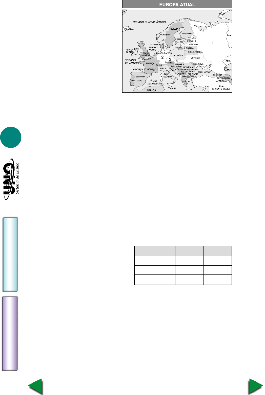GEOGRAFIA - Europa, Ásia, África e Oceania IM PR IM IR Voltar GA BA RI TO Avançar 5 15. UFGO Segundo VESENTINI (Geografia Geral e do Brasil, 1996), nos últimos anos o mapa-múndi político sofreu transformações radicais: em 1998 havia 170 países na su- perfície terrestre; em 1995, já eram mais de 190. No mapa ao lado, estão nume- rados 4 países da Europa que surgiram na última década, ori- ginados da crise da ordem mun- dial bipolar (1945-anos 80). Com relação a esse assunto, faça o seguinte: a) Denomine os países assina- lados no mapa, conforme sua numeração. 16. UFSE Considere as afirmativas e relacione-as aos países apresentados na tabela abaixo. I. Possui um parque industrial dos mais modernos do mundo, sede de grandes multina- cionais da área siderúrgica, eletroeletrônica, química e automobilística, com desta- que para a concentração nos vales dos rios Reno e Ruhr. II. As diferenças de desenvolvimento econômico entre o norte e o sul são fonte de con- flitos políticos internos, no qual não faltam grupos que propõem a separação total das regiões em dois países distintos. III. É o maior produtor agrícola da Europa Ocidental, destacando-se na produção de ce- reais, e um dos grandes defensores da manutenção dos subsídios ao setor agrícola, em defesa do “caráter nacional” presente no campo. Itália França Alemanha a) I II III b) I III II c) II I III d) II III I e) III II I 17. UFSE Analise a tabela. A leitura da tabela permite concluir que: a) a forte concentração de terras no continente asiático associada às dificuldades naturais podem ser consideradas principais fatores responsáveis pelo elevado núme- ro de subnutridos. b) a redução do número de subnutridos na América Latina deve-se ao fato desta área estar, atualmente, inserida no processo de globalização que tem permitido melhoria generalizada das condições de vida da população. c) a histórica inserção da África na divisão territorial do trabalho transformou o conti- nente em área de exportação de produtos tropicais, reduzindo as áreas de cultivos de subsistência e aumentando o contingente de subnutridos. d) o surgimento de blocos econômicos tanto na Ásia como na América Latina gerou sensíveis transformações econômicas e sociais responsáveis pela diminuição da fome e da pobreza nestas regiões. e) a África é o único continente do mundo a sofrer com maior intensidade os fenômenos da desertificação e da lixiviação dos solos, problemas que reduzem as áreas de cultivo e geram a fome. Área do globo Ásia África América Latina 1975 800 180 70 1997 570 210 50 TOTAIS DE POPULAÇÃO SUBNUTRIDA NO MUNDO (EM MILHÕES) GEOGRAFIA - Europa, Ásia, África e Oceania IM PR IM IR Voltar GA BA RI TO Avançar 6 18. Cesgranrio- Modificada Responda às questões e consideran- do o mapa da antiga Iugoslávia. A formação da moderna Iugoslávia representou os anseios dos sérvios de construir um estado que reunisse a sua população dispersa nos Bálcãs. O projeto do reino da Grande Sérvia se concretizou após a Primeira Guer- ra Mundial. Entretanto, uma das di- ficuldades encontradas para a plena consolidação do novo país foi a: a) presença minoritária dos sérvios na maior parte da Iugoslávia; b) ausência de projetos nacionais entre croatas e eslovenos; c) composição étnica heterogênea característica da Iugoslávia; d) homogeneidade étnica em todo o território da Iugoslávia; e) influência nacionalista da Igreja ortodoxa na Croácia. País Nome Populção aproximada Grupo étnico majoritário 1 2 3 4 5 Eslovênia Croácia Bósnia- Hezergonina Iugoslávia (Sérvia + Montenegro) Macedônia 1.900.000 4.500.000 3.500.000 11.000.000 2.200.000 Eslovênios (88%) Croatas (78%) Muçulmanos (42%) Sérvios (62%) Macêdonios (66%) Fonte: Almanaque Abril, 1997 19. PUC-PR São características dos dois países representados: As planícies são as formas de relevo predominante. Apresentam grande população rela- tiva e pequena superfície. Graças ao elevado padrão técnico são exportadores de produ- tos agropecuários. Fazem parte dos organismos econômicos: Benelux e União Européia. Os países são: a) Dinamarca e Eire d) Países Baltícos e Países Baixos b) Noruega e Bélgica e) Bélgica e Países Baixos c) Países Baixos e Dinamarca GEOGRAFIA - Europa, Ásia, África e Oceania IM PR IM IR Voltar GA BA RI TO Avançar 7 20. UFPR Sobre a Europa Ocidental, é correto afirmar: a) A crise econômica que a região vem sofrendo decorre da automação de determinados setores da atividade produtiva, como a agropecuária, que têm liberado o trabalhador, aumentando desta o número de desempregados. b) Sofre uma crise demográfica, decorrente do aumento da oferta de empregos, que não é acompanhado de aumento equivalente do número de europeus adultos. c) Vive uma crise social, decorrente da prosperidade das comunidades imigrantes, cujos membros ocupam os melhores empregos e salários, impedindo o acesso dos cidadãos europeus ao trabalho. d) Se, num passado recente, os imigrantes, pouco exigentes, serviram para cobrir o défi- cit de mão-de-obra para serviços menos qualificados, hoje, com a crise econômica local, o aumento do desemprego tem levado os europeus a se sentirem prejudicados com a presença desses trabalhadores. e) Ocorre um intenso processo de desindustrialização, ou seja, a migração de trabalha- dores do setor segundário para o setor terciário e neste setor a oferta é pequena. 21. UnB-DF Ucrânia e Belarus são países eslavos, bastante ligados à Rússia em termos econômicos, lingüís- ticos e culturais.Essa ligação parece ser tão natural quanto aquela encontrada entre ingleses, escoceses e irlandeses. É difícil para os russos aceitarem a perda desses países, e tem havido pressões no sentido de uma reintegração. Apesar das afinidades, interesses e diferenças fomen- tam as relações entre esses países. A Ucrânia é m