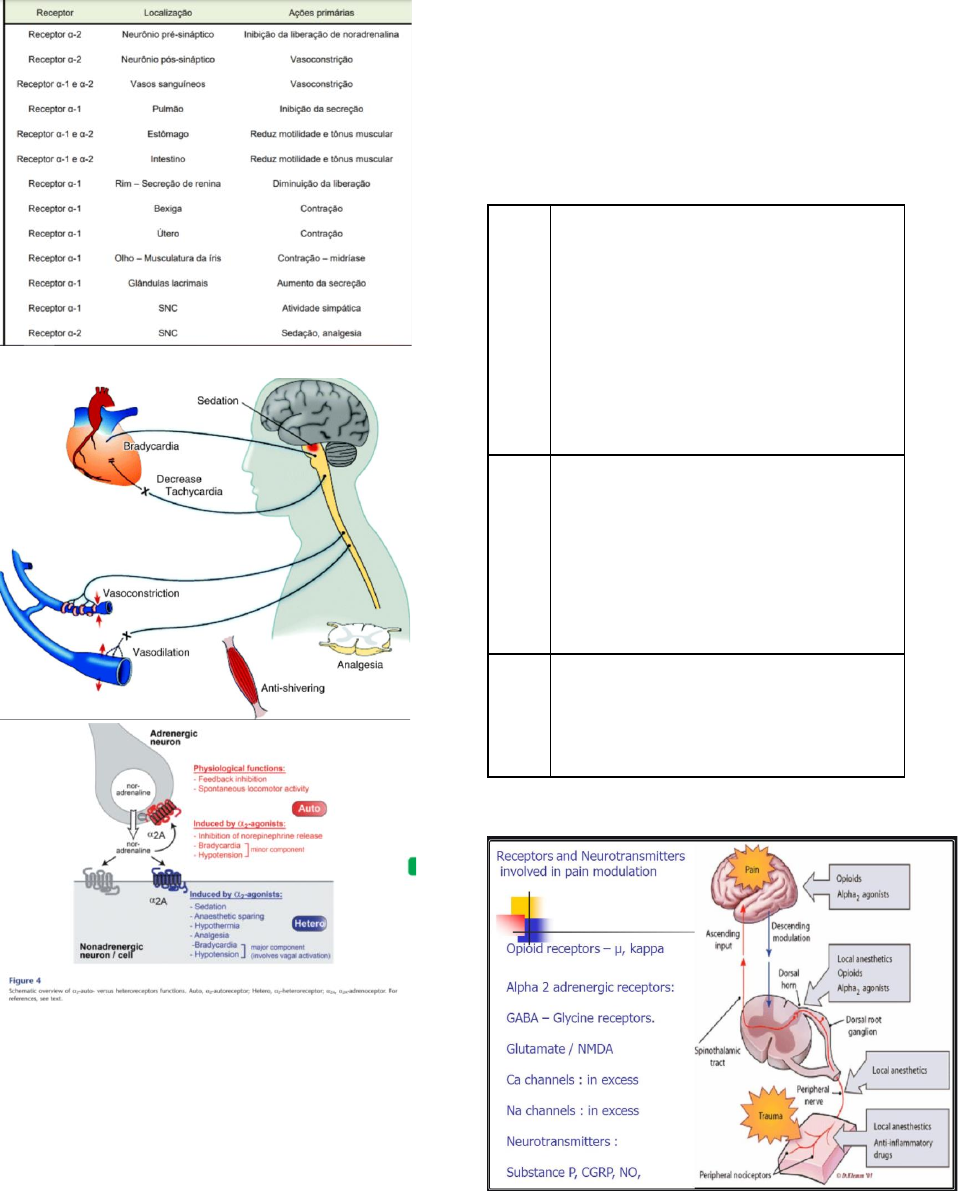 Agonistas dos receptores α2-adrenérgicos GERAL: Mecanismo de ação: Os receptores α-2 são inibitórios, estão localizados na membrana pré-sináptica de neurônios nos centros superiores e quando ativados induzem efeitos ansiolíticos, sedativos, simpatolíticos e anti-hipertensivos alfa 2 pré sináptico, é um receptor associado à proteína G, portando: inibitória. sendo assim, ao se ligar em alfa-2 a noradrenalina, produz ação inibitória na adenilato ciclase reduzindo os níveis de AMPc na célula, desfavorecendo a entrado de ca2++ na célula, reduzindo assim a saída de NA. Alguns efeitos da estimulação dos receptores α2- adrenérgicos não exige o acoplamento à proteína G, como a inibição da agregação plaquetária. alfa- 2 a localizados no córtex cerebral e no tronco encefálico e constituem a principal fonte de sedação e analgesia supra espinhal além da bradicardia e hipotensão mediadas centralmente; alfa- 2 b localizados na medula espinal e no endotélio vascular, e sua estimulação resulta em analgesia espinal, vasoconstrição e bradicardia perifericamente mediada; alfa- 2 c localizados na medula espinal, modulando a analgesia espinhal e, possivelmente, a termorregulação -Os fármacos a2, produzem analgesia pelas ação em estruturas espinhais e supra espinais -As terminações aferentes centrais estão presentes no corno dorsal da medula espinhal e no tronco cerebral -A administração de doses reduzidas de agonistas α-2 em qualquer um destes locais induz analgesia com mínimos efeitos adversos Indicação: Esses agentes não são classificados como simpatomiméticos, porém são usados extensamente em medicina veterinária pelas suas excelentes propriedades sedativas e analgésicas e relaxante muscular. Seus outros efeitos mediados pelos receptores α2- adrenérgicos são considerados, na maioria dos casos, como efeitos colaterais adversos. Constituem-se um classe de drogas muito úteis em anestesiologia e terapia intensiva, por apresentarem um efeito anti-hipertensivo, analgesico, sedativo, ddimunuição da concentração alveolar dos anestésicos inalatórios e redução de tremores pós- operatórios. ● SNC: -reduz a liberação de noradrenalina -O tronco cerebral é a região com maior presença de células noradrenérgicas, localizadas bilateralmente em um pequeno núcleo neural conhecido como Locus coeruleus. Esta estrutura é um importante modulador do estado de alerta, sendo o principal local de ação dos agonistas adrenérgicos α-2 -Pode-se observar ausência de sedação ou excitação paradoxal quando animais estão excitados, com medo, dor ou outro estresse Essas condições resultam em altos níveis circulantes de catecolaminas e podem ser difíceis de controlar com medicação. -rigidez, convulsões e/ou excitação após a injeção intra carotídea acidental de xilazina em equinos -PIC cães não parece ser alterada com uso de medetomidina mas eleva a pressão de perfusão cerebral -dexmedetomidina altera o PIC, consequentemente reduz o aporte de oxigênio, por esse motivo é necessário ter cuidado com o uso de agonista alfa 2 em pacientes com alteração hemodinâmica funcional -estudos experimentais mostraram com esses fármacos podem ser usados em pacientes com doença neurológica -apesar de promoverem sedação profunda, os pacientes são muito sensíveis ao toque e sons ● S. RESPIRATÓRIO: -quando usados isoladamente, os agonistas alfa 2, manteve os parâmetros de gasometria inalterados -A ocorrência de depressão respiratória é principalmente observada pela redução dos movimentos respiratórios, diminuição na pressão parcial arterial de oxigênio e aumento das pressões de gás carbônico sanguíneo, induzidas pela ação do fármaco nos centros respiratórios superiores -quando adm em associação com outros sedativos, opióides e anestésicos os valores de gases no sangue podem ser variáveis, e frequentemente indicam insuficiência respiratória -agonistas alfa 2 promovem vasoconstrição periférica, retardando o fluxo sanguíneo na periferia -> tempo do trânsito capilar prolongado, possibilita a extração de mais o2, resultando numa quantidade maior de hemoglobina desoxigenada da extremidade do capilar -o impulso ventilatório pode ser afetado. deve- se ter cuidado com pacientes com função respiratória limítrofe ou depressão do SNC -Os ovinos têm propensão à hipoxemia após o uso de agonistas dos receptores α2- adrenérgicos em consequência do edema pulmonar secundário à lesão do parênquima pulmonar. é preciso ter cuidado ao usar essa classe de fármacos em ovinos ou evitar por completo. ● S. CARDIOVASCULAR: -A distribuição dos receptores α1- e α2- adrenérgicos dependente da espécie -bradicardia reflexa mediado por barorreceptores (vagal), devido a um aumento da resistência vascular sistêmica- redução da frequência para tentar manter a pressão normal (livro) -A bradicardia observada em pacientes após administração do fármaco agonista α-2 ocorre pelo aumento do tônus vagal e resposta reflexa de barorreceptores à vasoconstrição periférica. Esta resposta ocorre a partir da hipertensão transitória observada por estimulação inicial de receptores α-1 adrenérgicos (revisão, pesquisa confirma a estimulação de a1 causar hipertensão) -a duração da fase hipertensiva está relacionada com a dose do fármaco agonista α- 2, enquanto a duração da fase hipotensiva não apresenta a mesma relação, sendo que, mesmo com a utilização de pequenas doses observa-se hipotensão - pela falta de seletividade iria atingir receptor a1 A resposta difasica se explica por: -as duas fases da resposta à pressão são mediadas por dois subtipos diferentes de receptores α 2 in vivo: α 2B-receptores são responsáveis pela fase hipertensiva inicial, enquanto a hipotensão de longa duração é mediada por receptores α 2A -os agentes antimuscarínicos mostram se efetivos para aume