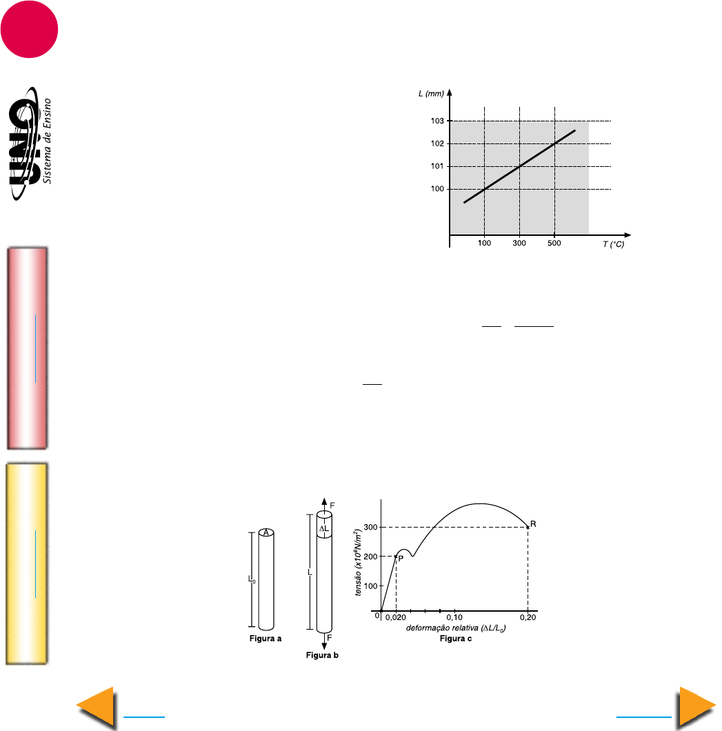 FÍSICA - Termologia, dilatação e transmissão de calor IM PR IM IR Voltar GA BA RI TO Avançar 13 57. UFR-RJ Pela manhã, com temperatura de 10ºC, João encheu completamente o tanque de seu carro com gasolina e pagou R$ 33,00. Logo após o abastecimento deixou o carro no mesmo local, só voltando para buscá-lo mais tarde, quando a temperatura atingiu a marca de 30ºC. Sabendo-se que o combustível extravasou, que o tanque dilatou e que a gasolina custou R$ 1,10 o litro, quanto João perdeu em dinheiro? Dado: Coeficiente de dilatação térmica da gasolina igual a 1,1 × 10–3 ºC–1 58. F.M. Ttriângulo Mineiro-MG Uma dona de casa lava dois copos de materiais diferen- tes e, logo em seguida, coloca um dentro do outro. Depois de algum tempo em que a temperatura ambiente permanece constante, ela nota que eles estão presos e não conse- gue separá-los. Dentre as muitas explicações possíveis para esse fato, uma delas é que a temperatura da água com a qual os copos foram lavados: a) era mais baixa que a temperatura ambiente e o copo de dentro tem coeficiente de dilatação maior que o de fora; b) era mais alta que a temperatura ambiente e o copo de dentro tem coeficiente de dilata- ção maior que o de fora; c) era mais baixa que a temperatura ambiente e o copo de dentro tem coeficiente de dilatação menor que o de fora; d) era igual à temperatura ambiente, mas o copo de dentro tem coeficiente de dilatação maior que o de fora. e) era igual à temperatura ambiente, mas o copo de dentro tem coeficiente de dilatação menor que o de fora. 59. UFPE O gráfico abaixo apresenta a variação do comprimento L de uma barra metálica, em função da temperatura T. Qual o coeficiente de dilatação linear da barra, em ºC–1? a) 1,00 x 10–5 d) 4,00 x 10–5 b) 2,00 x 10–5 e) 5,00 x 10–5 c) 3,00 x 10–5 60. UFC Uma barra de aço, cilíndrica, de comprimento inicial L 0 e área de seção reta A (ver figura a), é deformada pela ação de uma força de tração F, aplicada conforme mostrado na figura b. O gráfico da figura c mostra como varia a tensão s (força de tração por unidade de área de seção reta) versus deformação relativa, ∆L Lo = L L L o o − . O trecho da curva compreendido entre os pontos O e P corresponde a uma relação linear entre tensão e deformação relativa, dada por σ = E ∆L Lo , em que a constante E é conhecida como módulo de elasticidade ou módulo de Young. O ponto R, marcado sobre a curva da figura c, indica o par de valores (tensão, deformação relativa) para o qual há ruptura da barra. a) Calcule o valor da constante E para o aço em questão e expresse suas unidades. b) Qual a porcentagem de alongamento da barra no ponto em que ela atinge o rompi- mento? FÍSICA - Termologia, dilatação e transmissão de calor IM PR IM IR Voltar GA BA RI TO Avançar 14 61. UFSC Recomendam alguns livros de culinária que, ao se cozinhar macarrão, deve-se fazê-lo em bastante água – não menos do que um litro de água para cada 100 g – e somente pôr o macarrão na água quando esta estiver fervendo, para que cozinhe rapida- mente e fique firme. Assim, de acordo com as receitas para 500 g de macarrão são neces- sários, pelo menos, 5 litros de água. A respeito do assunto assinale a(s) proposição(ões) correta(s): 01. O macarrão cozinha tão rapidamente em 1 litro como em 5 litros de água, pois a temperatura máxima de cozimento será 100ºC, em uma panela destampada em Flo- rianópolis. 02. A capacidade térmica do macarrão varia com a quantidade de água usada no cozi- mento. 04. Ao ser colocado na água fervente, o macarrão recebe calor e sua temperatura aumen- ta até ficar em equilíbrio térmico com a água. 08. Quanto maior a quantidade de água fervente na panela, maior será a quantidade de calor que poderá ser cedida ao macarrão e, conseqüentemente, mais rápido cozinha- rá. 16. A quantidade de calor que deverá ser cedida pela água fervente para o macarrão atingir a temperatura de equilíbrio depende da massa, da temperatura inicial e do calor específico do macarrão. 32. Para o cozimento do macarrão, o que importa é a temperatura e não a massa da água, pois a capacidade térmica da água não depende da massa. 64. A água ganha calor da chama do fogão, através da panela, para manter sua tempera- tura de ebulição e ceder energia para o macarrão e para o meio ambiente. Dê, como resposta, a soma das alternativas corretas. 62. U. Católica-DF A energia térmica, sem muito rigor denominada genericamente calor, pode ser transferida de um corpo a outro de várias formas, podendo provocar variados efeitos nos corpos que a recebem ou perdem. A esse respeito, escreva V para as afirmati- vas verdadeiras ou F para as afirmativas falsas. ( ) Quando se levanta, uma pessoa julga (ao contato dos pés nus) que o chão de madei- ra do quarto apresenta temperatura superior à da maçaneta metálica (ao toque da mão); isso se deve ao fato de que os metais são mais frios que as madeiras. ( ) Quando uma garrafa de vidro transparente contendo água é colocada ao ar livre, exposta à radiação solar direta durante algum tempo, a água se aquece; a causa desse aquecimento é a conversão de energia luminosa em energia térmica. ( ) Quando colocamos um ovo para cozinhar, imerso em água quente, o ovo se aquece devido à transferência de calor da água para ele, predominantemente por meio do processo de condução térmica. ( ) O aumento de temperatura que a água sofre ao passar por um chuveiro elétrico funcionando adequadamente se deve à passagem da corrente elétrica pela água. ( ) No interior do País é muito comum a utilização de moringas, ou bilhas d’água, feitas de barro; a alegação dos usuários é que elas mantêm a água fresquinha, a temperatura inferior à do ambiente, sem necessidade de geladeira. A argumentação apresentada é procedente, e se justifica pela evaporação. 63. UFMT Caju, que gosta de pe