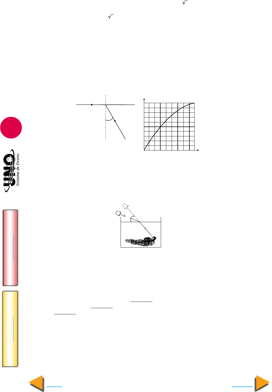 FÍSICA - Refração IM PR IM IR Voltar Avançar 6 GA BA RI TO 20. Unicap-PE Um raio de luz monocromático propaga-se de um meio 1 para um meio 2. Sabe-se que o ângulo de incidência é de 45° e o ângulo de refração, 30°. ( ) O índice de refração do meio 2, em relação ao meio 1, é 2. ( ) Se o raio de luz se propaga no meio 1 com velocidade V 1 , então sua velocidade, no meio 2, será V 2 = V 1 2 . ( ) Um objeto real de 2 m de altura se encontra a 5 m de um espelho plano. A imagem se formará a 10 m do objeto e terá também 2 m de altura. ( ) Um objeto se encontra na frente de um espelho esférico côncavo, de modo que o aumento linear transversal é positivo. Podemos afirmar que, se o objeto for real, a imagem também será real. 21. U. Potiguar-RN Em uma experiência realizada em laboratório, um raio rasante, de luz monocromática, passa de um meio transparente para outro, através de uma interface pla- na, e se retrata num ângulo de 30° com a normal, o raio refratado fará com a normal um ângulo de, aproximadamente: a) 90° b) 60° c) 30° d) 15° 22. UERJ O apresentador anuncia o número do ilusionista que, totalmente amarrado e imerso em um tanque transparente, cheio de água, escapará de modo surpreendente. Durante esse número, o ilusionista vê, em um certo instante, um dos holofotes do circo, que lhe parece estar a 53º acima da horizontal. Sabendo que o índice de refração da água é 4/3, determine o ângulo real que o holofote faz com a horizontal. 23. UFRS Selecione a alternativa que preenche corretamente as lacunas no parágrafo abaixo, na ordem em que elas aparecem. As cores que compõem a luz branca podem ser visualizadas quando um feixe de luz, ao atravessar um prisma de vidro, sofre , separando-se nas cores do espectro visí- vel. A luz de cor é a menos desviada de sua direção de incidência e a de cor é a mais desviada de sua direção de incidência. a) dispersão – vermelha – violeta b) dispersão – violeta – vermelha c) difração – violeta – vermelha d) reflexão – vermelha – violeta e) reflexão – violeta – vermelha interface 30° 1,0 0,5 0 0 30 60 90 sen θ (graus)θ 53° FÍSICA - Refração IM PR IM IR Voltar Avançar 7 GA BA RI TO 24. UFSC Uma lâmina de vidro de faces paralelas, perfeitamente lisas, de índice de refração n, é mergulhada completamente em um líquido transparente de índice de refração também igual a n. Observa-se que a lâmina de vidro torna-se praticamente invisível, isto é, fica difícil distingui-la no líquido. Assinale a(s) proposição(ões) CORRETA(S): 01) A lâmina de vidro torna-se opaca à luz. 02) A luz, ao passar do meio líquido para a lâmina de vidro, sobre reflexão total. 04) A luz sofre forte refração, ao passar do meio líquido para a lâmina de vidro e, também, desta para o meio líquido. 08) Quando a luz passa do líquido para o vidro, ocorre mudança no seu comprimento de onda. 16) A luz não sofre refração, ao passar do meio líquido para a lâmina de vidro. 32) A luz que se propaga no meio líquido não sofre reflexão ao incidir na lâmina de vidro. 64) A luz sofre desvio, ao passar do líquido para a lâmina e, desta para o líquido, porque a velocidade da luz nos dois meios é diferente. Dê como resposta a soma das alternativas corretas. 25. PUC-SP Uma lâmina de vidro de faces paralelas está imersa na água. Sabe-se que o vidro é um meio mais refringente que a água e, portanto, seu índice de refração é maior que o da água. Para um raio de luz monocromática que passa da água para o vidro e chega nova- mente à água (figura), o gráfico que melhor representa a variação de sua velocidade de propagação em função do tempo é a) b) c) d) e) FÍSICA - Refração IM PR IM IR Voltar Avançar 8 GA BA RI TO 26. UEMS Um peixe muito conhecido em Mato Grosso do Sul, o “Dourado”, está a 2,00 m abaixo da superfície de um rio de águas calmas. Qual o ângulo θ acima da horizontal em que o peixe poderá observar uma queimada a 100 m da margem do rio? Considere o índice de refração da água do rio 1,41. a) 60° b) 30° c) 90° d) 45° e) 55° 27. UFBA A figura abaixo representa um raio de luz monocromático que se propaga no ar e incide no ponto I da superfície de um bloco de cristal transparente. Considerem-se os seguintes dados: - índice de refração do ar. 1 - velocidade da luz no vácuo: 3 x 108 m/s - sen 40° = 0,64 sen 42° = 0,67 sen 75° = 0,96 cos 40° = 0,77 cos 42° = 0,74 cos 75° = 0,25 Nessa situação, é verdade: 01) Predominam os fenômenos de reflexão e refração. 02) O ângulo de reflexão do raio de luz que incide no ponto I é igual a 15°. 04) Ao passar do ar para o cristal, o raio de luz se afasta da normal. 08) A velocidade de propagação da luz no cristal é igual a 2 x 108 m/s. 16) Ao atingir o ponto J, a luz sofre reflexão total. 75° 40° I J θ