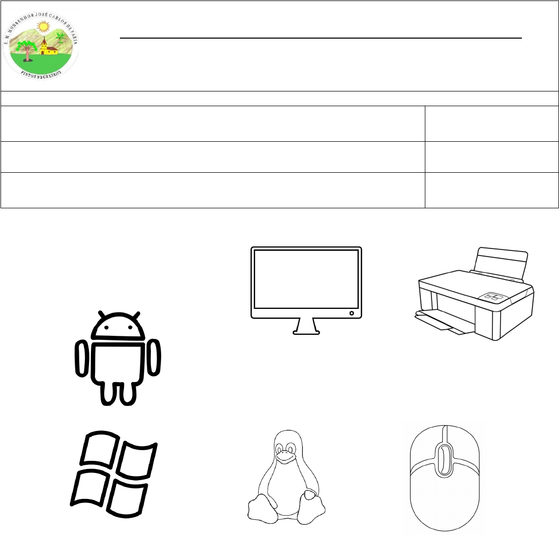 E. M. MONSENHOR JOSÉ CARLOS DE FARIA, DE ENSINO FUNDAMENTAL. CNPJ: 03.166.396/0001-30 Rua da Igreja – s/nº, Pintos Negreiros - Maria da Fé - MG. CEP: 37517 – 000 AVALIAÇÃO DE INFORMÁTICA – 2º BIMESTRE NOME DO ESTUDANTE: DATA: 25/06/2024 PROFESSORA: Patrícia Martins Mendes Uchoas TURMA: 1º ano VALOR: 10 PONTOS NOTA: 1) Pinte o desenho abaixo que representa o sistema operacional. ANDROID IMPRESSORA MONITOR 2) Pinte o desenho abaixo que representa o que é hardware. WINDOWS LINUX MOUSE 3) Qual é o nome do primeiro computador do mundo? ( ) Eniac ( ) Windows ( ) Mouse ( ) Notebook 4) O PAINT é um programa para: ( ) Desenhar e pintar ( ) Digitar textos ( ) Jogar joguinhos ( ) Navegar na internet 5) Complete as palavras abaixo com as vogais que faltam. M N T R M P R S S R T C L D 6) Encontre no caça as palavras abaixo. IMPRESSORA – CAIXAS DE SOM – MONITOR – PROJETOR A R T G Y I A B E L H A C O P C A I X A S D E S O M D R T R T E S O U R A D F G H U J U O C A M A D M O N I T O R L I J F T G Y F G H E S C O L A F E A R J Q W R E S U R T O L Ç T D Y I M P R E S S O R A F C O X U W Q R Y J K L M B F D X R image5.png image6.png image7.png image8.png image9.jpeg image10.jpeg image1.jpeg image2.jpeg image3.png image4.png