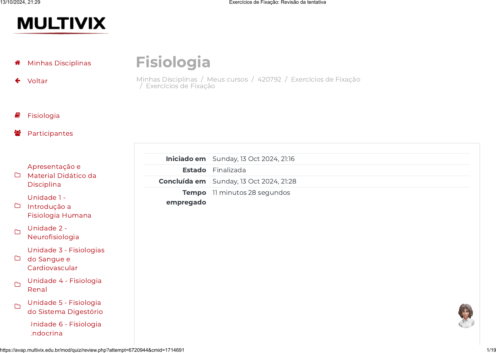 Minhas Disciplinas / Meus cursos / 420792 / Exercícios de Fixação / Exercícios de Fixação Fisiologia Iniciado em Sunday, 13 Oct 2024, 21:16 Estado Finalizada Concluída em Sunday, 13 Oct 2024, 21:28 Tempo empregado 11 minutos 28 segundos Minhas Disciplinas Voltar Fisiologia Participantes Apresentação e Material Didático da Disciplina Unidade 1 - Introdução a Fisiologia Humana Unidade 2 - Neurofisiologia Unidade 3 - Fisiologias do Sangue e Cardiovascular Unidade 4 - Fisiologia Renal Unidade 5 - Fisiologia do Sistema Digestório Unidade 6 - Fisiologia Endocrina 13/10/2024, 21:29 Exercícios de Fixação: Revisão da tentativa https://avap.multivix.edu.br/mod/quiz/review.php?attempt=6720944&cmid=1714691 1/19 https://avap.multivix.edu.br/my/ https://avap.multivix.edu.br/course/view.php?id=29303 https://avap.multivix.edu.br/course/view.php?id=29303§ion=8 https://avap.multivix.edu.br/mod/quiz/view.php?id=1714691 https://avap.multivix.edu.br/my/ https://avap.multivix.edu.br/course/view.php?id=29303 https://avap.multivix.edu.br/user/index.php?id=29303 https://avap.multivix.edu.br/course/view.php?id=29303§ion=1 https://avap.multivix.edu.br/course/view.php?id=29303§ion=2 https://avap.multivix.edu.br/course/view.php?id=29303§ion=3 https://avap.multivix.edu.br/course/view.php?id=29303§ion=4 https://avap.multivix.edu.br/course/view.php?id=29303§ion=5 https://avap.multivix.edu.br/course/view.php?id=29303§ion=6 https://avap.multivix.edu.br/course/view.php?id=29303§ion=7 https://avap.multivix.edu.br/course/view.php?id=29303§ion=8 https://avap.multivix.edu.br/ https://avap.multivix.edu.br/ https://avap.multivix.edu.br/ https://avap.multivix.edu.br/ https://avap.multivix.edu.br/ https://avap.multivix.edu.br/ https://avap.multivix.edu.br/ https://avap.multivix.edu.br/ https://avap.multivix.edu.br/ https://avap.multivix.edu.br/ https://avap.multivix.edu.br/ https://avap.multivix.edu.br/ https://avap.multivix.edu.br/ https://avap.multivix.edu.br/ https://avap.multivix.edu.br/ https://avap.multivix.edu.br/ https://avap.multivix.edu.br/ https://avap.multivix.edu.br/ https://avap.multivix.edu.br/ https://avap.multivix.edu.br/ Questão 1 Correto Vale 1,00 ponto(s). A pressão arterial é a pressão exercida contra a parede das artérias durante um ciclo cardíaco. Na maioria dos órgãos, o �uxo sanguíneo é mantido relativamente de forma constante, isso se dá por meio de adaptações do próprio órgão. Essa regulação do �uxo sanguíneo se explica por diversas causas, regulação arterial central, renal e miogênica. Assinale a alternativa que caracteriza corretamente o processo de regulação. Escolha uma opção: a. A regulação central é feita pelos sistemas simpático e parassimpático que recebem informações dos barorreceptores que se localizam na aorta para os ajustes na pressão arterial. b. O mecanismo miogênico é a capacidade muscular de responder de forma própria, mecanicamente, ao aumento da pressão externa, agido no diâmetro dos vasos sanguíneos o que mantém o �uxo constante. c. A regulação arterial central é regulada somente pelo sistema nervoso simpático e atende à demanda imposta ao sistema cardiovascular. d. A renina é uma enzima que participa do controle renal e é liberada pelo fígado, convertendo o angiotensinogênio em angiotensina I e II. e. O controle renal é feito pelo sistema renina – angiotensina – aldosterona agindo como um regulador hormonal no controle da pressão arterial. Minhas Disciplinas Voltar Fisiologia Participantes Apresentação e Material Didático da Disciplina Unidade 1 - Introdução a Fisiologia Humana Unidade 2 - Neurofisiologia Unidade 3 - Fisiologias do Sangue e Cardiovascular Unidade 4 - Fisiologia Renal Unidade 5 - Fisiologia do Sistema Digestório Unidade 6 - Fisiologia Endocrina 13/10/2024, 21:29 Exercícios de Fixação: Revisão da tentativa https://avap.multivix.edu.br/mod/quiz/review.php?attempt=6720944&cmid=1714691 2/19 https://avap.multivix.edu.br/my/ https://avap.multivix.edu.br/course/view.php?id=29303 https://avap.multivix.edu.br/user/index.php?id=29303 https://avap.multivix.edu.br/course/view.php?id=29303§ion=1 https://avap.multivix.edu.br/course/view.php?id=29303§ion=2 https://avap.multivix.edu.br/course/view.php?id=29303§ion=3 https://avap.multivix.edu.br/course/view.php?id=29303§ion=4 https://avap.multivix.edu.br/course/view.php?id=29303§ion=5 https://avap.multivix.edu.br/course/view.php?id=29303§ion=6 https://avap.multivix.edu.br/course/view.php?id=29303§ion=7 https://avap.multivix.edu.br/course/view.php?id=29303§ion=8 https://avap.multivix.edu.br/ https://avap.multivix.edu.br/ https://avap.multivix.edu.br/ https://avap.multivix.edu.br/ https://avap.multivix.edu.br/ https://avap.multivix.edu.br/ https://avap.multivix.edu.br/ https://avap.multivix.edu.br/ https://avap.multivix.edu.br/ https://avap.multivix.edu.br/ https://avap.multivix.edu.br/ https://avap.multivix.edu.br/ https://avap.multivix.edu.br/ https://avap.multivix.edu.br/ https://avap.multivix.edu.br/ https://avap.multivix.edu.br/ https://avap.multivix.edu.br/ https://avap.multivix.edu.br/ https://avap.multivix.edu.br/ https://avap.multivix.edu.br/ Questão 2 Correto Vale 1,00 ponto(s). A digestão é um processo que envolve um conjunto das transformações mecânicas e químicas que os alimentos orgânicos sofrem ao longo do sistema digestório, para se converterem em compostos menores hidrossolúveis e absorvíveis. Sobre esse processo, é correto a�rmar que: Escolha uma opção: a. A faringe é responsável pela deglutição, a boca pela mastigação e o intestino grosso pelo armazenamento de alimento. b. O processo de digestão inicia a partir do esôfago com atividade voluntária e termina no intestino grosso com o processo de defecação. c. O intestino grosso é responsável pela absorção de nutrientes fundamentais para o organismo, enquanto o intestino delgado pela formação das fezes. d. A boca é responsável pela