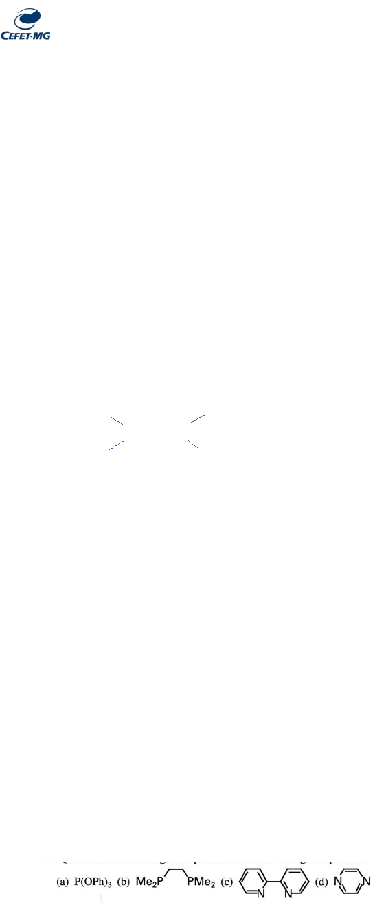 Centro Federal de Educação Tecnológica de Minas Gerais Campus Contagem Graduação em Engenharia Química Professora: Glenda Carvalho Exercícios sobre simetria e compostos de coordenação (Exercícios do livro: Shriver, D. F. Et al. Química Inorgânica, tradução Roberto de Barros Faria. 4ª Ed. Porto Alegre: Bookman, 2008.) 1- Faça um esboço que permitam identificar os seguintes elementos de simetria: a) um eixo C3 e um plano sv na molécula de NH3 b) um eixo C4 e um plano sh no íon quadrático plano [PtCl4]2- c) indique todos os elementos de simetria para as moléculas acima. d) Indique o grupo de ponto para cada uma delas. 2- Qual o grupo pontual para a molécula POCl3? (Para descobrir o grupo pontual, faça os elementos de simetria, considere a molécula tetraédrica com o fósforo como átomo central) 3- Quais os elementos de simetria para a molécula: 4- Considere a molécula Fe(OH)6, sendo o ferro o átomo central e um complexo octaédrico. Indique os elementos de simetria e o grupo de ponto para essa molécula. 5- a) Esboce as duas geometrias que descrevem a maioria dos complexos tetracoordenados. Quais os elementos de simetria para cada um considerando todos os ligantes iguais? b) Para quais destas geometrias é possível a existência de isômeros para os complexos de fórmula MA2B2? 6- Esboce as duas geometrias que descrevem a maioria dos complexos pentacoordenados. Quais os elementos de simetria para cada um considerando todos os ligantes iguais? 7- a) Esboce as duas geometrias que descrevem a maioria dos complexos hexacoordenados. Quais os elementos de simetria para cada um considerando todos os ligantes iguais? b) Qual destes é o mais raro? 8- Explique o significado de monodentado, bidentado e quadridentado. 9- Que tipo de isomeria pode se originar com ligantes ambidentados? Dê um exemplo. 10- Quais das moléculas seguintes podem atuar como um ligante quelante? Justifique. 11- Desenhe as estruturas de complexos representativos que contenham os ligantes: a) en, b) ox, c) phen e d) edta4- 12- Que tipos de isômeros são os compostos [RuBr(NH3)5]Cl e [RuCl(NH3)5]Br? C= C =C HH HH H H 13- Para quais dos seguintes complexos tetraédricos são possíveis isômeros: [CoBr2Cl2]-, [CoBrCl2(OH2)], [CoBrClI(OH2)]? Desenhe todos os isômeros. 14-Para quais dos seguintes complexos quadráticos planos são possíveis isômeros: [Pt(ox)(NH3)2], [PdBrCl(PEt3)2], [IrH(CO)(PR3)2], [Pd(gly)2]? Desenhe todos os isômeros. 15- Para quais dos seguintes complexos octaédricos são possíveis isômeros: [FeCl(OH2)5]2+, [Ir(Cl)3(PEt3)2], [Ru(bipy)3]2+, [Co(Cl)2(en)(NH3)2]+, [W(CO)4(py)2]? Desenhe todos os isômeros. 16- Dê o nome e desenhe as estruturas dos seguintes complexos: a) [Ni(CO)4], b)[Ni(CN)4]2-, c) [CoCl4]2-, d)[[Mn(NH3)6]2+ 17- Dê fórmula dos seguintes complexos: a) cloreto de pentaaminoclorocobalto(III); b) nitrato de hexaaquaferro(III); c) cis-diclorobis(etilenodiamino)rutênio(II), d) cloreto de m- hidroxobis(pentaaminocromo(III)). 18-Dê os nomes dos íons complexos octaédricos: a) cis-[CrCl2(NH3)4]+ b) trans-[Cr(NCS)4(NH3)2]-