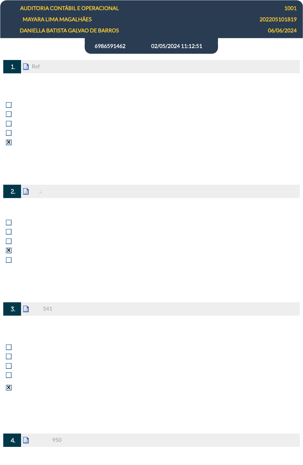Disc.: AUDITORIA CONTÁBIL E OPERACIONAL Turma: 1001 Aluno: MAYARA LIMA MAGALHÃES Matr.: 202205101819 Prof.: DANIELLA BATISTA GALVAO DE BARROS Gabarito após: 06/06/2024 6986591462 02/05/2024 11:12:51 1. Ref.: 5409466 A auditoria interna atua de forma sistemática e contínua nas organizações. Qual requisito especí�co é necessário para sua operacionalização? Facilidade de aprendizado. Bom humor. Honestidade. Caráter. Avaliação dos controles internos. Respondido em 04/05/2024 19:35:29 2. Ref.: 5401449 Assinale a alternativa CORRETA, de acordo com os conceitos apresentados. E�cácia: baixo custo de operações �nanceiras. E�ciência: rapidez na execução de atividades. Economicidade: economia na efetividade. E�cácia: alcance de objetivos. Efetividade: resultados alinhados com a e�ciência. Respondido em 04/05/2024 19:35:46 3. Ref.: 5412477 A auditoria é uma forma de controle de gestão, participando do ciclo PDCA. Neste contexto, assinale a alternativa CORRETA: Auditoria e gestão são atividades que devem ser exercidas por um mesmo grupo de trabalho. As especi�cações de um produto fazem parte da auditoria em função de sua alta especialização. A auditoria é uma forma de desdobramento da estratégia, por contribuir para uma maior oferta de serviços. A função de auditoria deve ser segregada da função de gestão. O controle de gestão demanda atuação da auditoria durante a execução das atividades para contribuir na melhoria da prestação de serviços. Respondido em 04/05/2024 19:36:17 4. Ref.: 5389509 04/05/2024, 19:39 EPS https://simulado.unifacid.com.br/alunos/ 1/3 javascript:alert('C%C3%B3digo da quest%C3%A3o: 5409466.'); javascript:alert('C%C3%B3digo da quest%C3%A3o: 5409466.'); javascript:alert('C%C3%B3digo da quest%C3%A3o: 5401449.'); javascript:alert('C%C3%B3digo da quest%C3%A3o: 5401449.'); javascript:alert('C%C3%B3digo da quest%C3%A3o: 5412477.'); javascript:alert('C%C3%B3digo da quest%C3%A3o: 5412477.'); javascript:alert('C%C3%B3digo da quest%C3%A3o: 5389509.'); javascript:alert('C%C3%B3digo da quest%C3%A3o: 5389509.'); A documentação de auditoria depende de vários fatores organizacionais. Assinale a alternativa que não corresponda a um desses fatores. Natureza dos procedimentos. Relevância das evidências. Tamanho da organização. Riscos de distorção relevante. Índices de governança de auditoria. Respondido em 04/05/2024 19:36:49 5. Ref.: 5392467 Qual das alternativas a seguir corresponde a uma das responsabilidades do auditor? Estruturação da estratégia da organização. Construção de matriz de riscos da organização. Busca de evidências para formação de opinião. Criação de indicadores estratégicos. Formulação de evidências baseadas na avaliação pessoal. Respondido em 04/05/2024 19:37:03 6. Ref.: 5392459 No trabalho de asseguração, o auditor lida com os riscos identi�cados e avaliados. Assinale a alternativa incorreta quanto a um dos pontos abordados no tratamento desses riscos. Análise de desempenho de processo de auditoria. Necessidade de especialistas em determinadas áreas de gestão. Compreensão do ambiente regulatório em que se insere a organização que passará pelo processo de auditoria. Determinação da materialidade da auditoria. Aplicação de procedimentos diversos de avaliação de risco. Respondido em 04/05/2024 19:37:19 7. Ref.: 5409473 As Normas Brasileiras de Auditoria do Setor Público foram divididas em três níveis. Assinale a alternativa incorreta quanto aos pontos abordados nessas normas. Conjuntura econômica em tempos de crise. Transparência E accountability. Controle de qualidade das auditorias. Independência dos Tribunais de Contas. Princípios fundamentais de auditoria �nanceira. Respondido em 04/05/2024 19:37:35 04/05/2024, 19:39 EPS https://simulado.unifacid.com.br/alunos/ 2/3 javascript:alert('C%C3%B3digo da quest%C3%A3o: 5392467.'); javascript:alert('C%C3%B3digo da quest%C3%A3o: 5392467.'); javascript:alert('C%C3%B3digo da quest%C3%A3o: 5392459.'); javascript:alert('C%C3%B3digo da quest%C3%A3o: 5392459.'); javascript:alert('C%C3%B3digo da quest%C3%A3o: 5409473.'); javascript:alert('C%C3%B3digo da quest%C3%A3o: 5409473.'); 8. Ref.: 5412489 O controle administrativo pode ser classi�cado quanto à sua origem de três formas: controle interno, controle externo e controle social. Sobre o controle externo na Administração Pública, podemos a�rmar que: É o controle exercido por um Poder, em relação a outro Poder. O Poder Executivo não tem controle externo por ser soberano. O controle externo é feito pelo controle interno, de forma remota. O controle externo é feito por empresas terceirizadas. A terceirização contribui para maior e�cácia do controle externo. Respondido em 04/05/2024 19:38:38 9. Ref.: 5401100 Complete este texto: "O gerenciamento de riscos ____ tem sua relevância ao cooperar para criação de ____ decorrente da aceitação de riscos considerados razoáveis e para a eliminação ou tratamento de riscos que possam acarretar a destruição de ____". Financeiros, valor, melhorias de processos de trabalho. Contábeis, e�cácia, estruturas. Estruturais, estruturas, estruturas. Corporativos, valor, valor. Gerenciais, valor, evidências. Respondido em 04/05/2024 19:38:54 10. Ref.: 5392438 De acordo com a norma NBC TA 330(R1) do Conselho Federal de Contabilidade, o procedimento substantivo é o procedimento de auditoria planejado para detectar distorções relevantes no nível de a�rmações. Assinale a alternativa que não indica um tipo válido de procedimento substantivo. Inspeção Observação Recálculo Plani�cação Nenhuma das alternativas Respondido em 04/05/2024 19:39:18 04/05/2024, 19:39 EPS https://simulado.unifacid.com.br/alunos/ 3/3 javascript:alert('C%C3%B3digo da quest%C3%A3o: 5412489.'); javascript:alert('C%C3%B3digo da quest%C3%A3o: 5412489.'); javascript:alert('C%C3%B3digo da quest%C3%A3o: 5401100.'); javascript:alert('C%C3