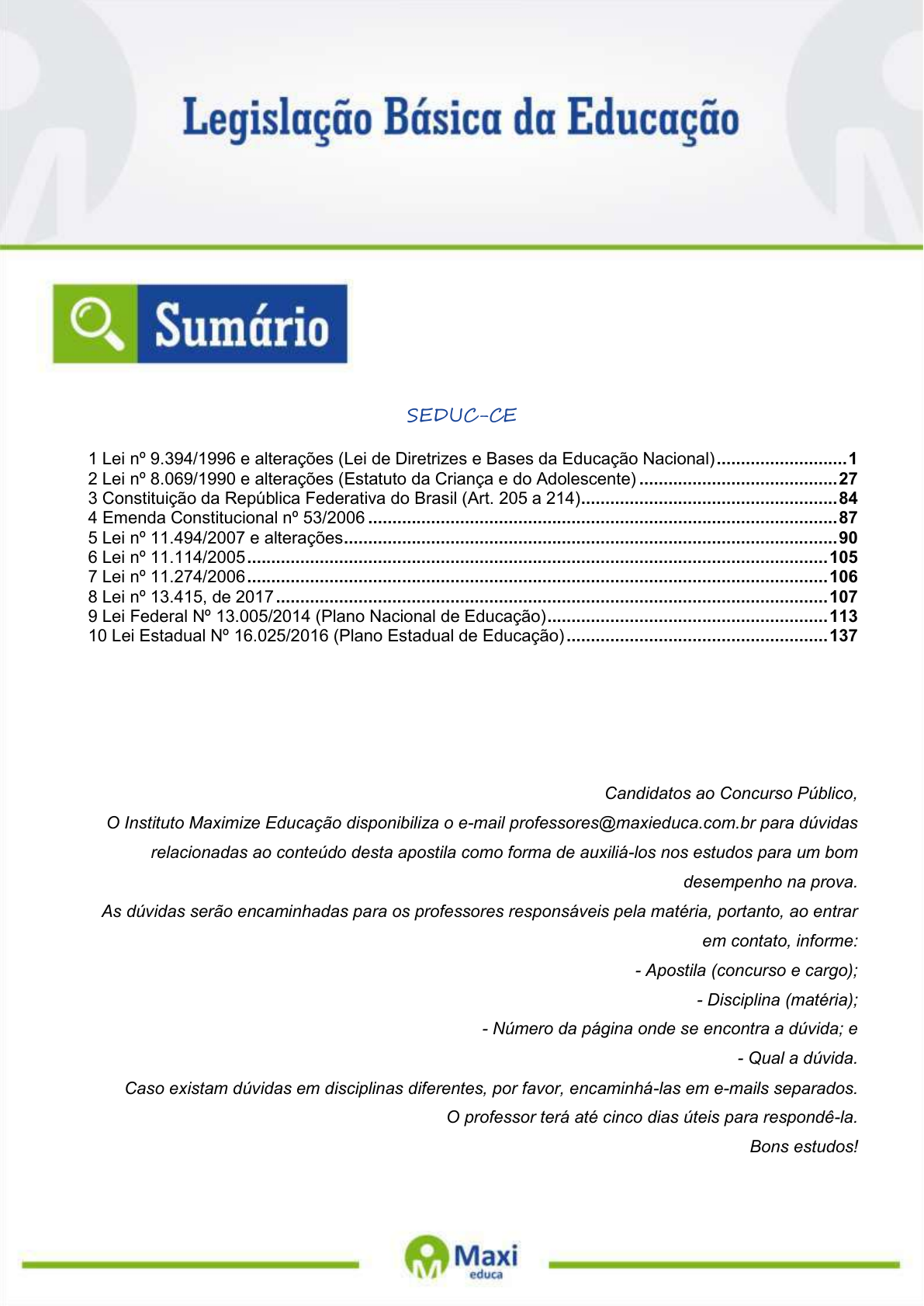 . 1 SEDUC-CE 1 Lei nº 9.394/1996 e alterações (Lei de Diretrizes e Bases da Educação Nacional) ........................... 1 2 Lei nº 8.069/1990 e alterações (Estatuto da Criança e do Adolescente) ......................................... 27 3 Constituição da República Federativa do Brasil (Art. 205 a 214) ..................................................... 84 4 Emenda Constitucional nº 53/2006 ................................................................................................. 87 5 Lei nº 11.494/2007 e alterações ...................................................................................................... 90 6 Lei nº 11.114/2005 ........................................................................................................................ 105 7 Lei nº 11.274/2006 ........................................................................................................................ 106 8 Lei nº 13.415, de 2017 .................................................................................................................. 107 9 Lei Federal Nº 13.005/2014 (Plano Nacional de Educação) .......................................................... 113 10 Lei Estadual Nº 16.025/2016 (Plano Estadual de Educação) ...................................................... 137 Candidatos ao Concurso Público, O Instituto Maximize Educação disponibiliza o e-mail professores@maxieduca.com.br para dúvidas relacionadas ao conteúdo desta apostila como forma de auxiliá-los nos estudos para um bom desempenho na prova. As dúvidas serão encaminhadas para os professores responsáveis pela matéria, portanto, ao entrar em contato, informe: - Apostila (concurso e cargo); - Disciplina (matéria); - Número da página onde se encontra a dúvida; e - Qual a dúvida. Caso existam dúvidas em disciplinas diferentes, por favor, encaminhá-las em e-mails separados. O professor terá até cinco dias úteis para respondê-la. Bons estudos! Apostila gerada especialmente para: JONATHAN DE SOUZA NETO VELLOSO 131.287.977-73 . 1 Caro(a) candidato(a), antes de iniciar nosso estudo, queremos nos colocar à sua disposição, durante todo o prazo do concurso para auxiliá-lo em suas dúvidas e receber suas sugestões. Muito zelo e técnica foram empregados na edição desta obra. No entanto, podem ocorrer erros de digitação ou dúvida conceitual. Em qualquer situação, solicitamos a comunicação ao nosso serviço de atendimento ao cliente para que possamos esclarecê-lo. Entre em contato conosco pelo e-mail: professores@maxieduca.com.br LEI Nº 9.394, DE 20 DE DEZEMBRO DE 19961 LEI DAS DIRETRIZES E BASES DA EDUCAÇÃO NACIONAL Estabelece as diretrizes e bases da educação nacional. O PRESIDENTE DA REPÚBLICA Faço saber que o Congresso Nacional decreta e eu sanciono a seguinte Lei: TÍTULO I Da Educação Art. 1º A educação abrange os processos formativos que se desenvolvem na vida familiar, na convivência humana, no trabalho, nas instituições de ensino e pesquisa, nos movimentos sociais e organizações da sociedade civil e nas manifestações culturais. § 1º Esta Lei disciplina a educação escolar, que se desenvolve, predominantemente, por meio do ensino, em instituições próprias. § 2º A educação escolar deverá vincular-se ao mundo do trabalho e à prática social. TÍTULO II Dos Princípios e Fins da Educação Nacional Art. 2º A educação, dever da família e do Estado, inspirada nos princípios de liberdade e nos ideais de solidariedade humana, tem por finalidade o pleno desenvolvimento do educando, seu preparo para o exercício da cidadania e sua qualificação para o trabalho. Art. 3º O ensino será ministrado com base nos seguintes princípios: I - igualdade de condições para o acesso e permanência na escola; II - liberdade de aprender, ensinar, pesquisar e divulgar a cultura, o pensamento, a arte e o saber; III - pluralismo de ideias e de concepções pedagógicas; IV - respeito à liberdade e apreço à tolerância; V - coexistência de instituições públicas e privadas de ensino; VI - gratuidade do ensino público em estabelecimentos oficiais; VII - valorização do profissional da educação escolar; VIII - gestão democrática do ensino público, na forma desta Lei e da legislação dos sistemas de ensino; IX - garantia de padrão de qualidade; X - valorização da experiência extraescolar; XI - vinculação entre a educação escolar, o trabalho e as práticas sociais. XII - consideração com a diversidade étnico-racial. XIII - garantia do direito à educação e à aprendizagem ao longo da vida. (Incluído pela Lei nº 13.632, de 2018) TÍTULO III Do Direito à Educação e do Dever de Educar Art. 4º O dever do Estado com educação escolar pública será efetivado mediante a garantia de: I - educação básica obrigatória e gratuita dos 4 (quatro) aos 17 (dezessete) anos de idade, organizada da seguinte forma: 1http://www.planalto.gov.br/ccivil_03/LEIS/l9394.htm. Acesso em 25/07/2018 às 15h15min. 1 Lei nº 9.394/1996 e alterações (Lei de Diretrizes e Bases da Educação Nacional) Apostila gerada especialmente para: JONATHAN DE SOUZA NETO VELLOSO 131.287.977-73 . 2 a) pré-escola; b) ensino fundamental; c) ensino médio; II - educação infantil gratuita às crianças de até 5 (cinco) anos de idade; III - atendimento educacional especializado gratuito aos educandos com deficiência, transtornos globais do desenvolvimento e altas habilidades ou superdotação, transversal a todos os níveis, etapas e modalidades, preferencialmente na rede regular de ensino; IV - acesso público e gratuito aos ensinos fundamental e médio para todos os que não os concluíram na idade própria; V - acesso aos níveis mais elevados do ensino, da pesquisa e da criação artística, segundo a capacidade de cada um; VI - oferta de ensino noturno regular, adequado às condições do educando; VII - oferta de educação escolar regular pa