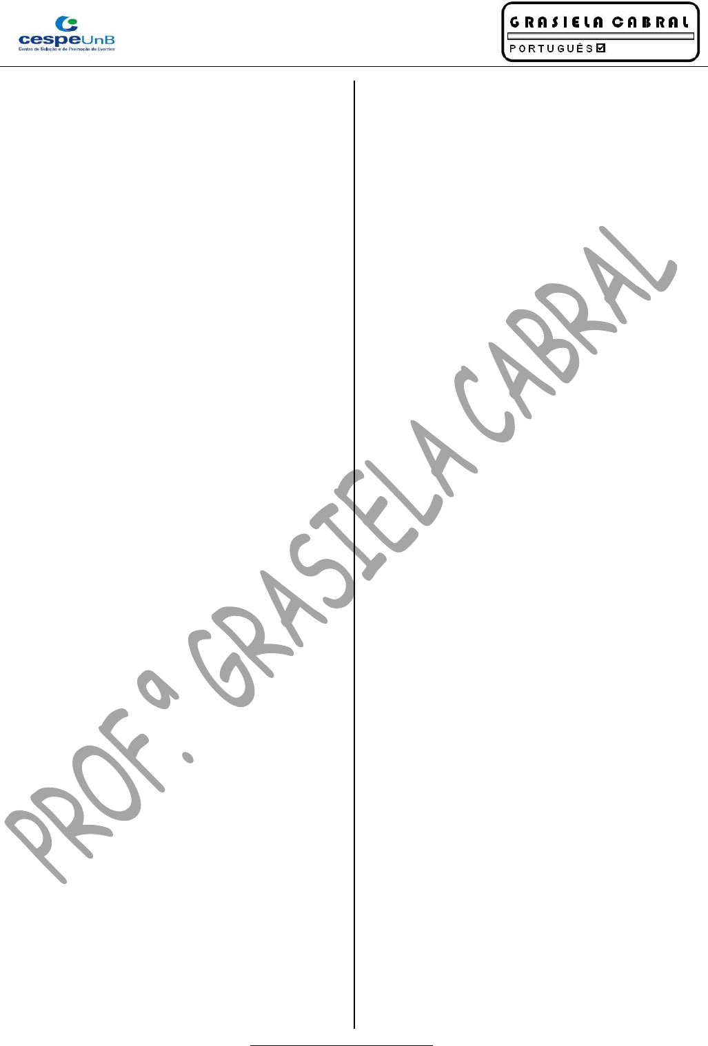 Fan Page: GRASIELA CABRAL -10- 3) C 4) C 5) C 6) C 7) E 8) C 9) B 10) E 11) C 12) E 13) E 14) E 15) E 16) E 17) E 18) E 19) E 20) E 21) E 22) E 23) E 24) E 25) E 26) E 27) C TEMPO COMPOSTO 01) (CESPE / UNB / TSE / 2007) A cidade estivera agitada por motivos de ordem técnica e politécnica. A substituição de “estivera” por tinha estado prejudica a correção gramatical do período. 02) (UnB / CESPE / SEPLAG / DFTRANS / Analista / 2008) As estradas da Grã-Bretanha tinham sido construídas pelos romanos, e os sulcos foram escavados por carruagens romanas. Devido ao valor de mais-que-perfeito das duas formas verbais, preservam-se a coerência textual e a correção gramatical ao se substituir “tinham sido” por havia sido. 03) (UnB / CESPE / PETROBRAS / SUPERIOR / 2008) A mesma relação de tempo estabelecida pela forma verbal “fizera”, em “Hans Lipperhey fizera uma descoberta revolucionária”, é verificada em (A) “Contudo, uma de suas invenções mudaria o destino do cientista e o rumo da astronomia”. (B) “capazes de fazer com que objetos distantes parecessem próximos”. (C) “Com a ajuda do utensílio, Galileu conseguiu ver”. (D) “o que jamais qualquer outro astrônomo havia visto”. (E) “o que contradizia a crença dos defensores do geocentrismo”. 04) (UnB / CESPE / PETROBRAS / SUPERIOR / 2008) Desde 1947, a opinião pública brasileira foi confrontada com essa duplicidade de atitudes, intensificada pela campanha O Petróleo É Nosso, que alguns chegam a considerar tão intensa e apaixonante, no século XX, quanto fora a da abolição da escravatura, no século XIX. O texto apresentaria incorreção gramatical e a coerência entre seus argumentos seria prejudicada caso se procedesse à substituição de “fora” por havia sido. GABARITO 1) E 2) E 3) D 4) E CONJUGAÇÃO 01) (UnB / CESPE / SEPLAG / DFTRANS / Analista / 2008) Preservam-se a coerência textual e a correção gramatical ao se empregar a oração flexionada no modo subjuntivo para que cabessem em lugar de usá-la no infinitivo,“para caber”. 02) (UnB / CESPE / Delegado de Polícia Civil / 2006) Considerando os trechos abaixo, que constituem um texto, assinale a opção incorreta no que se refere ao emprego das classes de palavras e suas flexões. (A) A técnica de estabelecer freios ao poder na linha da tradição ocidental não é o único caminho possível para a vigência dos direitos humanos. (B) Não é da essência de um regime de direitos humanos a separação entre o domínio jurídico e os outros domínios da existência humana, como os domínios religioso, moral e social. (C) O Ocidente repetirá hoje os mesmos erros do passado se insistir na existência de um modelo único para a expressão e a proteção dos direitos humanos. (D) Estados Unidos e Europa desrespeitaram a autonomia de destino de cada povo se tentarem impor sua verdade, sua economia, seu modo de vida, seus direitos humanos. 03) (UnB / CESPE / PCES / Agente de Polícia Civil / 2009) Com a mesma correção gramatical de “Se nos dedicarmos”, estão conjugados os verbos ver, em Se vermos uma estrela cadente, faremos um pedido, e pôr, em Se pusermos a mão no fogo, nos queimaremos.