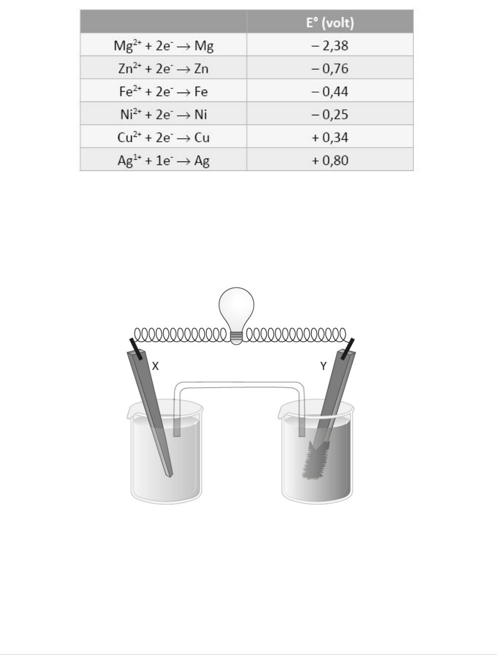Lista de questões selecionadas INST PRESBITERIANO GAMMON - Guanhães Questão 01 O processo de corrosão dos metais se dá em virtude das reações de oxidorredução entres esses e outros agentes naturais como o oxigênio presente no ar. O potencial de redução desses metais costuma ser menor do que o do oxigênio, e por isso eles cedem seus elétrons, oxidando-se. [...] Buscando proteger o ferro (Fe) dos seus anzóis da corrosão pelo oxigênio atmosférico, um pescador decidiu revesti-los com um metal de sacrifício, ou seja, um metal que sofre oxidação, evitando a oxidação do material. Considerando os potenciais padrão de redução para os metais a seguir, assinale a alternativa que indica todos os metais, dentre os expostos, que poderiam ser utilizados pelo pescador com essa finalidade. A) Ag e Mg B) Ag, Cu e Ni C) Apenas Ni D) Mg e Zn E) Apenas Zn Questão 02 A seguir está representado o esquema de uma pilha, cujos eletrodos são as barras metálicas dos metais X e Y. Com base no esquema apresentado e nos processos eletroquímicos envolvidos no funcionamento de uma pilha, é correto afirmar que A) no eletrodo do metal X ocorre a redução. B) no eletrodo do metal Y está ocorrendo a oxidação. C) os elétrons fluem de Y para X. D) o metal Y apresenta maior potencial de redução. E) a solução do eletrodo X perde cátions do metal X. Questão 03 “A bateria de mercúrio é muito utilizada na medicina e na indústria eletrônica e é mais cara que a pilha seca comum”. A seguir são fornecidas as duas semirreações que ocorrem no funcionamento dessa pilha. Observação: Zn(Hg) indica que é uma liga metálica de Zn e Hg. Zn(Hg) + 2OH–(aq) ZnO(s) + H2O(d) + 2e– HgO(s) + H2O(d) + 2e– Hg(d) + 2OH–(aq) Assinale a alternativa correta com relação às semirreações que ocorrem nessa pilha. A) Zn sofre redução. B) Hg sofre oxidação. C) Zn é o agente oxidante. D) HgO sofre oxidação. E) HgO é o agente oxidante. Questão 04 Para que uma eletrólise ocorra, é necessária a presença de íons livres. Uma forma de liberar esses íons é através da fusão do composto (eletrólise ígnea), sendo que a dissolução do eletrólito em água (eletrólise aquosa) constitui uma outra forma mais econômica. Para um mesmo composto, NaCl, realizando, respectivamente, os dois tipos de eletrólise, ígnea e aquosa, serão formados: A) cátodo: sódio metálico em ambos os processos ânodo: cloro gasoso em ambos os processos B) cátodo: sódio metálico em ambos os processos ânodo: cloro gasoso e oxigênio gasoso C) cátodo: sódio metálico e hidrogênio gasoso ânodo: cloro gasoso em ambos os processos D) cátodo: sódio metálico e hidrogênio gasoso ânodo: cloro gasoso e oxigênio gasoso E) cátodo: sódio metálico e hidrogênio gasoso ânodo: oxigênio gasoso em ambos os processos Questão 05 Observe o esquema da pilha e os potenciais padrão de redução do magnésio e do cobre: Sobre o funcionamento e os componentes desse dispositivo, são feitas as seguintes afirmações: I. A massa da lâmina de cobre aumenta ao longo do tempo. II. A lâmina de magnésio corresponde ao cátodo. III. A placa porosa atua, nesse caso, de modo semelhante a uma ponte salina. IV. A diferença de potencial fornecida pela pilha é de +2,03 V, denotando o caráter espontâneo da reação. São corretas apenas as afirmações A) II e IV. B) I, II e III. C) II e III. D) I e III. E) I e IV. Questão 06 A célula galvânica (pilha) é um dispositivo no qual a ocorrência de uma reação espontânea de oxidação-redução gera corrente elétrica. Uma pilha de zinco e níquel é constituída de dois compartimentos: um contendo uma placa de zinco mergulhada em uma solução aquosa de sulfato de zinco e o outro, contendo uma placa de níquel mergulhada em uma solução aquosa de sulfato de níquel. As placas estão interligadas através de um fio condutor elétrico, e uma ponte salina de cloreto de potássio unindo as duas soluções. O sistema descrito é representado pela figura a seguir. Dado os potenciais padrões de redução dos metais: Eº Zn = -0,76V e Eº Ni = -0,23V. Considerando a pilha em funcionamento nas condições padrões (concentração das soluções 1,0 mol/L e temperatura 25ºC), assinale a alternativa CORRETA. A) O sinal do anodo é positivo, o sinal do catodo é negativo e o potencial padrão da pilha é +0,99 V. B) No anodo, ocorre a redução do zinco e no catodo ocorre a oxidação do níquel. O fluxo de elétrons vai do catodo para o anodo através do fio condutor. C) À medida que a reação avança, a concentração de íons níquel (Ni2+) diminui na solução da direita (catodo) e a concentração de íons zinco (Zn2+) aumenta na solução da esquerda (anodo). D) A ponte salina serve para manter o contato iônico sendo que os íons cloretos (Cl- ) migram para solução da direita (catodo) enquanto que os íons potássio (K+ ) migram para solução da esquerda (anodo). Questão 07 As baterias de chumbo, conhecidas como chumbo/ácido, são usadas em sistemas de fornecimento de energia elétrica ininterrupta (nobreak), em que o ânodo é constituído de chumbo metálico e o cátodo, de óxido de chumbo (IV). As semirreações no sentido da descarga da bateria são representadas pelas equações: Considerando as semirreações nos eletrodos da bateria chumbo/ácido e os potenciais-padrão de redução medidos a 25°C, o polo positivo dessa bateria e o valor da diferença de potencial da reação global são A) cátodo e +1,32 V. B) cátodo e −1,32 V. C) cátodo e +2,04 V. D) ânodo e +2,04 V. E) ânodo e −2,04 V. Questão 08 Uma pilha de cobre e cádmio pode ser construída mergulhando-se eletrodos desses metais, respectivamente, em soluções de sais de Cu2+(aq) e Cd2+(aq), isolados por meio de ponte salina. Admitindo-se que os potenciais-padrão de redução, E° , do cobre e do cádmio, são, respectivamente, +0,337V e -0,403V, em relação a essa pilha, pode-se af