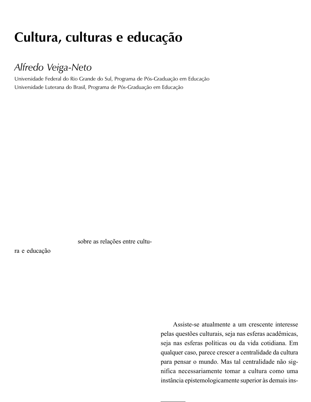 Cultura, culturas e educação Revista Brasileira de Educação 5 Introdução Escrever algo novo sobre as relações entre cultu- ra e educação é um desafio. O que já se disse sobre esse binômio... Ainda assim, ele parece sempre novo, sempre aí a nos desafiar, com as suas mais de mil e uma faces, com as suas infinitas possibilidades. Isso decorre em parte da própria complexidade e múltiplos sentidos dos dois termos do binômio; uma rápida con- sulta a algum manual de antropologia ou de pedagogia revelará a notável polissemia dessas duas palavras e até mesmo fortes desacordos entre aqueles que falam delas. E quantas não vêm sendo as suas ressignificações ao longo da história... Tais ressignificações vêm proli- ferando especialmente nas últimas décadas. Como em nenhum outro momento, parecem tornar-se cada vez mais visíveis as diferenças culturais. Igualmente, mais do que nunca, têm sido freqüentes e fortes tanto os em- bates sobre a diferença e entre os diferentes, quanto a opressão de alguns sobre os outros, seja na busca da exploração econômica e material, seja nas práticas de dominação e imposição de valores, significados e sis- temas simbólicos de um grupo sobre os demais. Os muitos entendimentos de hoje sobre o que seja cultura,1 sobre o que seja educação e sobre as rela- ções entre ambos se encontram no centro de tais em- bates. Nesse contexto, o próprio papel atribuído à educação acabou transformando a pedagogia – enquan- to campo dos saberes – e a escola – enquanto institui- ção – em arenas privilegiadas, onde se dão violentos choques teóricos e práticos em torno de infinitas ques- tões culturais. E, como todos sabemos, tais embates envolvem argumentos, ações e estratégias que extra- vasam largamente o plano puramente intelectual. Assiste-se atualmente a um crescente interesse pelas questões culturais, seja nas esferas acadêmicas, seja nas esferas políticas ou da vida cotidiana. Em qualquer caso, parece crescer a centralidade da cultura para pensar o mundo. Mas tal centralidade não sig- nifica necessariamente tomar a cultura como uma instância epistemologicamente superior às demais ins- Cultura, culturas e educação Alfredo Veiga-Neto Universidade Federal do Rio Grande do Sul, Programa de Pós-Graduação em Educação Universidade Luterana do Brasil, Programa de Pós-Graduação em Educação 1 Por razões que serão explicitadas e discutidas ao longo deste texto, ora a palavra cultura é grafada com inicial maiúscula, ora com inicial minúscula. José Vinícius Highlight José Vinícius Highlight José Vinícius Highlight José Vinícius Highlight Alfredo Veiga-Neto 6 Maio/Jun/Jul/Ago 2003 Nº 23 tâncias sociais – como a política, a econômica, a edu- cacional; significa, sim, tomá-la como atravessando tudo aquilo que é do social. Assim, assiste-se hoje a uma verdadeira virada cultural, que pode ser resumi- da como o entendimento de que a cultura é central não porque ocupe um centro, uma posição única e privilegiada, mas porque perpassa tudo o que aconte- ce nas nossas vidas e todas as representações que fa- zemos desses acontecimentos (Hall, 1997). Essas são questões da mais alta relevância, tanto no campo acadêmico quanto no campo mais, diga- mos, “concreto” de nossas práticas sociais. Seria pre- ciso lembrar, por exemplo, que estamos assistindo a uma onda mundial de imposição do American way of life em nível planetário? E lembrar que, mais do que simples assistentes, estamos sendo levados a partici- par ativa ou passivamente dessa onda? Saibamos ou não e queiramos ou não, estamos enredados nessas questões. E seja como for, é preciso estarmos atentos a elas, discuti-las, problematizá-las, sabermos sobre o que estão (os outros) e estamos (nós) falando. É im- prescindível sabermos de onde vieram tais questões e para onde elas podem nos levar. Enfim, à conhecida pergunta nietzschiana “que estamos fazendo de nós mesmos?”, proponho que se acrescente “que estão fazendo de nós mesmos?”. Mas a proliferação semântica a que antes aludi é relativamente recente. Faz pouco tempo que o velho binômio parece estar se transformando em um poli- nômio bastante complexo, com muitas e muitas va- riáveis, com muitas e muitas incógnitas. Neste texto, pretendo trazer alguma contribuição não apenas para as discussões que estão sendo travadas em torno des- se polinômio mas, sobretudo, para as discussões que buscam compreender a proveniência e a emergência2 do conceito moderno de Cultura, bem como alguns comentários sobre os deslocamentos atuais deste con- ceito, dos quais resultou aquela proliferação. Penso que isso é útil para entender mais refinadamente as dificuldades que surgiram especialmente no campo da educação, a partir da emergência e dos avanços de uma epistemologia multicultural.3 São dificuldades que se colocam justamente quando, em vez de escre- vermos cultura e educação, passamos a escrever cul- turas e educação. Ao falar em “alguma contribuição”, faço três alertas. O primeiro: aqui, meu objetivo não é propor so- luções, nem fazer prescrições, nem tampouco julgar. O que quero é apenas tecer algumas considerações de ordem histórico-genealógica, de modo a mostrar o atrelamento da Pedagogia e da escola moderna à in- venção do conceito de Cultura, e o quanto isso pode funcionar como um obstáculo para as transformações educacionais e sociais que hoje pensamos ser neces- sárias. Assim, este texto tem um cunho analítico e, talvez, descritivo; quem nele quiser encontrar solu- ções práticas para as nossas dificuldades no cruza- mento da educação com a Cultura, sairá frustrado... Meu objetivo aqui não é apontar “o que podemos fa- zer para tornar o futuro melhor”, mas tão-somente pro- por uma problematização do presente a partir de uma descrição de como chegamos até aqui, de como se cons- tituiu um determina