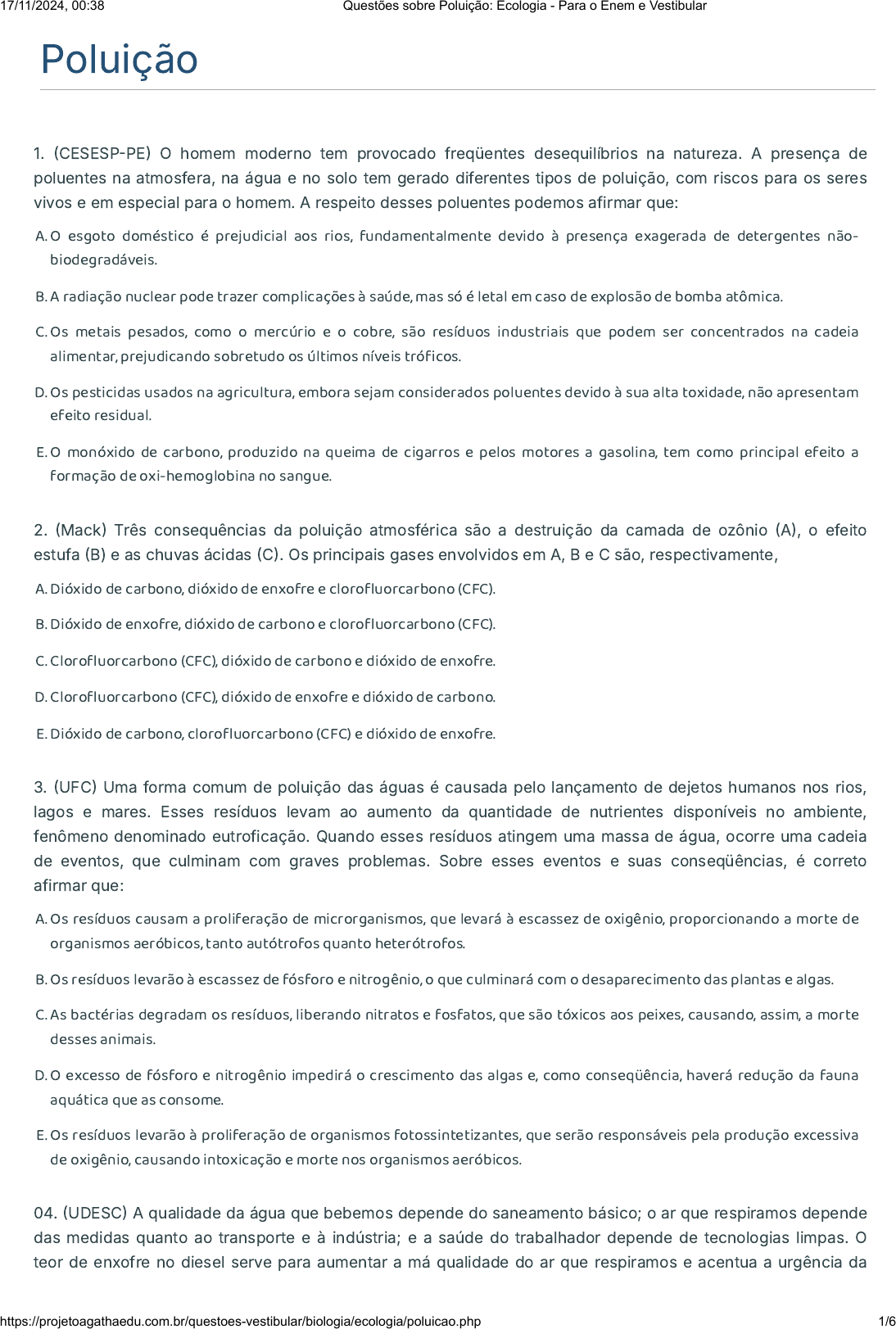 Poluição 1. �CESESP�PE� O homem moderno tem provocado freqüentes desequilíbrios na natureza. A presença de poluentes na atmosfera, na água e no solo tem gerado diferentes tipos de poluição, com riscos para os seres vivos e em especial para o homem. A respeito desses poluentes podemos afirmar que: A. O esgoto doméstico é prejudicial aos rios, fundamentalmente devido à presença exagerada de detergentes não- biodegradáveis. B. A radiação nuclear pode trazer complicações à saúde, mas só é letal em caso de explosão de bomba atômica. C. Os metais pesados, como o mercúrio e o cobre, são resíduos industriais que podem ser concentrados na cadeia alimentar, prejudicando sobretudo os últimos níveis tró�cos. D. Os pesticidas usados na agricultura, embora sejam considerados poluentes devido à sua alta toxidade, não apresentam efeito residual. E. O monóxido de carbono, produzido na queima de cigarros e pelos motores a gasolina, tem como principal efeito a formação de oxi-hemoglobina no sangue. 2. �Mack� Três consequências da poluição atmosférica são a destruição da camada de ozônio �A�, o efeito estufa �B) e as chuvas ácidas �C�. Os principais gases envolvidos em A, B e C são, respectivamente, A. Dióxido de carbono, dióxido de enxofre e cloro�uorcarbono (CFC). B. Dióxido de enxofre, dióxido de carbono e cloro�uorcarbono (CFC). C. Cloro�uorcarbono (CFC), dióxido de carbono e dióxido de enxofre. D. Cloro�uorcarbono (CFC), dióxido de enxofre e dióxido de carbono. E. Dióxido de carbono, cloro�uorcarbono (CFC) e dióxido de enxofre. 3. �UFC� Uma forma comum de poluição das águas é causada pelo lançamento de dejetos humanos nos rios, lagos e mares. Esses resíduos levam ao aumento da quantidade de nutrientes disponíveis no ambiente, fenômeno denominado eutroficação. Quando esses resíduos atingem uma massa de água, ocorre uma cadeia de eventos, que culminam com graves problemas. Sobre esses eventos e suas conseqüências, é correto afirmar que: A. Os resíduos causam a proliferação de microrganismos, que levará à escassez de oxigênio, proporcionando a morte de organismos aeróbicos, tanto autótrofos quanto heterótrofos. B. Os resíduos levarão à escassez de fósforo e nitrogênio, o que culminará com o desaparecimento das plantas e algas. C. As bactérias degradam os resíduos, liberando nitratos e fosfatos, que são tóxicos aos peixes, causando, assim, a morte desses animais. D. O excesso de fósforo e nitrogênio impedirá o crescimento das algas e, como conseqüência, haverá redução da fauna aquática que as consome. E. Os resíduos levarão à proliferação de organismos fotossintetizantes, que serão responsáveis pela produção excessiva de oxigênio, causando intoxicação e morte nos organismos aeróbicos. 04. �UDESC� A qualidade da água que bebemos depende do saneamento básico; o ar que respiramos depende das medidas quanto ao transporte e à indústria; e a saúde do trabalhador depende de tecnologias limpas. O teor de enxofre no diesel serve para aumentar a má qualidade do ar que respiramos e acentua a urgência da 17/11/2024, 00:38 Questões sobre Poluição: Ecologia - Para o Enem e Vestibular https://projetoagathaedu.com.br/questoes-vestibular/biologia/ecologia/poluicao.php 1/6 adoção de medidas imediatas e de um plano nacional de qualidade do ar. Sobre esse assunto assinale a alternativa incorreta. A. Para melhorar a qualidade do ar, com medidas muito além do teor de enxofre, há que investir pesado nos transportes sobre trilhos, como trens e metrô, na integração dos meios de transporte e no combate aos engarrafamentos. B. Nosso diesel é de péssima qualidade: no interior há o S2000 - que tem duas mil partes por milhão (PPMs) de enxofre - e nas regiões metropolitanas há o S500 - com quinhentas PPMs de enxofre. Para termos uma base de comparação, na Europa já é obrigatório o S50 e, a partir de 2010, será permitido apenas o S10, com dez PPMs de enxofre. C. Apesar de não haver comprovação cientí�ca, há suspeitas de que o dióxido de enxofre tenha provocado a morte de 3.000 mulheres e milhares de internações por doenças respiratórias, só na cidade de São Paulo. D. Um veículo desregulado emite até 40% a mais de poluição, devido à carburação imperfeita, e consome mais combustível. Isso representa um rombo no clima e nos pulmões. A emissão do gás metano nos lixões deve ser evitada e o metano convertido em energia. E. Em 2002, o Conselho Nacional de Meio Ambiente (Conama) aprovou uma resolução (que tem força de lei) determinando que, a partir de 2009, os novos veículos a diesel, como caminhões e ônibus, deverão sair da fábrica com uma emissão atmosférica máxima correspondente à gerada pelo motor Euro 4 e pelo diesel S50 (com 50 partes por milhão de enxofre). 05. �VUNESP� Nos rios, é lançada, geralmente, grande quantidade de esgoto, provocando, em alguns casos, a morte de muitos peixes. Assinale a alternativa que melhor explica a mortalidade desses animais: A. Aumento na quantidade de oxigênio e diminuição na quantidade de bactérias anaeróbicas. B. Aumento na quantidade de bactérias anaeróbicas e conseqüente aumento na quantidade de oxigênio. C. Diminuição na quantidade de oxigênio e aumento na quantidade de bactérias anaeróbicas. D. Aumento no número de indivíduos herbívoros que eliminam grande parte de �toplâncton. E. Diminuição da quantidade de alimento com conseqüente mortandade dos peixes, a longo prazo. 06. �UFPA� Se considerarmos que existe uma relação direta entre a crise ambiental que o planeta enfrenta atualmente e a lógica da acumulação capitalista, qual das afirmações abaixo NÃO JUSTIFICA esta afirmação? A. As estruturas de poder que controlam o uso dos recursos naturais e do meio ambiente comum estão baseadas no cálculo econômico privado das empresas, e este cálcul