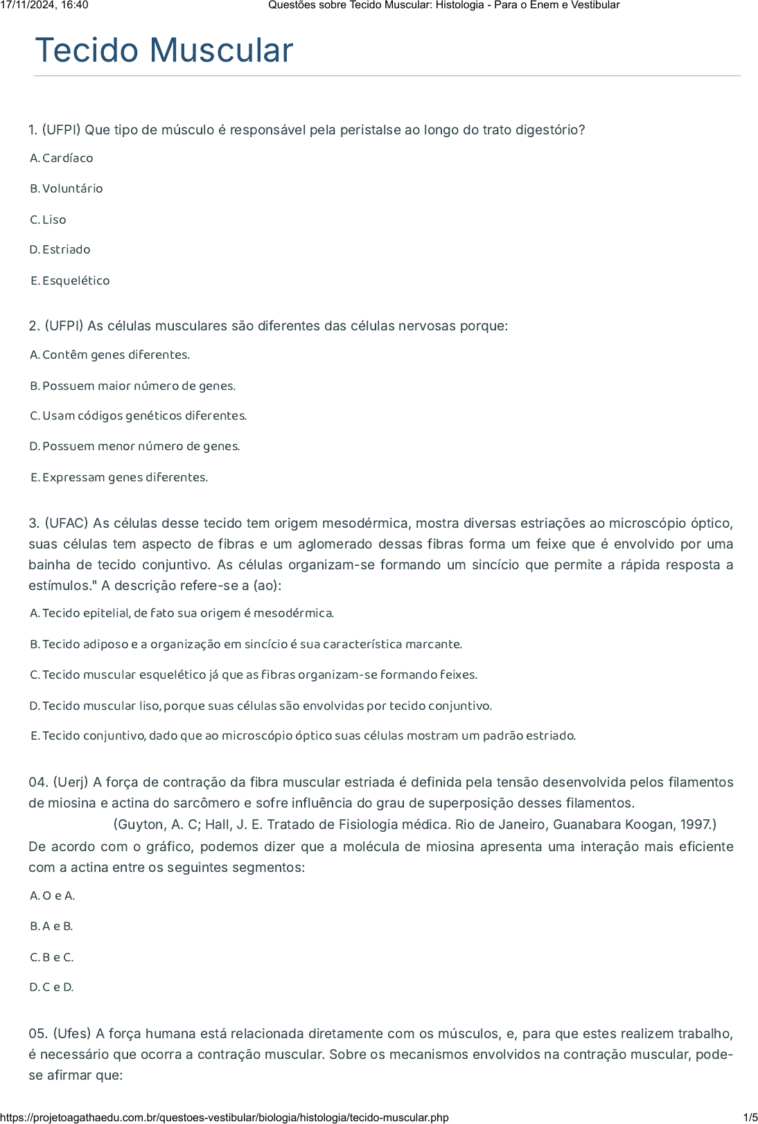 Tecido Muscular 1. �UFPI� Que tipo de músculo é responsável pela peristalse ao longo do trato digestório? A. Cardíaco B. Voluntário C. Liso D. Estriado E. Esquelético 2. �UFPI� As células musculares são diferentes das células nervosas porque: A. Contêm genes diferentes. B. Possuem maior número de genes. C. Usam códigos genéticos diferentes. D. Possuem menor número de genes. E. Expressam genes diferentes. 3. �UFAC� As células desse tecido tem origem mesodérmica, mostra diversas estriações ao microscópio óptico, suas células tem aspecto de fibras e um aglomerado dessas fibras forma um feixe que é envolvido por uma bainha de tecido conjuntivo. As células organizam-se formando um sincício que permite a rápida resposta a estímulos." A descrição refere-se a (ao): A. Tecido epitelial, de fato sua origem é mesodérmica. B. Tecido adiposo e a organização em sincício é sua característica marcante. C. Tecido muscular esquelético já que as �bras organizam-se formando feixes. D. Tecido muscular liso, porque suas células são envolvidas por tecido conjuntivo. E. Tecido conjuntivo, dado que ao microscópio óptico suas células mostram um padrão estriado. 04. �Uerj� A força de contração da fibra muscular estriada é definida pela tensão desenvolvida pelos filamentos de miosina e actina do sarcômero e sofre influência do grau de superposição desses filamentos. �Guyton, A. C; Hall, J. E. Tratado de Fisiologia médica. Rio de Janeiro, Guanabara Koogan, 1997.) De acordo com o gráfico, podemos dizer que a molécula de miosina apresenta uma interação mais eficiente com a actina entre os seguintes segmentos: A. O e A. B. A e B. C. B e C. D. C e D. 05. �Ufes� A força humana está relacionada diretamente com os músculos, e, para que estes realizem trabalho, é necessário que ocorra a contração muscular. Sobre os mecanismos envolvidos na contração muscular, pode- se afirmar que: 17/11/2024, 16:40 Questões sobre Tecido Muscular: Histologia - Para o Enem e Vestibular https://projetoagathaedu.com.br/questoes-vestibular/biologia/histologia/tecido-muscular.php 1/5 A. A miosina é responsável pela conversão da energia da hidrólise do ATP em movimento, devido à presença dos íons de ferro. B. A quimiossíntese ocorre nas células musculares, onde o ácido pirúvico é transformado em ácido lático, o que garante ATP em situações de emergência. C. O deslizamento durante a contração muscular ocorre quando as cabeças da miosina se prendem �rmemente à actina, dobrando-se sobre o resto da molécula da miosina e permanecendo assim inde�nidamente. D. O glicogênio armazenado nas células musculares pode ser convertido em ATP por meio de processos de fermentação alcoólica, o que causa dor e intoxicação das �bras musculares. E. A energia obtida do ATP confere à miosina uma con�guração instável de alta energia potencial e faz com que ela puxe as �bras de actina, realizando o trabalho. 06. �PUC�MG� São dadas abaixo algumas características de três tipos de tecido muscular animal: I. Possui apenas um núcleo, com contração relativamente lenta. II. Apresenta células cilíndricas extremamente longas, multinucleadas, de contração rápida e voluntária. III. Tem células normalmente mononucleadas, de contrações rápidas e involuntárias, com presença de discos intercalares As características se referem, respectivamente, aos seguintes tecidos musculares: A. Liso, estriado esquelético e estriado cardíaco. B. Estriado esquelético, liso e estriado cardíaco. C. Estriado cardíaco, liso e estriado esquelético. D. Liso, estriado cardíaco e estriado esquelético. E. Estriado cardíaco, estriado esquelético e liso. 07. �UNICAMP� O tecido muscular cardíaco apresenta fibras A. Lisas, de contração voluntária e aeróbia. B. Lisas, de contração involuntária e anaeróbia. C. Estriadas, de contração voluntária e anaeróbia. D. Estriadas, de contração involuntária e aeróbia. 08. �UECE� Analise as afirmações a seguir: I. Os discos intercalares são as junções do tipo gap, apresentadas pelas células musculares estriadas cardíacas nas ramificações de conexão com as células vizinhas. II. O tecido muscular cardíaco é de natureza lisa porque sua contração é involuntária. III. A musculatura lisa é encontrada em órgãos viscerais como o estômago e o intestino, daí sua denominação de tecido muscular visceral. É correto o que se afirma em A. I e II, apenas. B. I e III, apenas. C. II e III, apenas. D. I, II e III. 17/11/2024, 16:40 Questões sobre Tecido Muscular: Histologia - Para o Enem e Vestibular https://projetoagathaedu.com.br/questoes-vestibular/biologia/histologia/tecido-muscular.php 2/5 09. �PUC�PR� Os músculos são encontrados ao longo do corpo, desde membros superiores, inferiores, até em órgãos como estômago, coração, pulmão, entre outros. Sobre a estrutura desses tecidos e suas características, marque a alternativa CORRETA. A. As células musculares lisas apresentam uma contração voluntária e rápida, comum nos sistemas digestório e respiratório. B. As altas concentrações de ácido lático no músculo acontecem devido ao repouso intenso de um indivíduo. C. O coração possui células musculares plurinucleadas, de contração voluntária e rápida. D. Toda célula muscular é multinucleada, possui um alto gasto energético, é rica em micro�lamentos e, na ausência de oxigênio, produz ácido lático. E. Durante uma contração muscular, os �lamentos de actina deslizam sobre os de miosina, contexto em que o cálcio desempenha um importante papel. 10. �UCPEL� Entre os tecidos animais, há um cuja evolução foi fundamental para o sucesso evolutivo dos seres heterotróficos. O tipo de tecido em questão e sua importância é o A. Tecido nervoso que permitiu coordenar as diferentes partes do corpo dos animais, por ser um tecido de ação lenta