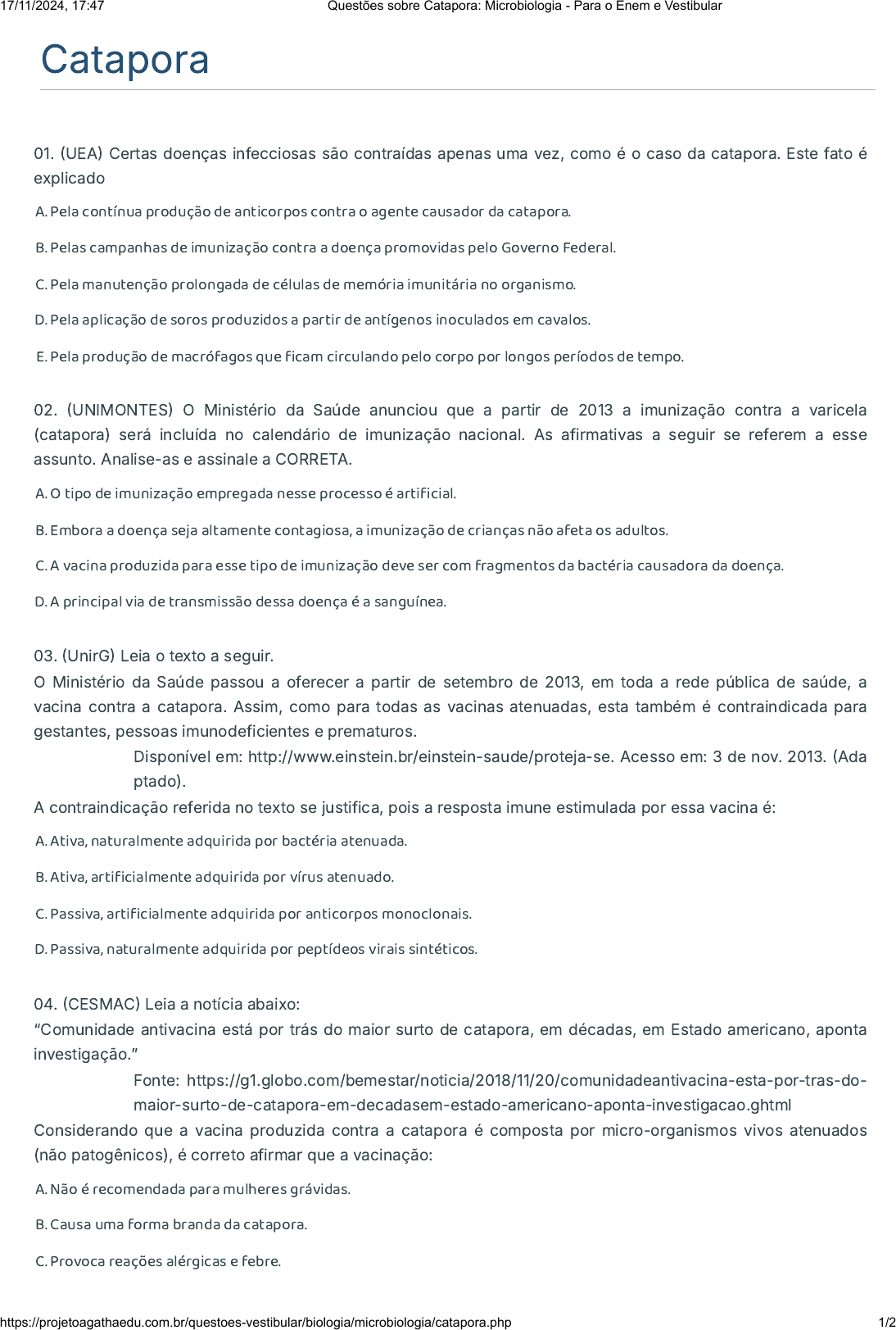 Catapora 01. �UEA� Certas doenças infecciosas são contraídas apenas uma vez, como é o caso da catapora. Este fato é explicado A. Pela contínua produção de anticorpos contra o agente causador da catapora. B. Pelas campanhas de imunização contra a doença promovidas pelo Governo Federal. C. Pela manutenção prolongada de células de memória imunitária no organismo. D. Pela aplicação de soros produzidos a partir de antígenos inoculados em cavalos. E. Pela produção de macrófagos que �cam circulando pelo corpo por longos períodos de tempo. 02. �UNIMONTES� O Ministério da Saúde anunciou que a partir de 2013 a imunização contra a varicela (catapora) será incluída no calendário de imunização nacional. As afirmativas a seguir se referem a esse assunto. Analise-as e assinale a CORRETA. A. O tipo de imunização empregada nesse processo é arti�cial. B. Embora a doença seja altamente contagiosa, a imunização de crianças não afeta os adultos. C. A vacina produzida para esse tipo de imunização deve ser com fragmentos da bactéria causadora da doença. D. A principal via de transmissão dessa doença é a sanguínea. 03. �UnirG� Leia o texto a seguir. O Ministério da Saúde passou a oferecer a partir de setembro de 2013, em toda a rede pública de saúde, a vacina contra a catapora. Assim, como para todas as vacinas atenuadas, esta também é contraindicada para gestantes, pessoas imunodeficientes e prematuros. Disponível em: http://www.einstein.br/einstein-saude/proteja-se. Acesso em: 3 de nov. 2013. �Ada ptado). A contraindicação referida no texto se justifica, pois a resposta imune estimulada por essa vacina é: A. Ativa, naturalmente adquirida por bactéria atenuada. B. Ativa, arti�cialmente adquirida por vírus atenuado. C. Passiva, arti�cialmente adquirida por anticorpos monoclonais. D. Passiva, naturalmente adquirida por peptídeos virais sintéticos. 04. �CESMAC� Leia a notícia abaixo: “Comunidade antivacina está por trás do maior surto de catapora, em décadas, em Estado americano, aponta investigação.” Fonte: https://g1.globo.com/bemestar/noticia/2018/11/20/comunidadeantivacina-esta-por-tras-do- maior-surto-de-catapora-em-decadasem-estado-americano-aponta-investigacao.ghtml Considerando que a vacina produzida contra a catapora é composta por micro-organismos vivos atenuados (não patogênicos), é correto afirmar que a vacinação: A. Não é recomendada para mulheres grávidas. B. Causa uma forma branda da catapora. C. Provoca reações alérgicas e febre. 17/11/2024, 17:47 Questões sobre Catapora: Microbiologia - Para o Enem e Vestibular https://projetoagathaedu.com.br/questoes-vestibular/biologia/microbiologia/catapora.php 1/2 D. Diminui a imunidade contra outras doenças. E. É necessária em indivíduos já anteriormente acometidos pela doença. Gabarito 1.C 2.A 3.B 4.A Gabarito com Resolução Clique Para Compartilhar Esta Página Nas Redes Sociais Imprimir WhatsApp Facebook Twitter Pinterest Linkedin E-Mail 17/11/2024, 17:47 Questões sobre Catapora: Microbiologia - Para o Enem e Vestibular https://projetoagathaedu.com.br/questoes-vestibular/biologia/microbiologia/catapora.php 2/2 https://projetoagathaedu.com.br/questoes-vestibular/resolucao-biologia/microbiologia/catapora.php https://projetoagathaedu.com.br/questoes-vestibular/resolucao-biologia/microbiologia/catapora.php https://projetoagathaedu.com.br/questoes-vestibular/resolucao-biologia/microbiologia/catapora.php https://projetoagathaedu.com.br/questoes-vestibular/biologia/microbiologia/catapora.php https://projetoagathaedu.com.br/questoes-vestibular/biologia/microbiologia/catapora.php https://api.whatsapp.com/send?text=Quest%C3%B5es%20sobre%20Catapora%3A%20Microbiologia%20-%20Para%20o%20Enem%20e%20Vestibular%20https%3A%2F%2Fprojetoagathaedu.com.br%2Fquestoes-vestibular%2Fbiologia%2Fmicrobiologia%2Fcatapora.php https://api.whatsapp.com/send?text=Quest%C3%B5es%20sobre%20Catapora%3A%20Microbiologia%20-%20Para%20o%20Enem%20e%20Vestibular%20https%3A%2F%2Fprojetoagathaedu.com.br%2Fquestoes-vestibular%2Fbiologia%2Fmicrobiologia%2Fcatapora.php https://www.facebook.com/sharer/sharer.php?u=https%3A%2F%2Fprojetoagathaedu.com.br%2Fquestoes-vestibular%2Fbiologia%2Fmicrobiologia%2Fcatapora.php https://www.facebook.com/sharer/sharer.php?u=https%3A%2F%2Fprojetoagathaedu.com.br%2Fquestoes-vestibular%2Fbiologia%2Fmicrobiologia%2Fcatapora.php https://twitter.com/intent/tweet?url=https%3A%2F%2Fprojetoagathaedu.com.br%2Fquestoes-vestibular%2Fbiologia%2Fmicrobiologia%2Fcatapora.php&text=Quest%C3%B5es%20sobre%20Catapora%3A%20Microbiologia%20-%20Para%20o%20Enem%20e%20Vestibular https://twitter.com/intent/tweet?url=https%3A%2F%2Fprojetoagathaedu.com.br%2Fquestoes-vestibular%2Fbiologia%2Fmicrobiologia%2Fcatapora.php&text=Quest%C3%B5es%20sobre%20Catapora%3A%20Microbiologia%20-%20Para%20o%20Enem%20e%20Vestibular https://www.pinterest.com/pin/create/button/?url=https%3A%2F%2Fprojetoagathaedu.com.br%2Fquestoes-vestibular%2Fbiologia%2Fmicrobiologia%2Fcatapora.php&description=Quest%C3%B5es%20sobre%20Catapora%3A%20Microbiologia%20-%20Para%20o%20Enem%20e%20Vestibular https://www.pinterest.com/pin/create/button/?url=https%3A%2F%2Fprojetoagathaedu.com.br%2Fquestoes-vestibular%2Fbiologia%2Fmicrobiologia%2Fcatapora.php&description=Quest%C3%B5es%20sobre%20Catapora%3A%20Microbiologia%20-%20Para%20o%20Enem%20e%20Vestibular https://www.linkedin.com/shareArticle?mini=true&url=https%3A%2F%2Fprojetoagathaedu.com.br%2Fquestoes-vestibular%2Fbiologia%2Fmicrobiologia%2Fcatapora.php&title=Quest%C3%B5es%20sobre%20Catapora%3A%20Microbiologia%20-%20Para%20o%20Enem%20e%20Vestibular&summary=Quest%C3%B5es%20sobre%20Catapora%3A%20Microbiologia%20-%20Para%20o%20Enem%20e%20Vestibular https://www.linkedin.com/shareArticle?mini=true&url=https%3A%2F%2Fprojetoagathaedu.com.br%2Fquestoes-vestibular%2Fbiologia%2Fmicrobiologia%2Fcatapora.php&title=Quest%C3%B5es%20sobre%20Catapora%3A%20Microbiologia%20-%20Para%20o%20E
