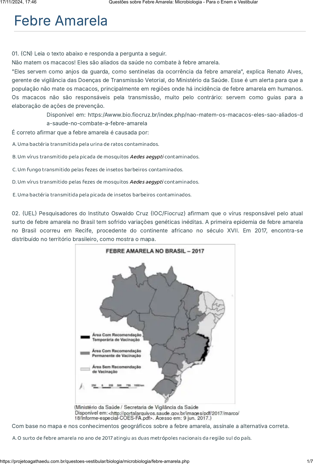 Febre Amarela 01. �CN� Leia o texto abaixo e responda a pergunta a seguir. Não matem os macacos! Eles são aliados da saúde no combate à febre amarela. "Eles servem como anjos da guarda, como sentinelas da ocorrência da febre amarela”, explica Renato Alves, gerente de vigilância das Doenças de Transmissão Vetorial, do Ministério da Saúde. Esse é um alerta para que a população não mate os macacos, principalmente em regiões onde há incidência de febre amarela em humanos. Os macacos não são responsáveis pela transmissão, muito pelo contrário: servem como guias para a elaboração de ações de prevenção. Disponível em: https:/Awww.bio.fiocruz.br/index.php/nao-matem-os-macacos-eles-sao-aliados-d a-saude-no-combate-a-febre-amarela É correto afirmar que a febre amarela é causada por: A. Uma bactéria transmitida pela urina de ratos contaminados. B. Um vírus transmitido pela picada de mosquitos Aedes aegypti contaminados. C. Um fungo transmitido pelas fezes de insetos barbeiros contaminados. D. Um vírus transmitido pelas fezes de mosquitos Aedes aegypti contaminados. E. Uma bactéria transmitida pela picada de insetos barbeiros contaminados. 02. �UEL� Pesquisadores do Instituto Oswaldo Cruz �IOC/Fiocruz) afirmam que o vírus responsável pelo atual surto de febre amarela no Brasil tem sofrido variações genéticas inéditas. A primeira epidemia de febre amarela no Brasil ocorreu em Recife, procedente do continente africano no século XVII. Em 2017, encontra-se distribuído no território brasileiro, como mostra o mapa. Com base no mapa e nos conhecimentos geográficos sobre a febre amarela, assinale a alternativa correta. A. O surto de febre amarela no ano de 2017 atingiu as duas metrópoles nacionais da região sul do país. 17/11/2024, 17:46 Questões sobre Febre Amarela: Microbiologia - Para o Enem e Vestibular https://projetoagathaedu.com.br/questoes-vestibular/biologia/microbiologia/febre-amarela.php 1/7 B. Os fatores climáticos como temperatura, umidade e duração da estação chuvosa têm implicações na disseminação da febre amarela no interior do país. C. A febre amarela está restrita aos municípios localizados nos domínios morfoclimáticos Amazônico e de Cerrado. D. A expansão do vírus em direção ao interior chegou ao oeste paulista devido à presença de condomínios próximos a reservas �orestais. E. A recomendação temporária para a vacinação é para os três estados mais populosos do país: Espírito Santo, Bahia e Rio Grande do Sul. 03. �FATEC� Um surto de febre-amarela atingiu o Brasil entre 2017 e 2018. Apesar de o vírus ser o mesmo, costuma-se distinguir essa doença em urbana, que ocorre nas cidades, e em silvestre, que ocorre nas matas e nas áreas rurais. A transmissão dessa moléstia ocorre por intermédio de mosquitos que habitam e circulam em A. Florestas boreais e áreas desérticas. B. Florestas tropicais e áreas de cerrado. C. Florestas de coníferas e áreas de tundra. D. Florestas mediterrâneas e áreas montanhosas. E. Florestas temperadas e áreas de picos gelados. 04. �ETEC� Os turistas que viajam para áreas de risco de contágio de febre amarela como, por exemplo, algumas regiões do Brasil e do exterior, devem se vacinar. Essa imunização deve ser feita pelo menos dez dias antes do embarque e é realizada, gratuitamente, em postos de saúde. A febre amarela é uma doença infecciosa aguda de natureza viral e é transmitida por picada de mosquitos, encontrados principalmente em regiões de mata e vegetação às margens de rios. Uma extensa faixa do território brasileiro é considerada endêmica para a febre amarela silvestre. Os sintomas característicos dessa enfermidade variam muito. Podem ser febre alta, dor de cabeça e lombar, náuseas, vômito, prostração e calafrios, ou podem evoluir para complicações até mesmo letais, tais como, problemas cardíacos (miocardite) e comprometimento do fígado e dos rins. Sobre a febre amarela é correto afirmar que A. O contato com objetos utilizados por pessoas doentes oferece perigo de transmissão, pois essa doença é altamente contagiosa. B. O período de dez dias, citado no texto, é o tempo necessário para que o indivíduo �que curado dessa doença. C. O aumento do número de casos de pessoas doentes está diretamente associado à falta de higiene pessoal. D. O contágio ocorre também por contato sexual e por transfusão de sangue contaminado. E. A eliminação dos mosquitos que a transmite é um método e�caz para a prevenção. 05. �Mackenzie) Nos últimos meses, ocorreram casos de febre amarela em diversas cidades brasileiras. Registram-se dados do dia 22/03/2017, em que há casos suspeitos da doença em todo o país que chegam a um número 1558. A respeito dessa doença, são feitas as seguintes afirmações: I. É causada por vírus e pode ser transmitida por mais de uma espécie de mosquito. II. Tanto o combate ao transmissor quanto a vacinação são as principais formas de se evitar a doença. III. Além do homem, outros animais podem adquirir a doença. IV. O mosquito só adquire o vírus quando pica uma pessoa contaminada. Estão corretas, apenas, A. I e II. 17/11/2024, 17:46 Questões sobre Febre Amarela: Microbiologia - Para o Enem e Vestibular https://projetoagathaedu.com.br/questoes-vestibular/biologia/microbiologia/febre-amarela.php 2/7 B. I e III. C. I e IV. D. I, II e III. E. I, II e IV. 06. �UERJ� No processo de transmissão da febre amarela, sabe-se que apenas as fêmeas dos mosquitos se alimentam do sangue de seres humanos e macacos. Um aspecto favorecido por esse tipo de alimentação é: A. Realização de muda B. Produção de ovos C. Atração dos machos D. Manutenção do vírus 07. �URCA� A febre amarela voltou as áreas urbanas do Brasil. Essa doença não ocorria nessas áreas desde 1942. Assinale a alternativa que traz vetores dessa doença: A. Aedis aegypti e Sabethes sp; B. Sabethes sp. Cul