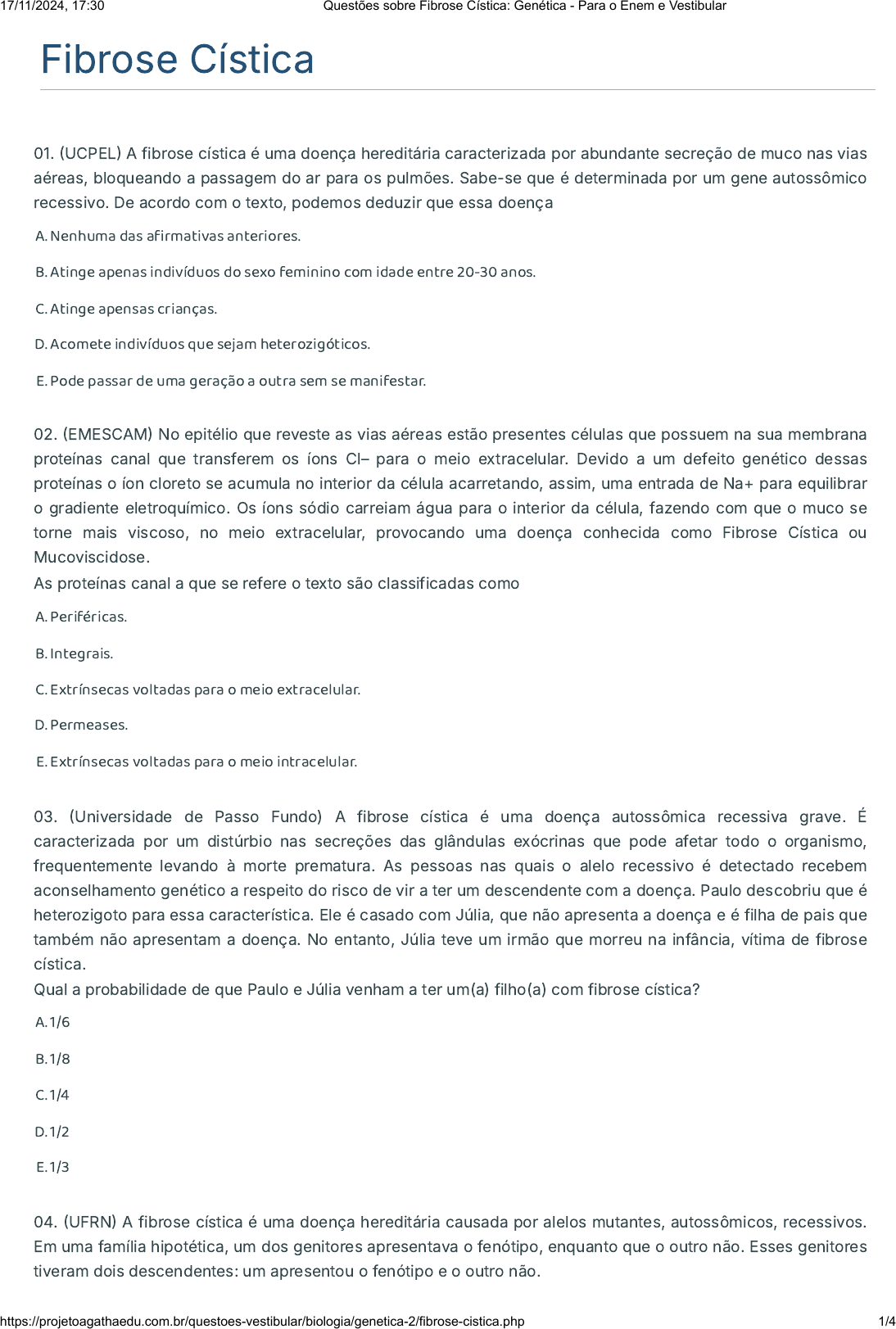 Fibrose Cística 01. �UCPEL� A fibrose cística é uma doença hereditária caracterizada por abundante secreção de muco nas vias aéreas, bloqueando a passagem do ar para os pulmões. Sabe-se que é determinada por um gene autossômico recessivo. De acordo com o texto, podemos deduzir que essa doença A. Nenhuma das a�rmativas anteriores. B. Atinge apenas indivíduos do sexo feminino com idade entre 20-30 anos. C. Atinge apensas crianças. D. Acomete indivíduos que sejam heterozigóticos. E. Pode passar de uma geração a outra sem se manifestar. 02. �EMESCAM� No epitélio que reveste as vias aéreas estão presentes células que possuem na sua membrana proteínas canal que transferem os íons Cl– para o meio extracelular. Devido a um defeito genético dessas proteínas o íon cloreto se acumula no interior da célula acarretando, assim, uma entrada de Na+ para equilibrar o gradiente eletroquímico. Os íons sódio carreiam água para o interior da célula, fazendo com que o muco se torne mais viscoso, no meio extracelular, provocando uma doença conhecida como Fibrose Cística ou Mucoviscidose. As proteínas canal a que se refere o texto são classificadas como A. Periféricas. B. Integrais. C. Extrínsecas voltadas para o meio extracelular. D. Permeases. E. Extrínsecas voltadas para o meio intracelular. 03. �Universidade de Passo Fundo) A fibrose cística é uma doença autossômica recessiva grave. É caracterizada por um distúrbio nas secreções das glândulas exócrinas que pode afetar todo o organismo, frequentemente levando à morte prematura. As pessoas nas quais o alelo recessivo é detectado recebem aconselhamento genético a respeito do risco de vir a ter um descendente com a doença. Paulo descobriu que é heterozigoto para essa característica. Ele é casado com Júlia, que não apresenta a doença e é filha de pais que também não apresentam a doença. No entanto, Júlia teve um irmão que morreu na infância, vítima de fibrose cística. Qual a probabilidade de que Paulo e Júlia venham a ter um(a) filho(a) com fibrose cística? A. 1/6 B. 1/8 C. 1/4 D. 1/2 E. 1/3 04. �UFRN� A fibrose cística é uma doença hereditária causada por alelos mutantes, autossômicos, recessivos. Em uma família hipotética, um dos genitores apresentava o fenótipo, enquanto que o outro não. Esses genitores tiveram dois descendentes: um apresentou o fenótipo e o outro não. 17/11/2024, 17:30 Questões sobre Fibrose Cística: Genética - Para o Enem e Vestibular https://projetoagathaedu.com.br/questoes-vestibular/biologia/genetica-2/fibrose-cistica.php 1/4 Com relação ao genótipo dessa família, A. Ambos genitores seriam heterozigotos, um descendente seria homozigoto recessivo, e o outro, heterozigoto B. Um dos genitores e um dos descendentes são homozigotos recessivos, e os outros dois, genitor e descendente, são heterozigotos. C. Ambos genitores seriam homozigotos recessivos, um descendente seria homozigoto recessivo e o outro, heterozigoto. D. Um dos genitores seria homozigoto recessivo, enquanto que o outro genitor e os descendentes seriam heterozigotos. 05. �Universidade de Pernambuco) Diversas doenças que acometem os seres vivos são causadas por defeitos de origem genética. Por exemplo, o gene denominado CFTR é responsável pela fibrose cística, doença que degenera vários órgãos por acúmulo de muco denso. Sobre esse assunto, é CORRETO afirmar que um defeito na sequência de bases encontradas no DNA reflete-se na A. Construção dos ácidos graxos presentes nos lipídios. B. Formação do RNAt transportador do aminoácido. C. Formação do DNAm mensageiro responsável pela tradução genética. D. Sequência de aminoácidos que formam a proteína. E. Construção dos monossacarídeos que formam um carboidrato. 06. �ACAFE� Terapia genética traz resultados promissores contra fibrose cística. Um teste de terapia gênica permitiu melhorar significativamente a função respiratória dos pacientes que sofrem de fibrose cística, segundo um estudo publicado em 03/07/2015 na revista médica especializada The Lancet Respiratory Medicine. A nova técnica foi aplicada em 136 pacientes, maiores de 12 anos, que sofriam de fibrose cística, e objetiva neutralizar o defeito genético que provoca a doença, ao contrário de tratar os sintomas como ocorre atualmente. Fonte: Veja, 03/07/2015 Disponível em: http:/lveia.abril.com.br/noticia/saude/terapia- genetica. Ac esso em 15/08/2015. Acerca do tema é correto afirmar, exceto: A. Os vetores mais utilizados pela terapia gênica são os vírus, devido a sua especi�cidade em infectar determinado tipo celular. No entanto, para utilizá-los na inserção de genes terapêuticos, é preciso modi�ca-los, de modo a retirar qualquer informação genética que possa desencadear uma resposta imune. B. Terapia gênica é o tratamento baseado na introdução de genes sadios com uso de técnicas de DNA recombinante. A ideia é substituir ou suplementar a expressão do gene estruturalmente anormal, mediante a inserção de uma ou mais cópias do gene terapêutico. C. Recentemente, o potencial para uso indevido da terapia gênica entre atletas tem despertado a atenção de cientistas e de órgãos reguladores de esporte. A transferência de genes que poderiam melhorar o desempenho esportivo de atletas saudáveis, método proibido desde 2003, foi denominada de doping genético. D. A �brose cística, também conhecida como mucoviscidose, apresenta como principal característica o acúmulo de secreções mais densas e pegajosas nos pulmões, no trato digestivo e em outras áreas do corpo. Sendo uma doença genética de herança autossômica recessiva, pais normais, porém, portadores do gene, possuem uma probabilidade genética de 25% de terem uma �lha portadora da doença. 07. �Faculdade de Ciências Médicas-PB� A Sra. Eugênia levou seu filho de 2 anos ao pediatra, relatou que Pedro, apresentava infecções r