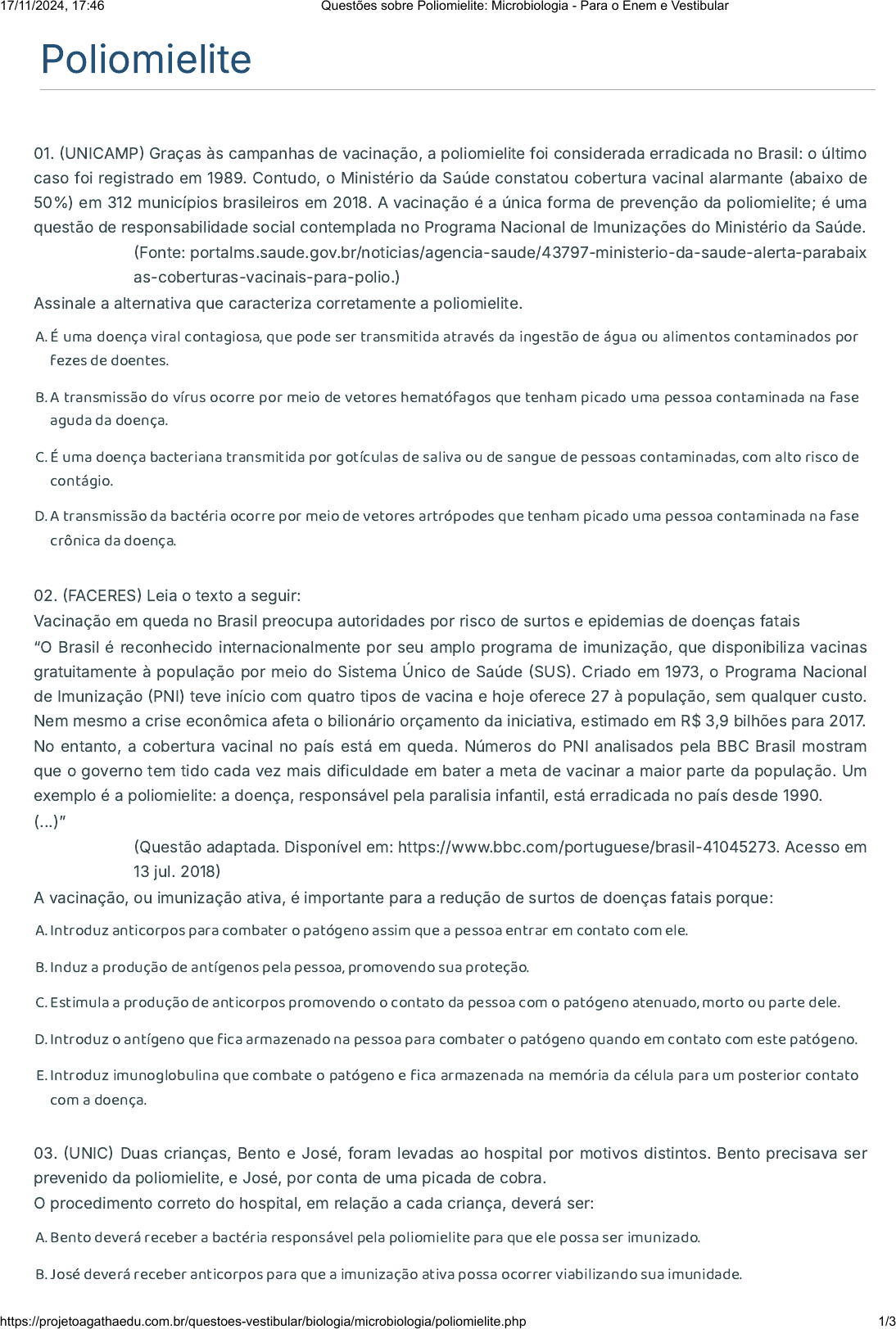Poliomielite 01. �UNICAMP� Graças às campanhas de vacinação, a poliomielite foi considerada erradicada no Brasil: o último caso foi registrado em 1989. Contudo, o Ministério da Saúde constatou cobertura vacinal alarmante (abaixo de 50%) em 312 municípios brasileiros em 2018. A vacinação é a única forma de prevenção da poliomielite; é uma questão de responsabilidade social contemplada no Programa Nacional de Imunizações do Ministério da Saúde. �Fonte: portalms.saude.gov.br/noticias/agencia-saude/43797-ministerio-da-saude-alerta-parabaix as-coberturas-vacinais-para-polio.) Assinale a alternativa que caracteriza corretamente a poliomielite. A. É uma doença viral contagiosa, que pode ser transmitida através da ingestão de água ou alimentos contaminados por fezes de doentes. B. A transmissão do vírus ocorre por meio de vetores hematófagos que tenham picado uma pessoa contaminada na fase aguda da doença. C. É uma doença bacteriana transmitida por gotículas de saliva ou de sangue de pessoas contaminadas, com alto risco de contágio. D. A transmissão da bactéria ocorre por meio de vetores artrópodes que tenham picado uma pessoa contaminada na fase crônica da doença. 02. �FACERES� Leia o texto a seguir: Vacinação em queda no Brasil preocupa autoridades por risco de surtos e epidemias de doenças fatais “O Brasil é reconhecido internacionalmente por seu amplo programa de imunização, que disponibiliza vacinas gratuitamente à população por meio do Sistema Único de Saúde �SUS�. Criado em 1973, o Programa Nacional de Imunização �PNI) teve início com quatro tipos de vacina e hoje oferece 27 à população, sem qualquer custo. Nem mesmo a crise econômica afeta o bilionário orçamento da iniciativa, estimado em R$ 3,9 bilhões para 2017. No entanto, a cobertura vacinal no país está em queda. Números do PNI analisados pela BBC Brasil mostram que o governo tem tido cada vez mais dificuldade em bater a meta de vacinar a maior parte da população. Um exemplo é a poliomielite: a doença, responsável pela paralisia infantil, está erradicada no país desde 1990. (...)” �Questão adaptada. Disponível em: https://www.bbc.com/portuguese/brasil-41045273. Acesso em 13 jul. 2018� A vacinação, ou imunização ativa, é importante para a redução de surtos de doenças fatais porque: A. Introduz anticorpos para combater o patógeno assim que a pessoa entrar em contato com ele. B. Induz a produção de antígenos pela pessoa, promovendo sua proteção. C. Estimula a produção de anticorpos promovendo o contato da pessoa com o patógeno atenuado, morto ou parte dele. D. Introduz o antígeno que �ca armazenado na pessoa para combater o patógeno quando em contato com este patógeno. E. Introduz imunoglobulina que combate o patógeno e �ca armazenada na memória da célula para um posterior contato com a doença. 03. �UNIC� Duas crianças, Bento e José, foram levadas ao hospital por motivos distintos. Bento precisava ser prevenido da poliomielite, e José, por conta de uma picada de cobra. O procedimento correto do hospital, em relação a cada criança, deverá ser: A. Bento deverá receber a bactéria responsável pela poliomielite para que ele possa ser imunizado. B. José deverá receber anticorpos para que a imunização ativa possa ocorrer viabilizando sua imunidade. 17/11/2024, 17:46 Questões sobre Poliomielite: Microbiologia - Para o Enem e Vestibular https://projetoagathaedu.com.br/questoes-vestibular/biologia/microbiologia/poliomielite.php 1/3 C. Bento receberá o agente etiológico da poliomielite atenuado, proporcionando sua imunização ativa. D. José receberá anticorpos e, com isso, sua imunização passiva será perpetua, atenuando as consequências. E. A imunidade desenvolvida nessas crianças, após os procedimentos no hospital, terá a mesma duração. 04. �ACAFE� Em Santa Catarina, 379 mil crianças são vacinadas contra a pólio na campanha anual. Em parceria com estados e municípios, o Ministério da Saúde realizou a 36ª Campanha Nacional de Vacinação contra a Poliomielite. De 15 a 31 de agosto, a meta foi imunizar 12 milhões de crianças entre seis meses e cinco anos incompletos. Isso representa 95% do público-alvo, formado por 12,7 milhões de crianças. Em Santa Catarina, a meta foi vacinar 95% das 379,7 mil crianças que fazem parte do público-alvo. Para isso, o Ministério da Saúde distribuiu 474,8 mil doses ao Estado. Fonte: Ministério da Saúde, 11/08/2015 Disponível em: http://portalsaude.saude.gov.br/ Assim, assinale a alternativa correta. A. A tuberculose é uma doença infecciosa e transmissível, causada pelo Mycobacterium tuberculosis. Devido ao agente causador ser uma bactéria aeróbia, afeta unicamente os pulmões. Para prevenir a doença é necessário imunizar as crianças obrigatoriamente no primeiro ano de vida ou no máximo até quatro anos. B. A poliomielite é uma doença bacteriana, onde este micro-organismo penetra no organismo humano por meio da boca e do nariz e se multiplica na garganta e no trato intestinal. Posteriormente, alcança a corrente sanguínea e pode atingir o cérebro. Quando a infecção ataca o sistema nervoso, destrói os neurônios motores e provoca paralisia nos membros inferiores. Esta doença pode, inclusive, levar o indivíduo à morte se forem infectadas as células nervosas que controlam os músculos respiratórios e os músculos da deglutição. C. O tétano é uma grave doença bacteriana que afeta o sistema neurológico e que, entre outras complicações, pode levar inclusive à morte. É causado pela bactéria Clostridium tetani, que pode ser encontrada no solo, poeira e nas fezes de animais. Assim, pessoas que apresentam ferimento na pele, causado por algum objeto enferrujado e sujo, a exemplo de pregos, devem procurar um médico para que seja administrada a vacina antitetânica. D. O Papiloma Vírus Humano (HPV) é um vírus que infec