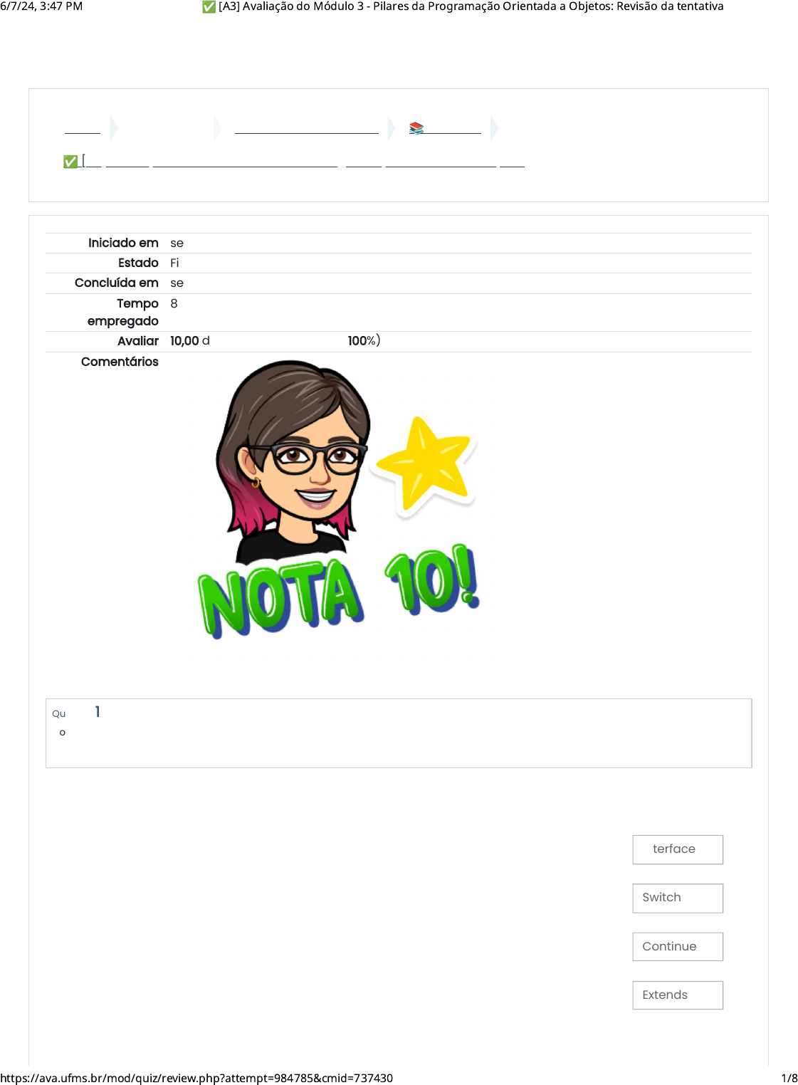 Painel Meus cursos 32010001844-T01-2024-1 📚 Módulo 3 ✅ [A3] Avaliação do Módulo 3 - Pilares da Programação Orientada a Objetos Iniciado em sexta, 7 jun 2024, 15:38 Estado Finalizada Concluída em sexta, 7 jun 2024, 15:46 Tempo empregado 8 minutos 14 segundos Avaliar 10,00 de um máximo de 10,00(100%) Comentários Questão 1 Correto Atingiu 1,00 de 1,00 Associe as palavras a seguir com o seu respectivo significado. Palavra reservada utilizada para definir uma interface em Java. Palavra reservada utilizada para redefinir o controle de fluxo permitindo executar diferentes blocos de código com base em diferentes valores de entrada em Java. Palavra reservada utilizada para continuar a iteração do laço para o próximo passo em Java. Palavra reservada utilizada para definir herança em Java. Interface Switch Continue Extends 6/7/24, 3:47 PM ✅ [A3] Avaliação do Módulo 3 - Pilares da Programação Orientada a Objetos: Revisão da tentativa https://ava.ufms.br/mod/quiz/review.php?attempt=984785&cmid=737430 1/8 https://ava.ufms.br/my/ https://ava.ufms.br/course/view.php?id=53718 https://ava.ufms.br/course/view.php?id=53718#section-4 https://ava.ufms.br/mod/quiz/view.php?id=737430 Questão 2 Correto Atingiu 1,00 de 1,00 Analise o código abaixo. abstract class Animal { abstract void makeNoise(); } class Dog extends Animal { void makeNoise() { System.out.println("Bark"); } } class Cat extends Animal { void makeNoise() { System.out.println("Meawoo"); } } Indique se a alternativa abaixo é válida de acordo com o código apresentado. Cat c = new Animal(); Animal animal = (Animal) cat; Escolha uma opção: Verdadeiro Falso 6/7/24, 3:47 PM ✅ [A3] Avaliação do Módulo 3 - Pilares da Programação Orientada a Objetos: Revisão da tentativa https://ava.ufms.br/mod/quiz/review.php?attempt=984785&cmid=737430 2/8 Questão 3 Correto Atingiu 1,00 de 1,00 Dado o código a seguir: public class MyClass { T a; C b; public MyClass(T a, C b) { this.a = a; this.b = b; } void out() { System.out.print(a); System.out.print(b); } public static void main(String[] args) { MyClass m = new MyClass(.1, "asdf"); m.out(); } } Marque a opção que indica a saída no console do usuário. Escolha uma opção: a. Não sai nada. Código não executa. b. asdf c. 0.1asdf d. 0.1 6/7/24, 3:47 PM ✅ [A3] Avaliação do Módulo 3 - Pilares da Programação Orientada a Objetos: Revisão da tentativa https://ava.ufms.br/mod/quiz/review.php?attempt=984785&cmid=737430 3/8 Questão 4 Correto Atingiu 1,00 de 1,00 Questão 5 Correto Atingiu 1,00 de 1,00 Questão 6 Correto Atingiu 1,00 de 1,00 Qual é a principal vantagem do uso de generics em Java? a. Permite a definição de classes com mais de um construtor. b. Permite a criação de classes genéricas que podem ser reutilizadas com diferentes tipos de dados. c. Permite a definição de classes com métodos estáticos. d. Permite a definição de classes com atributos finais. Uma classe pode herdar características de uma classe abstrata e implementar uma interface ao mesmo tempo em Java? a. Sim, é possível. b. Não, não é possível. c. Somente se a interface não tiver nenhum método abstrato. d. Somente se a classe abstrata não tiver nenhum método abstrato. Como você declara que uma classe pertence a um pacote específico em Java? Lembrar dos modificadores de acesso. a. Usando a palavra reservada "import" b. Usando a palavra reservada "package" c. Usando a palavra reservada "class" d. Usando a palavra reservada "public" 6/7/24, 3:47 PM ✅ [A3] Avaliação do Módulo 3 - Pilares da Programação Orientada a Objetos: Revisão da tentativa https://ava.ufms.br/mod/quiz/review.php?attempt=984785&cmid=737430 4/8 Questão 7 Correto Atingiu 1,00 de 1,00 Questão 8 Correto Atingiu 1,00 de 1,00 No conceito de classes genéricas, é possível definir um tipo curinga (?) em Java? a. Somente se o tipo genérico for definido como final. b. Sim, é possível. c. Não, não é possível. d. Somente se o tipo genérico for definido como abstract. Dado o código a seguir: public class Superclass { public void printMethod() { System.out.println("Printed in Superclass."); } } public class Subclass extends Superclass { public void printMethod() { super.printMethod(); System.out.println("Printed in Subclass"); } public static void main(String[] args) { Subclass s = new Subclass(); s.printMethod(); } } Marque a resposta que indica quais dos quatro conceitos de orientação a objetos são usados no trecho de código: a. Polimorfismo e Encapsulamento b. Herança e Abstração c. Herança e Polimorfismo d. Abstração e Encapsulamento 6/7/24, 3:47 PM ✅ [A3] Avaliação do Módulo 3 - Pilares da Programação Orientada a Objetos: Revisão da tentativa https://ava.ufms.br/mod/quiz/review.php?attempt=984785&cmid=737430 5/8 Questão 9 Correto Atingiu 1,00 de 1,00 Marque a alternativa que apresenta uma sequência de passos com alterações no código do exemplo abaixo capaz de transformá-lo em um código que use o recurso Generics em Java. #1 import java.util.ArrayList; #2 public class Main { #3 public static void main (String[] args) { #4 List nomes = new ArrayList(); #5 nomes.add("João"); #6 nomes.add("Pedro"); #7 nomes.add("Carlos"); #8 nomes.add("Paulo"); #9 #10 for (int i = 0; i nomes = new String(); Passo 2: substituir a linha de código #10 por: for (nome: nomes) { Passo 3: Remover a linha de código #11 b. Passo 1: substituir a linha de código #4 por: ArrayList nomes = new ArrayList(); Passo 2: substituir a linha de código #10 por: for (String nome: nomes) { c. Passo 1: substituir a linha de código #4 por: ArrayList nomes = new ArrayList(); Passo 2: substituir a linha de código #10 por: for (String nome: nomes) { Passo 3: Remover a linha de código #11 d. Passo 1: substituir a linha de código #4 por: ArrayList nomes = new String(); 6/7/24, 3:47 PM ✅ [A3] Avaliação do Módulo 3 - Pilares da Programação Orientada a Objetos: Revisão da tentativa https://ava.ufms.br/mod/q