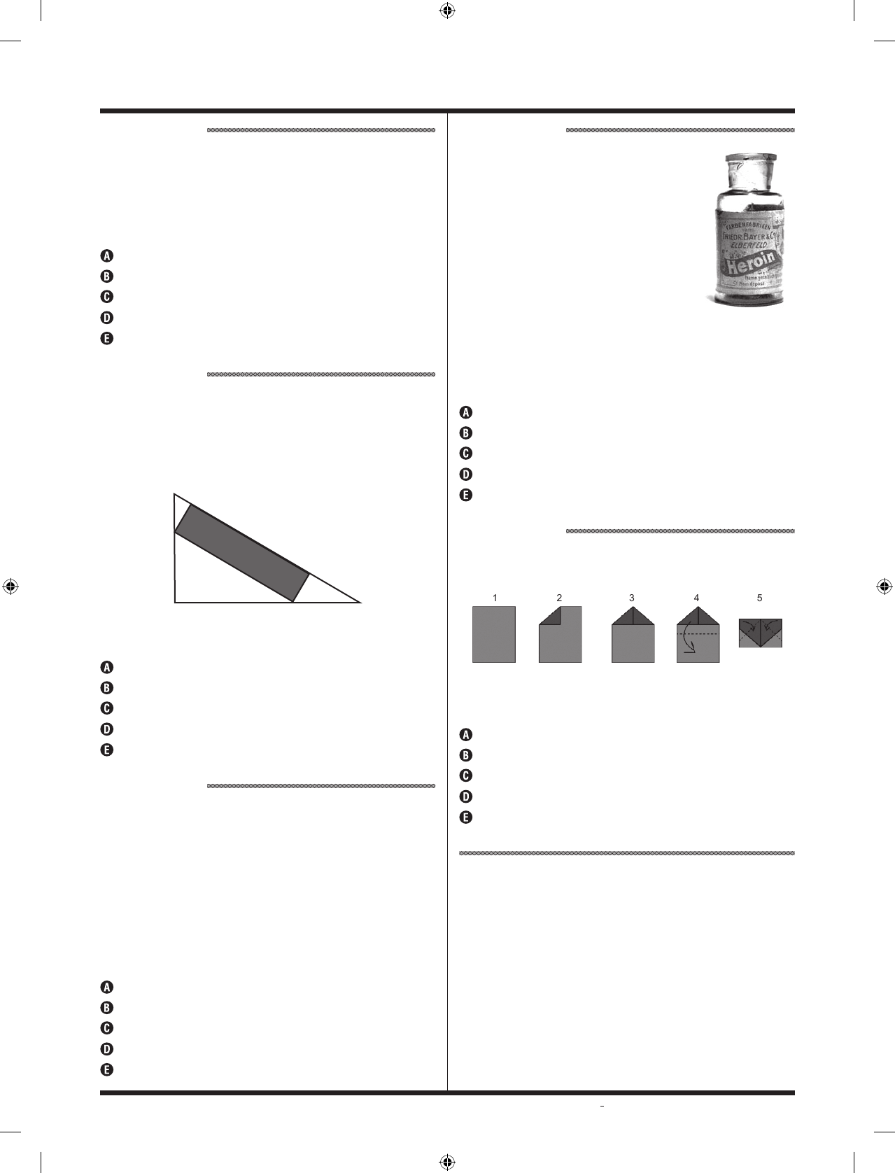 MT – 2o dia | Caderno 1 - Amarelo - Página 37 QUESTÃO 83 As novas regras de aposentadoria no Brasil dizem, por exemplo, que o homem deve somar sua idade com o tempo de contribuição e o resultado deve dar, pelo menos, 95, para que ele ganhe aposentadoria integral. Então, um homem que começou a trabalhar de carteira assinada com 19 anos se aposenta com 76 anos. 72 anos. 67 anos. 65 anos. 57 anos. QUESTÃO 84 Em uma vidraçaria, sobrou um pedaço de espelho do último corte feito para um cliente. Esse pedaço tem a forma de um triângulo retângulo de lados 1 metro, 80 e 60 centímetros. Um outro cliente chegou e queria comprar um espelho retangular. O dono da vidraçaria fez o desenho abaixo, considerando as medidas o pedaço que sobrou: Qual a área máxima que o vidraceiro conseguirá cortar no formato retangular, considerando o desenho acima? 800 cm². 1.000 cm². 1.200 cm². 1.300 cm². 1.600 cm². QUESTÃO 85 Uma coleção de 8 bonecos Playmobil, todos diferentes, estão arrumados em uma prateleira de uma estante. Nesses bonecos, a peça que representa o cabelo é de encaixe e sai com facilidade, podendo ser trocada com os cabelos de outros bonecos. Ao pegá-los para brincar, uma criança retirou os cabelos de todos os bonecos e colocou de volta aleatoriamente em qualquer boneco, colocando corretamente o cabelo de exatamente seis bonecos. Calculando o número total de possibilidades de arrumação dos cabelos dos bonecos pela criança, encontra-se o total de 14. 28. 30. 48. 56. QUESTÃO 86 Um remédio, para ser comercializado, passa por uma série de testes. Para verificar sua eficácia contra algum sintoma, é exigido pelos órgãos responsáveis, uma amostra com porcentagem mínima de êxito. Suponha que, no final do século XIX, a droga “Heroin” foi ministrada em uma amostra de 1.000 pacientes com 80% de eficácia. Alguns novos pacientes são inseridos nessa amostra e todos comprovaram a eficiência do “remédio”. Quantos são esses pacientes se a eficácia do “Heroin” passou de 80% para 90%? 100. 200. 500. 1.000. 1.200. QUESTÃO 87 As primeiras etapas de dobraduras de um avião de papel estão representadas na figura abaixo: 1 2 3 4 5 A folha retangular tem 14 cm × 21 cm e, na quinta etapa, a razão entre a área escura e a área clara vale 7. 3,5. 2,5. 2. 1.