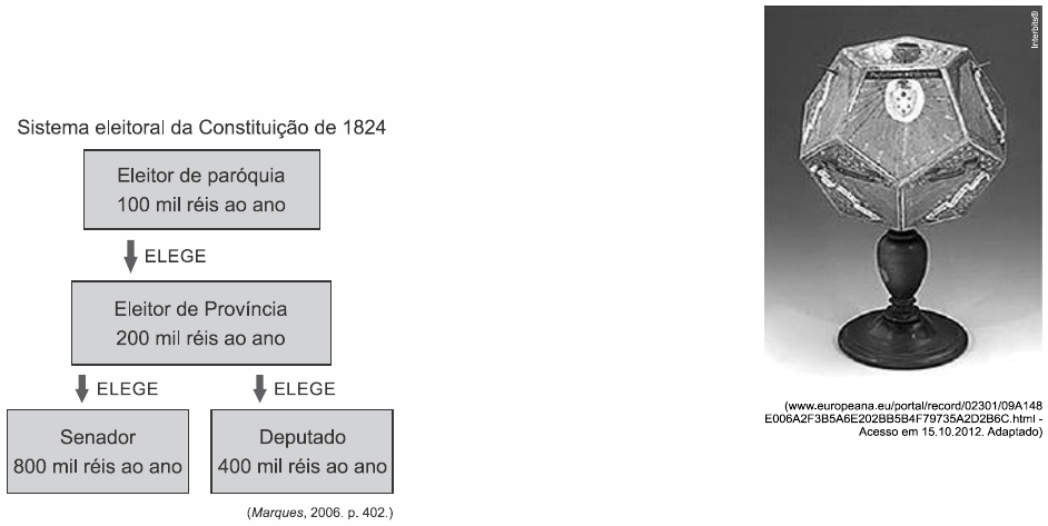 2. (Ufsm 2013) No texto “O Império enfermo”, Cláudio Bertolli Filho afirma: A vinda da Corte portuguesa para o Brasil em 1808 determinou mudanças na administração pública colonial, inclusive na área de saúde. Como sede provisória do império lusitano e principal porto do país, a cidade do Rio de Janeiro tornou-se o centro das ações sanitárias. Com elas, dom João VI procurou oferecer uma imagem nova de uma região que os europeus definiam como território da barbárie e da escravidão. Fonte: BERTOLLI FILHO, Cláudio. História da saúde pública no Brasil. 4.ed. São Paulo: Ática, 2001. p. 8. As ocorrências mencionadas estão inseridas numa sucessão em que podem ser destacados, seja como antecedentes, seja como consequentes, os seguintes processos: I. a Primeira Revolução Industrial e a busca da Inglaterra pela hegemonia comercial na Europa e no mundo. II. a Revolução Francesa e as tentativas de expansão das conquistas dos revolucionários burgueses para a Europa. III. as disputas entre a Inglaterra e a França, o decreto do Bloqueio Continental com as repercussões para a Espanha e Portugal e seus domínios ultramarinos. IV. a crise do sistema colonial, os processos de independência nas Américas e a implantação de Estados Nacionais em ex- colônias da Inglaterra, França, Espanha e Portugal. Estão corretas a) apenas I e II. b) apenas I e IV. c) apenas II e III. d) apenas III e IV. e) I, II, III e IV. PRIMEIRO REINADO 1. (Uern 2015) Observe o quadro. A partir da análise do quadro e tendo em vista o contexto do Brasil no I Império, é possível classificar o voto, naquele período, como a) censitário, amplo, indireto e irrestrito. b) universal, masculino, direto e representativo. c) censitário, masculino, indireto e em dois graus. d) universal, apartidário, direto e em quatro graus. 2. (Uepa 2015) Leia o texto para responder à questão. (...) Sendo, pois chegada a época de ver o Brasil a justiça da sua Causa de acordo com os interesses e as vistas de Inglaterra não cessarei de lembrar a V. Sra. quanto importa aproveitar tão felizes circunstâncias; elas são tão favoráveis que sendo manejadas com aptidão e habilidade de V. Sra. darão em resultado o reconhecimento pronto e formal deste Império pela Inglaterra, sem talvez haver precisão de o fazer dependente de condições algumas; pois bem longe de estarmos agora em circunstâncias de propor e pedir, mui pelo contrário, a própria Inglaterra sentirá por si mesma a necessidade de reconhecer a nossa independência e contrabalançar a influência do Governo [francês], que ora domina os conselhos de Madrid e de Lisboa ...” (Arquivo da Independência, vol. I, p. 56.) A correspondência de Carvalho e Mello, Secretário dos Negócios Estrangeiros do Brasil, em 1824, revela características da diplomacia brasileira no sentido do reconhecimento da independência. No texto, fica evidente o interesse em: a) utilizar o cenário político europeu favoravelmente ao Brasil. b) oferecer a abolição do tráfico negreiro como condição. c) resistir ao pagamento de indenização em dinheiro. d) buscar fazer acordo com Portugal e Espanha. e) participar do jogo de alianças internacionais. MATEMÁTICA: PARTE B SUPERFÍCIE POLIÉDRICA E POLIEDROS 1. (Ifsp 2013) A figura mostra uma peça feita em 1587 por Stefano Buonsignori, e está exposta no Museu Galileo, em Florença, na Itália. Esse instrumento tem a forma de um dodecaedro regular e, em cada uma de suas faces pentagonais, há a gravação de um tipo diferente de relógio. Em 1758, o matemático Leonard Euler (1707-1783) descobriu o teorema conhecido por relação de Euler: em todo poliedro convexo com V vértices, A arestas e F faces, vale a relação Ao se aplicar a relação de Euler no poliedro da figura, o número de arestas não visíveis é a) 10. b) 12. c) 15. d) 16. e) 18. V A F 2.