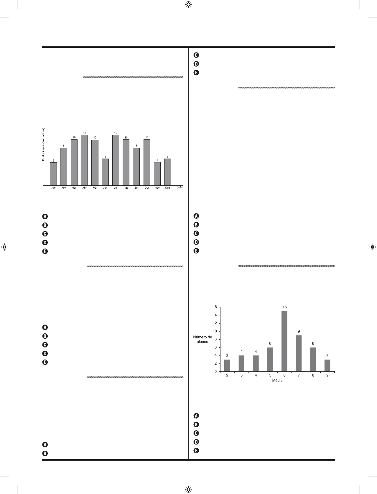 MT – 2o dia | Caderno 1 - Amarelo - Página 25 MATEMÁTICA E SUAS TECNOLOGIAS Questões de 46 a 90 QUESTÃO 46 O uso de biodiesel gera uma série de efeitos ambientais, tais como a redução da emissão de gases do efeito estufa e a diminuição da poluição atmosférica. O gráfico mostra a produção de biodiesel (em milhões de litros) em uma usina, durante o período de um ano. De acordo com os dados, a média, a mediana e a moda (em milhões de litros) são, respectivamente, iguais a 8; 9 e 9. 8; 9 e 10. 8; 9,5 e 8. 8,5; 9 e 10. 8,5; 9,5 e 10. QUESTÃO 47 Uma família viajava entre dois povoados da Serra da Mantiqueira e, para controlar o tempo de chegada, percorria cada trecho da viagem com uma velocidade diferente. A primeira terça parte do trajeto percorreu com velocidade média de 60 km/h, a terça parte seguinte a 40 km/h e o restante do percurso a 20 km/h. O valor que melhor aproxima a velocidade média do veículo nessa viagem, em km/h, é 32,5. 34,5. 35,5. 37,5. 42,5. QUESTÃO 48 Em um experimento no laboratório de pesquisa da faculdade de Microbiologia, tinha por objetivo inferir que o número de bactérias de uma determinada cultura, sob certas condições, evolui conforme a função B(t) = 10 · 3t – 1, em que B(t) expressa a quantidade de bactérias e t representa o tempo em horas. Ao atingir um número aproximado de 810 bactérias, após o início do experimento, o tempo aproximado já decorrido, em horas, corresponde a: 1. 2. 3. 4. 5. QUESTÃO 49 Alguns conhecimentos são adquiridos mesmo antes de serem apresentados em sala de aula, como por exemplo, o conceito de lucro. Algumas pessoas têm a noção, mesmo sem ter estudado, de que o lucro é obtido diminuindo do preço de venda o valor do custo da mercadoria. Em linguagem matemática, podemos expressar essa situação como L = R – C, em que L é o lucro, C o custo da produção e R a receita do produto. Em uma situação real, uma fábrica de tratores produziu n unidades e o setor responsável apresentou um relatório nos quais, em determinado mês, o custo de produção era dado pela função C(n) = n2 – 1.000n e a receita representada por R(n) = 5.000 n – 2n2. Com base nas informações acima, a quantidade n de peças a serem produzidas para que o lucro seja máximo corresponde a um número do intervalo 580