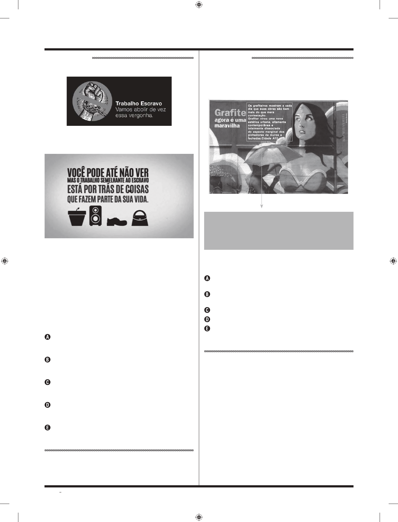 LG – 2o dia | Caderno 1 - Amarelo - Página 24 QUESTÃO 44 TEXTO I Disponível em: www.sindigru.org.br TEXTO II Disponível em: www.youtube.com TEXTO III Trabalho escravo se configura pelo trabalho degradante aliado ao cerceamento da liberdade. Esse segundo fator nem sempre é visível, uma vez que não mais se utilizam correntes para prender o homem à terra, mas sim ameaças físicas, terror psicológico ou mesmo as grandes distâncias que separam a propriedade da cidade mais próxima. Disponível em: www.reporterbrasil.com.br A partir da comparação entre os textos, verifica-se que os elementos não verbais dos dois textos iniciais entram em contradição com o texto III, pois não contribuem para a denúncia do problema do trabalho escravo. o texto III reproduz fielmente, com elementos verbais, o contido no texto I, que também possui elementos não verbais. o substantivo “vergonha”, utilizado no texto I, traduz um sentimento decorrente da qualificação do trabalho como “escravo” (texto I) e “degradante” (texto III). a ideia da possível invisibilidade das práticas de trabalho escravo encontra-se, indiretamente, considerada nos textos I e II. a imagem da “mão fechada”, no texto I, corresponde à ideia de “terror psicológico”, mencionada no texto II. QUESTÃO 45 Reconhecido há tempos, dentro e fora do Brasil, como manifestação artística legítima e pública, o grafite vem sendo visto, também, como um elemento relevante do espaço urbano, pois nele realiza sucessivas intervenções. Jornal do Brasil. 26 fev. 2010. Os grafiteiros mostram a cada dia que suas obras são bem mais do que mera contestação. Grafitar virou uma nova estética urbana, altamente contemporânea e totalmente dissociada do aspecto marginal dos pichadores de muros e fachadas. Com base nessa ideia e no foco da matéria jornalística, pode-se reconhecer que, atualmente, o grafite estimula e aprofunda o desemprego entre a população jovem urbana. potencializa e provoca a revolta de grupos sociais oprimidos. renova e estetiza diversos trechos da paisagem urbana. fortalece e antecipa o aspecto marginal das pichações. abandona e contesta valores estéticos externos à cultura nacional.
