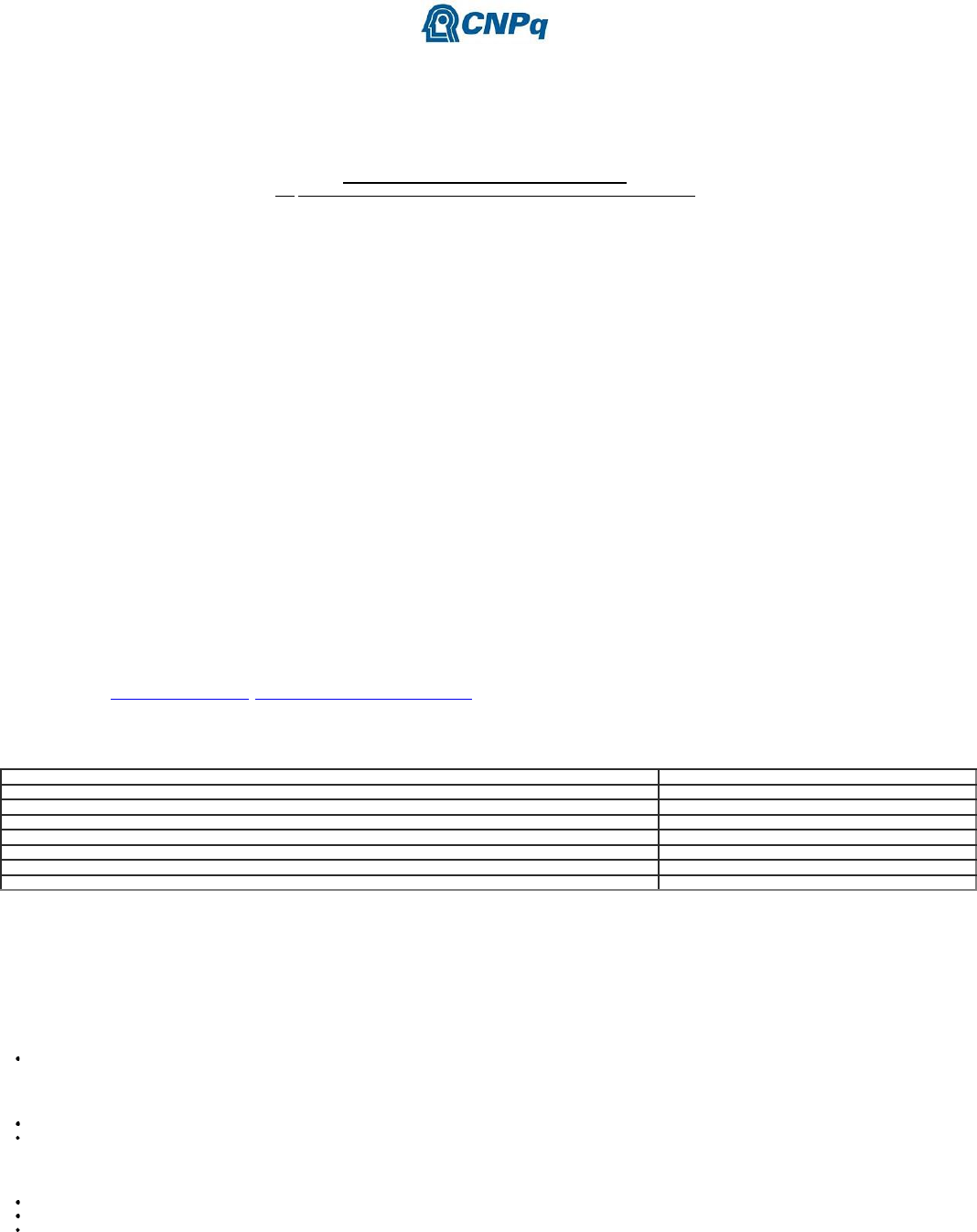 19/06/2024, 15:07 SEI/CNPq - 2074564 - Chamada Pública https://sei.cnpq.br/sei/controlador.php?acao=documento_visualizar&acao_origem=arvore_visualizar&id_documento=4508738&infra_sistema=100… 1/5 CONSELHO NACIONAL DE DESENVOLVIMENTO CIENTÍFICO E TECNOLÓGICO Setor de Autarquias Sul (SAUS), Quadra 01, Lote 06, Bloco H - Bairro Asa Sul - CEP 70070-010 - Brasília - DF - www.gov.br/cnpq Edifício Telemundi II CHAMADA PÚBLICA Chamada Pública MCTI/CNPq nº 16/2024 - Apoio a Projetos Internacionais de Pesquisa Científica, Tecnológica e de Inovação O Conselho Nacional de Desenvolvimento Científico e Tecnológico - CNPq torna pública a presente Chamada e convida os interessados a apresentarem propostas nos termos aqui estabelecidos. 1 - Objeto Fomentar propostas de projetos internacionais de pesquisa que visem contribuir para o desenvolvimento científico, tecnológico e a inovação do país, por meio da concessão de bolsas no exterior e recursos de custeio, em todas as áreas do conhecimento. 1.1 - São objetivos e diretrizes desta chamada: a) estimular a participação de pesquisadores brasileiros em projetos de cooperação com grupos e/ou redes de pesquisa internacionais em todos os países, de modo a promover a internacionalização e o desenvolvimento científico e tecnológico; b) fomentar a capacidade de grupos de pesquisa nacionais para a articulação de redes de cooperação acadêmica internacional; c) incentivar a participação de pesquisadores brasileiros em projetos de cooperação com grupos e/ou redes de pesquisa de países latino-americanos, caribenhos e africanos; d) encorajar a participação em projetos internacionais de pesquisadores brasileiros vinculados a instituições sediadas nas regiões Norte, Nordeste e Centro-Oeste; e) estimular propostas que contemplem evidência de contrapartida financeira do parceiro estrangeiro; f) estimular o engajamento de doutores, com até 10 anos de obtenção do título, em pesquisas internacionais de forma a promover novas lideranças científicas; g) promover ações de educação, popularização e/ou divulgação científica para diferentes tipos de público, alcançando amplos setores da sociedade, em articulação com especialistas, grupos e instituições que atuam nas áreas de educação formal e não formal (por exemplo: escolas, núcleos de extensão, museus, centros de ciências, zoológicos, jardins botânicos, aquários, centros de visitantes de unidades de conservação e organizações não governamentais). 1.2 - Os projetos serão apoiados nas seguintes faixas: 1.2.1 - Faixa 1: Projeto em cooperação, compreendido como projeto de pesquisa com comprovada articulação internacional entre grupos já estabelecidos, mediante a manifestação por escrito dos grupos internacionais envolvidos no projeto; 1.2.2 - Faixa 2: Projeto individual, entendido como um projeto de pesquisa que busca estimular o engajamento de doutores, com até 10 anos de conclusão do doutoramento, em pesquisas internacionais de forma a promover novas lideranças científicas. É desejável que a capacitação internacional pretendida agregue condições para que o pesquisador possa concorrer em projetos de cooperação, no futuro, pelo Brasil. 1.2.3 - Faixa 3: d) Projeto individual (Desenvolvimento Tecnológico e Inovação no Exterior Sênior – DES), entendido como um projeto de pesquisa que busca estimular o engajamento de doutores em pesquisas internacionais de forma a promover novas lideranças científicas, e que tenham bolsas Pós-Doutorado Júnior (PDJ) ou Pós-Doutorado Sênior (PDS) do CNPq ativas, em todas as áreas do conhecimento. 2 - Cronograma FASES DATA Lançamento da Chamada no Diário Oficial da União e na página do CNPq 20/06/2024 Prazo para impugnação da Chamada 30/06/2024 Data limite para submissão das propostas 09/08/2024 Período de Julgamento setembro e outubro/2024 Divulgação do resultado preliminar do julgamento no Diário Oficial da União, por extrato, e na página do CNPq na internet novembro/2024 Prazo final para interposição de recurso administrativo 10 dias corridos após a divulgação do resultado preliminar Divulgação da decisão no Diário Oficial da União, por extrato, e na página do CNPq na internet dezembro/2024 3 - Critérios de Elegibilidade 3.1 - Os critérios de elegibilidade indicados abaixo são obrigatórios e a ausência de qualquer um deles resultará no indeferimento da proposta. 3.2 - Quanto ao Proponente e Equipe: 3.2.1 - O responsável pela apresentação da proposta será coordenador do projeto e deverá, obrigatoriamente: a) ter seu currículo cadastrado na Plataforma Lattes, atualizado até a data limite para submissão da proposta; b) possuir o título de doutor; c) para a Faixa 1: possuir vínculo celetista ou estatutário com a instituição de execução do projeto no Brasil ou, caso seja aposentado, comprovar que mantém atividade acadêmico-científica e apresentar declaração da instituição de execução do projeto no Brasil concordando com a sua execução; d) para a Faixa 2: ter concluído o doutoramento a partir de janeiro de 2014; o proponente será obrigatoriamente o beneficiário da bolsa, que não poderá ser concedida a terceiros sob nenhuma hipótese. e) para a Faixa 3: possuir bolsa de Pós-Doutorado Júnior (PDJ) ou de Pós-Doutorado Sênior (PDS) do CNPq ativa; estar regular com o CNPq e cumprir os critérios indicados para as bolsas PDJ e PDS; e o proponente será obrigatoriamente o beneficiário da bolsa, que não poderá ser concedida a terceiros sob nenhuma hipótese. 3.2.1.1 - Vínculo formal é entendido como toda e qualquer forma de vinculação existente entre o proponente, pessoa física, e a instituição de execução do projeto. 3.2.1.2 - Na inexistência de vínculo empregatício ou funcional, o vínculo deverá estar caracterizado por meio de documento oficial que comprove haver concordância entre o proponente e a instituição de exec
