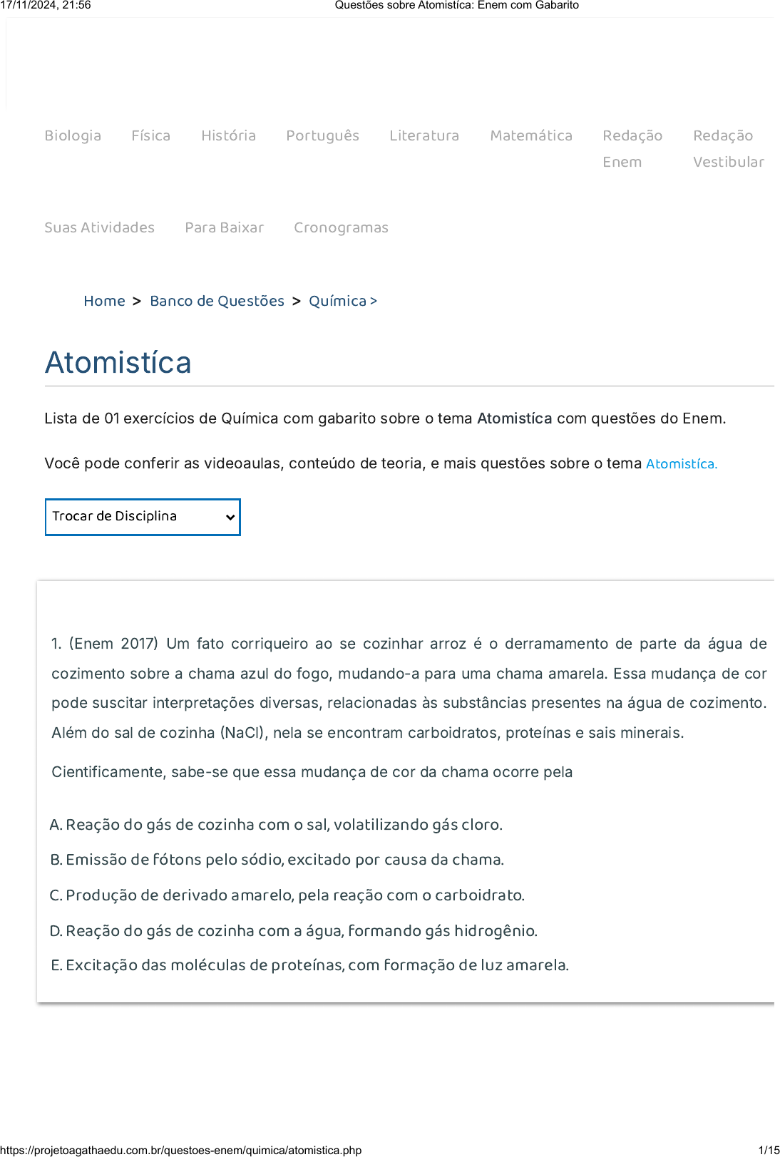 Biologia Física História Português Literatura Matemática Redação Enem Redação Vestibular Suas Atividades Para Baixar Cronogramas Home > Banco de Questões > Química > Atomistíca Lista de 01 exercícios de Química com gabarito sobre o tema Atomistíca com questões do Enem. Você pode conferir as videoaulas, conteúdo de teoria, e mais questões sobre o tema Atomistíca. Trocar de Disciplina 1. �Enem 2017� Um fato corriqueiro ao se cozinhar arroz é o derramamento de parte da água de cozimento sobre a chama azul do fogo, mudando-a para uma chama amarela. Essa mudança de cor pode suscitar interpretações diversas, relacionadas às substâncias presentes na água de cozimento. Além do sal de cozinha �NaCl�, nela se encontram carboidratos, proteínas e sais minerais. Cientificamente, sabe-se que essa mudança de cor da chama ocorre pela A. Reação do gás de cozinha com o sal, volatilizando gás cloro. B. Emissão de fótons pelo sódio, excitado por causa da chama. C. Produção de derivado amarelo, pela reação com o carboidrato. D. Reação do gás de cozinha com a água, formando gás hidrogênio. E. Excitação das moléculas de proteínas, com formação de luz amarela. 17/11/2024, 21:56 Questões sobre Atomistíca: Enem com Gabarito https://projetoagathaedu.com.br/questoes-enem/quimica/atomistica.php 1/15 https://projetoagathaedu.com.br/ https://projetoagathaedu.com.br/ https://projetoagathaedu.com.br/blog/biologia.php https://projetoagathaedu.com.br/blog/fisica.php https://projetoagathaedu.com.br/blog/historia.php https://projetoagathaedu.com.br/blog/linguagens.php https://projetoagathaedu.com.br/blog/literatura.php https://projetoagathaedu.com.br/blog/matematica.php https://projetoagatharedacao.com.br/guia-de-redacao-enem.php https://projetoagatharedacao.com.br/guia-de-redacao-enem.php https://projetoagatharedacao.com.br/guia-de-redacao-vestibular.php https://projetoagatharedacao.com.br/guia-de-redacao-vestibular.php https://projetoagathaedu.com.br/app/ https://projetoagathaedu.com.br/app/material.php https://projetoagathaedu.com.br/cronogramas-de-estudo.php https://projetoagathaedu.com.br/index.php https://projetoagathaedu.com.br/banco-de-questoes.php https://projetoagathaedu.com.br/banco-de-questoes/quimica.php https://projetoagathaedu.com.br/app/disciplinas/quimica/atomistica/introducao.php Mostrar o Gabarito Gabarito com Resolução Clique Para Compartilhar Esta Página Nas Redes Sociais Imprimir WhatsApp Facebook Twitter Pinterest Linkedin E-Mail Você acredita que o gabarito esteja incorreto? Avisa aí 😰| Email ou WhatsApp Conheça nossos grupos no WhatsApp Publicidade 😃 Química 1 Química 2 Química 3 Química 4 Química 5 Química 6 Química na Enem com Gabarito Exercícios: Estudo da Matéria 17/11/2024, 21:56 Questões sobre Atomistíca: Enem com Gabarito https://projetoagathaedu.com.br/questoes-enem/quimica/atomistica.php 2/15 https://projetoagathaedu.com.br/questoes-enem/resolucao-quimica/atomistica.php https://projetoagathaedu.com.br/questoes-enem/resolucao-quimica/atomistica.php https://projetoagathaedu.com.br/questoes-enem/resolucao-quimica/atomistica.php https://projetoagathaedu.com.br/questoes-enem/quimica/atomistica.php https://projetoagathaedu.com.br/questoes-enem/quimica/atomistica.php https://api.whatsapp.com/send?text=Quest%C3%B5es%20sobre%20Atomist%C3%ADca%3A%20Enem%20com%20Gabarito%20https%3A%2F%2Fprojetoagathaedu.com.br%2Fquestoes-enem%2Fquimica%2Fatomistica.php https://api.whatsapp.com/send?text=Quest%C3%B5es%20sobre%20Atomist%C3%ADca%3A%20Enem%20com%20Gabarito%20https%3A%2F%2Fprojetoagathaedu.com.br%2Fquestoes-enem%2Fquimica%2Fatomistica.php https://www.facebook.com/sharer/sharer.php?u=https%3A%2F%2Fprojetoagathaedu.com.br%2Fquestoes-enem%2Fquimica%2Fatomistica.php https://www.facebook.com/sharer/sharer.php?u=https%3A%2F%2Fprojetoagathaedu.com.br%2Fquestoes-enem%2Fquimica%2Fatomistica.php https://twitter.com/intent/tweet?url=https%3A%2F%2Fprojetoagathaedu.com.br%2Fquestoes-enem%2Fquimica%2Fatomistica.php&text=Quest%C3%B5es%20sobre%20Atomist%C3%ADca%3A%20Enem%20com%20Gabarito https://twitter.com/intent/tweet?url=https%3A%2F%2Fprojetoagathaedu.com.br%2Fquestoes-enem%2Fquimica%2Fatomistica.php&text=Quest%C3%B5es%20sobre%20Atomist%C3%ADca%3A%20Enem%20com%20Gabarito https://www.pinterest.com/pin/create/button/?url=https%3A%2F%2Fprojetoagathaedu.com.br%2Fquestoes-enem%2Fquimica%2Fatomistica.php&description=Quest%C3%B5es%20sobre%20Atomist%C3%ADca%3A%20Enem%20com%20Gabarito https://www.pinterest.com/pin/create/button/?url=https%3A%2F%2Fprojetoagathaedu.com.br%2Fquestoes-enem%2Fquimica%2Fatomistica.php&description=Quest%C3%B5es%20sobre%20Atomist%C3%ADca%3A%20Enem%20com%20Gabarito https://www.linkedin.com/shareArticle?mini=true&url=https%3A%2F%2Fprojetoagathaedu.com.br%2Fquestoes-enem%2Fquimica%2Fatomistica.php&title=Quest%C3%B5es%20sobre%20Atomist%C3%ADca%3A%20Enem%20com%20Gabarito&summary=Quest%C3%B5es%20sobre%20Atomist%C3%ADca%3A%20Enem%20com%20Gabarito https://www.linkedin.com/shareArticle?mini=true&url=https%3A%2F%2Fprojetoagathaedu.com.br%2Fquestoes-enem%2Fquimica%2Fatomistica.php&title=Quest%C3%B5es%20sobre%20Atomist%C3%ADca%3A%20Enem%20com%20Gabarito&summary=Quest%C3%B5es%20sobre%20Atomist%C3%ADca%3A%20Enem%20com%20Gabarito mailto:?subject=Quest%C3%B5es%20sobre%20Atomist%C3%ADca%3A%20Enem%20com%20Gabarito&body=Quest%C3%B5es%20sobre%20Atomist%C3%ADca%3A%20Enem%20com%20Gabarito%20https%3A%2F%2Fprojetoagathaedu.com.br%2Fquestoes-enem%2Fquimica%2Fatomistica.php mailto:?subject=Quest%C3%B5es%20sobre%20Atomist%C3%ADca%3A%20Enem%20com%20Gabarito&body=Quest%C3%B5es%20sobre%20Atomist%C3%ADca%3A%20Enem%20com%20Gabarito%20https%3A%2F%2Fprojetoagathaedu.com.br%2Fquestoes-enem%2Fquimica%2Fatomistica.php https://samuel.martins@projetoagathaedu.com.br/ https://api.whatsapp.com/send?phone=5533991664829 https://www.projetoagathaedu.com.br/grupo-no-whatsapp.php https://www.projetoagathaedu.com.br/grupo-no-whatsapp.php Curva do Aquecimento Densi