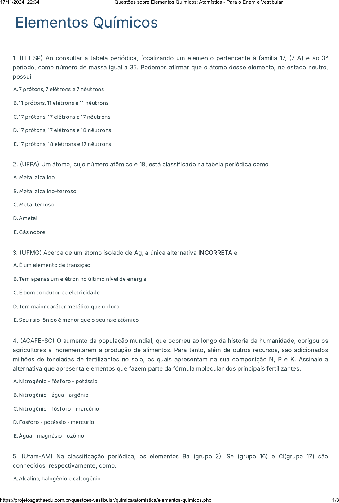 Elementos Químicos 1. �FEI�SP� Ao consultar a tabela periódica, focalizando um elemento pertencente à família 17, �7 A) e ao 3° período, como número de massa igual a 35. Podemos afirmar que o átomo desse elemento, no estado neutro, possui A. 7 prótons, 7 elétrons e 7 nêutrons B. 11 prótons, 11 elétrons e 11 nêutrons C. 17 prótons, 17 elétrons e 17 nêutrons D. 17 prótons, 17 elétrons e 18 nêutrons E. 17 prótons, 18 elétrons e 17 nêutrons 2. �UFPA� Um átomo, cujo número atômico é 18, está classificado na tabela periódica como A. Metal alcalino B. Metal alcalino-terroso C. Metal terroso D. Ametal E. Gás nobre 3. �UFMG� Acerca de um átomo isolado de Ag, a única alternativa INCORRETA é A. É um elemento de transição B. Tem apenas um elétron no último nível de energia C. É bom condutor de eletricidade D. Tem maior caráter metálico que o cloro E. Seu raio iônico é menor que o seu raio atômico 4. �ACAFE�SC� O aumento da população mundial, que ocorreu ao longo da história da humanidade, obrigou os agricultores a incrementarem a produção de alimentos. Para tanto, além de outros recursos, são adicionados milhões de toneladas de fertilizantes no solo, os quais apresentam na sua composição N, P e K. Assinale a alternativa que apresenta elementos que fazem parte da fórmula molecular dos principais fertilizantes. A. Nitrogênio - fósforo - potássio B. Nitrogênio - água - argônio C. Nitrogênio - fósforo - mercúrio D. Fósforo - potássio - mercúrio E. Água - magnésio - ozônio 5. �Ufam-AM� Na classificação periódica, os elementos Ba (grupo 2�, Se (grupo 16) e Cl(grupo 17) são conhecidos, respectivamente, como: A. Alcalino, halogênio e calcogênio 17/11/2024, 22:34 Questões sobre Elementos Químicos: Atomística - Para o Enem e Vestibular https://projetoagathaedu.com.br/questoes-vestibular/quimica/atomistica/elementos-quimicos.php 1/3 B. Alcalinoterroso, halogênio e calcogênio C. Alcalinoterrosos, calcogênio e halogênio D. Alcalino, halogênio e gás nobre E. Alcalinoterroso, calcogênio e gás nobre 06. �UFPI� Assinale a alternativa em que o elemento químico cuja configuração eletrônica, na ordem crescente de energia, finda em 4s² 3d³: A. Grupo 3 e 2º período. B. Grupo 14 e 2º período. C. Grupo 14 e 5º período. D. Grupo 5 e 4º período. E. Grupo 15 e 3º período. 07. �ITA�SP� As propriedades dos elementos são função periódica de sua (seu): A. Massa atômica B. Número atômico C. Diâmetro atômico D. Número de oxidação E. Raios atômico e iônico 08. �Unitins) Com relação à classificação periódica moderna dos elementos, identifique a afirmação verdadeira: A. Em uma família, os elementos apresentam geralmente o mesmo número de elétrons na última camada. B. Na tabela periódica, os elementos químicos estão colocados em ordem decrescente de massas atômicas. C. Em uma família, os elementos apresentam propriedades químicas bem distintas. D. Em um período, os elementos apresentam propriedades químicas semelhantes. E. Todos os elementos representativos pertencem ao grupo B da tabela periódica. 09. �Univale-SC� O bromato de potássio, produto de aplicação controvertida na fabricação de pães, tem como fórmula KBrO3. Os elementos que o constituem, na ordem indicada na fórmula, são das famílias dos: A. Alcalinos, halogênios e calcogênios B. Halogênios, calcogênios e alcalinos C. Calcogênios, halogênios e alcalinos D. Alcalinoterrosos, calcogênios e halogênios E. Alcalinoterrosos, halogênios e calcogênios 10. �UFAC� Os organismos vivos são constituídos de compostos de carbono. Isto acontece devido às propriedades deste elemento. Assim, um escritor de ficção científica pediu auxílio a um estudante do ensino médio para a escolha de um elemento químico capaz de substituir o carbono na formação de compostos. O estudante escolheu, com base em seus conhecimentos de tabela periódica, um elemento que tem quase o 17/11/2024, 22:34 Questões sobre Elementos Químicos: Atomística - Para o Enem e Vestibular https://projetoagathaedu.com.br/questoes-vestibular/quimica/atomistica/elementos-quimicos.php 2/3 mesmo tamanho do carbono, eletronegatividade muito semelhante e mesma valência. O elemento escolhido, número atômico igual a 14, foi: A. Nitrogênio B. Boro C. Alumínio D. Silício E. Fósforo Gabarito 1.D 2.E 3.B 4.A 5.C 6.D 7.B 8.A 9.A 10.D Clique Para Compartilhar Esta Página Nas Redes Sociais Imprimir WhatsApp Facebook Twitter Pinterest Linkedin E-Mail 17/11/2024, 22:34 Questões sobre Elementos Químicos: Atomística - Para o Enem e Vestibular https://projetoagathaedu.com.br/questoes-vestibular/quimica/atomistica/elementos-quimicos.php 3/3 https://projetoagathaedu.com.br/questoes-vestibular/quimica/atomistica/elementos-quimicos.php https://projetoagathaedu.com.br/questoes-vestibular/quimica/atomistica/elementos-quimicos.php https://api.whatsapp.com/send?text=Quest%C3%B5es%20sobre%20Elementos%20Qu%C3%ADmicos%3A%20Atom%C3%ADstica%20-%20Para%20o%20Enem%20e%20Vestibular%20https%3A%2F%2Fprojetoagathaedu.com.br%2Fquestoes-vestibular%2Fquimica%2Fatomistica%2Felementos-quimicos.php https://api.whatsapp.com/send?text=Quest%C3%B5es%20sobre%20Elementos%20Qu%C3%ADmicos%3A%20Atom%C3%ADstica%20-%20Para%20o%20Enem%20e%20Vestibular%20https%3A%2F%2Fprojetoagathaedu.com.br%2Fquestoes-vestibular%2Fquimica%2Fatomistica%2Felementos-quimicos.php https://www.facebook.com/sharer/sharer.php?u=https%3A%2F%2Fprojetoagathaedu.com.br%2Fquestoes-vestibular%2Fquimica%2Fatomistica%2Felementos-quimicos.php https://www.facebook.com/sharer/sharer.php?u=https%3A%2F%2Fprojetoagathaedu.com.br%2Fquestoes-vestibular%2Fquimica%2Fatomistica%2Felementos-quimicos.php https://twitter.com/intent/tweet?url=https%3A%2F%2Fprojetoagathaedu.com.br%2Fquestoes-vestibular%2Fquimica%2Fatomistica%2Felementos-quimicos.php&text=Quest%C3%B5es%20sobre%20Elementos%20Qu%C3%ADmicos%3A%