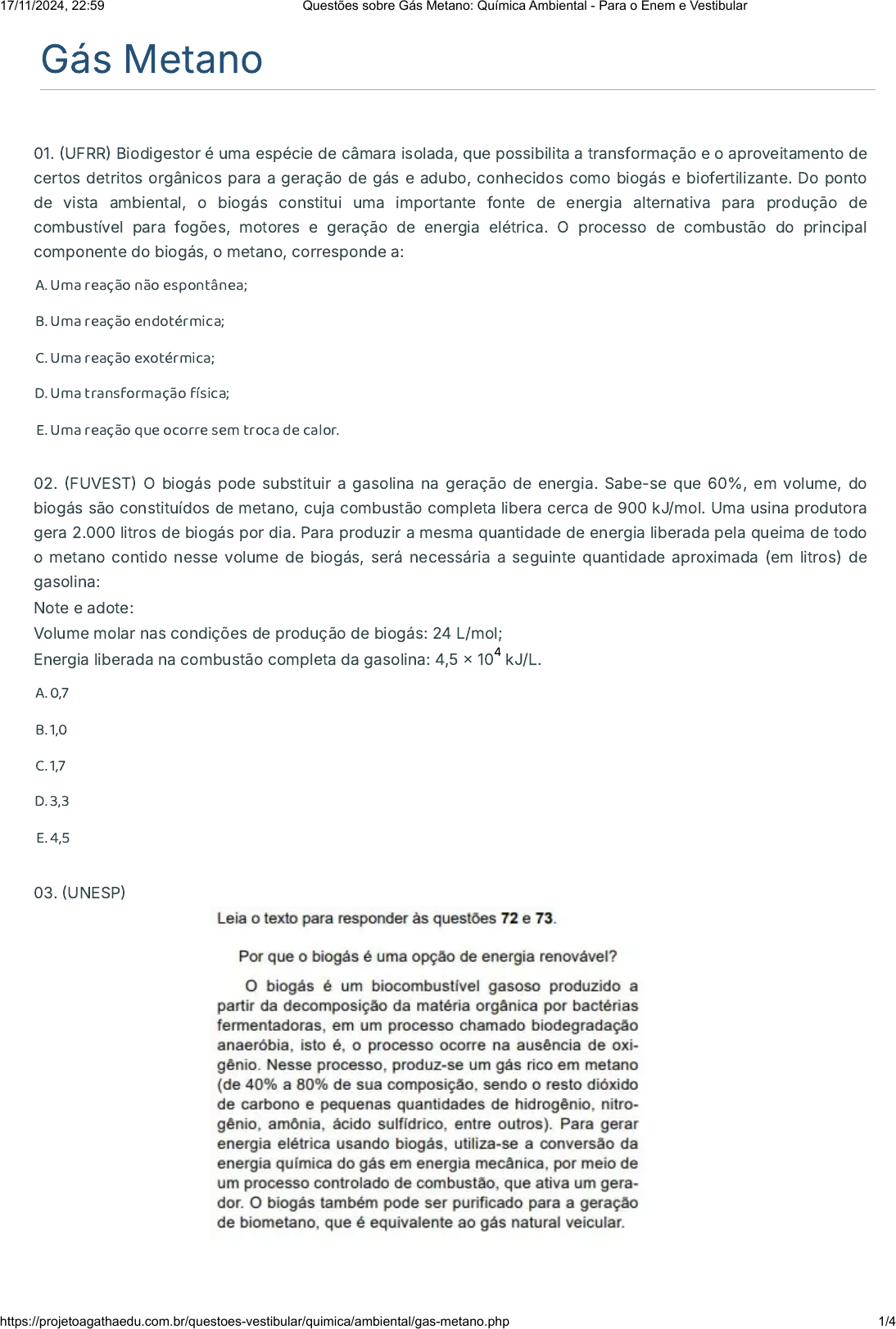 Gás Metano 01. �UFRR� Biodigestor é uma espécie de câmara isolada, que possibilita a transformação e o aproveitamento de certos detritos orgânicos para a geração de gás e adubo, conhecidos como biogás e biofertilizante. Do ponto de vista ambiental, o biogás constitui uma importante fonte de energia alternativa para produção de combustível para fogões, motores e geração de energia elétrica. O processo de combustão do principal componente do biogás, o metano, corresponde a: A. Uma reação não espontânea; B. Uma reação endotérmica; C. Uma reação exotérmica; D. Uma transformação física; E. Uma reação que ocorre sem troca de calor. 02. �FUVEST� O biogás pode substituir a gasolina na geração de energia. Sabe-se que 60%, em volume, do biogás são constituídos de metano, cuja combustão completa libera cerca de 900 kJ/mol. Uma usina produtora gera 2.000 litros de biogás por dia. Para produzir a mesma quantidade de energia liberada pela queima de todo o metano contido nesse volume de biogás, será necessária a seguinte quantidade aproximada (em litros) de gasolina: Note e adote: Volume molar nas condições de produção de biogás: 24 L/mol; Energia liberada na combustão completa da gasolina: 4,5 � 10 kJ/L. A. 0,7 B. 1,0 C. 1,7 D. 3,3 E. 4,5 03. �UNESP� 4 17/11/2024, 22:59 Questões sobre Gás Metano: Química Ambiental - Para o Enem e Vestibular https://projetoagathaedu.com.br/questoes-vestibular/quimica/ambiental/gas-metano.php 1/4 Para a obtenção de biometano a partir do biogás, este deve passar por purificação, de modo a aumentar o teor de metano pela diminuição do teor de dióxido de carbono. Um procedimento que pode ser empregado com essa finalidade é fazer o biogás A. Borbulhar em uma solução aquosa concentrada de ácido clorídrico. B. Borbulhar em uma solução aquosa saturada de hidróxido de cálcio. C. Atravessar tubulações preenchidas com o secante sílica-gel. D. Atravessar �ltros de areia, como os empregados nas estações de tratamento de água. E. Atravessar �ltros de papel, como os empregados nos �ltros de ar em automóveis. 04. �ACAFE� No jornal Folha de São Paulo, de 01 de novembro de 2013, foi publicada um reportagem sobre uma Universidade paulista que foi construída sobre terra que contém lixo orgânico ´´[...] Com o passar do tempo, esse material começa a emitir gás metano, que é tóxico e explosivo […]”. Quantos litros de O2(g) a 1,00 atm e 27ºC são necessários para reagir em uma reação de combustão completa com 40g de gás metano? Dado: Constante universal dos gases �R�� 0,082 atm.L.mol-.K�. C� 12 g/mol, H� 1 g/mol. A. 123L B. 61,5L C. 24,6 L D. 49,2 L 05. �FGV�SP� A produção de suínos gera uma quantidade muito grande e controlada de dejetos, que vem sendo empregada em biocon-versores para geração de gás metano. O metano, por sua vez, pode ser utilizado para obtenção de gás H2. Em uma reação denominada reforma, o metano reage com vapor-dʼágua na presença de um catalisador formando hidrogênio e dióxido de carbono de acordo com o equilíbrio CH4 (g) + H2O (g) ⇌ 3H2 (g) + CO2 (g) ∆Ho > 0. O deslocamento do equilíbrio no sentido da formação do H2 é favorecido por: I. aumento da pressão; II. adição do catalisador; III. aumento da temperatura. É correto apenas o que se afirma em A. I. B. I e II. 17/11/2024, 22:59 Questões sobre Gás Metano: Química Ambiental - Para o Enem e Vestibular https://projetoagathaedu.com.br/questoes-vestibular/quimica/ambiental/gas-metano.php 2/4 C. II. D. II e III. E. III. 06. �USS� A queima completa de combustíveis fósseis e a decomposição de matérias orgânicas são responsáveis pela emissão de gás carbônico e gás metano, que causam sérios problemas ambientais, tais como o aquecimento global. As interações entre as moléculas desses gases são denominadas: A. Ligação de hidrogênio B. Covalente coordenada polar C. Dipolo induzido-dipolo induzido D. Dipolo permanente-dipolo permanente 07. �Enem� Moradores sobreviventes da tragédia que destruiu aproximadamente 60 casas no Morro do Bumba, na Zona Norte de Niterói �RJ�, ainda defendem a hipótese de o deslizamento ter sido causado por uma explosão provocada por gás metano, visto que esse local foi um lixão entre os anos 1960 e 1980. Jornal Web. Disponível em: http://www.ojornalweb.com. Acesso em: 12 abr. 2010 (adaptado). O gás mencionado no texto é produzido A. Como subproduto da respiração aeróbia bacteriana B. Pela degradação anaeróbia de matéria orgânica por bactérias. C. Como produto da fotossíntese de organismos pluricelulares autótrofos D. Pela transformação química do gás carbônico em condições anaeróbias E. Pela conversão, por oxidação química, do gás carbônico sob condições aeróbias. 08. �UNIFOR� Os alcanos sofrem reação de combustão com oxigênio em altas temperaturas. A oxidação dos hidrocarbonetos saturados é a base para o seu uso como fente de energia na produção de calor. A reação de combustão total do gás metano produz: A. Dióxido de carbono e água. B. Monóxido de carbono e hidrogênio. C. Formaldeído, metila e hidrogênio. D. Radical metila e monóxido de carbono. E. Monóxido de carbono, oxigênio e água. 09. �UECE� O biogás produzido pela fermentação de matérias orgânicas animais ou vegetais na ausência do oxigênio é uma mistura composta essencialmente de metano e dióxido de carbono. O metano reage com o oxigênio produzindo gás carbônico e água. Considere os seguintes valores de entalpia abaixo a 300 K� Assim, é correto afirmar que a entalpia padrão da combustão do metano em kcal/mol será, aproximadamente, A. –91,00. B. –182,00. C. –124,30. D. –176,90. 17/11/2024, 22:59 Questões sobre Gás Metano: Química Ambiental - Para o Enem e Vestibular https://projetoagathaedu.com.br/questoes-vestibular/quimica/ambiental/gas-metano.php 