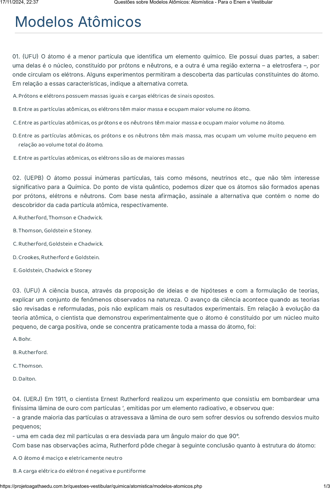 Modelos Atômicos 01. �UFU� O átomo é a menor partícula que identifica um elemento químico. Ele possui duas partes, a saber: uma delas é o núcleo, constituído por prótons e nêutrons, e a outra é uma região externa – a eletrosfera –, por onde circulam os elétrons. Alguns experimentos permitiram a descoberta das partículas constituintes do átomo. Em relação a essas características, indique a alternativa correta. A. Prótons e elétrons possuem massas iguais e cargas elétricas de sinais opostos. B. Entre as partículas atômicas, os elétrons têm maior massa e ocupam maior volume no átomo. C. Entre as partículas atômicas, os prótons e os nêutrons têm maior massa e ocupam maior volume no átomo. D. Entre as partículas atômicas, os prótons e os nêutrons têm mais massa, mas ocupam um volume muito pequeno em relação ao volume total do átomo. E. Entre as partículas atômicas, os elétrons são as de maiores massas 02. �UEPB� O átomo possui inúmeras partículas, tais como mésons, neutrinos etc., que não têm interesse significativo para a Química. Do ponto de vista quântico, podemos dizer que os átomos são formados apenas por prótons, elétrons e nêutrons. Com base nesta afirmação, assinale a alternativa que contém o nome do descobridor da cada partícula atômica, respectivamente. A. Rutherford, Thomson e Chadwick. B. Thomson, Goldstein e Stoney. C. Rutherford, Goldstein e Chadwick. D. Crookes, Rutherford e Goldstein. E. Goldstein, Chadwick e Stoney 03. �UFU� A ciência busca, através da proposição de ideias e de hipóteses e com a formulação de teorias, explicar um conjunto de fenômenos observados na natureza. O avanço da ciência acontece quando as teorias são revisadas e reformuladas, pois não explicam mais os resultados experimentais. Em relação à evolução da teoria atômica, o cientista que demonstrou experimentalmente que o átomo é constituído por um núcleo muito pequeno, de carga positiva, onde se concentra praticamente toda a massa do átomo, foi: A. Bohr. B. Rutherford. C. Thomson. D. Dalton. 04. �UERJ� Em 1911, o cientista Ernest Rutherford realizou um experimento que consistiu em bombardear uma finíssima lâmina de ouro com partículas ‘, emitidas por um elemento radioativo, e observou que: - a grande maioria das partículas α atravessava a lâmina de ouro sem sofrer desvios ou sofrendo desvios muito pequenos; - uma em cada dez mil partículas α era desviada para um ângulo maior do que 90°. Com base nas observações acima, Rutherford pôde chegar à seguinte conclusão quanto à estrutura do átomo: A. O átomo é maciço e eletricamente neutro B. A carga elétrica do elétron é negativa e puntiforme 17/11/2024, 22:37 Questões sobre Modelos Atômicos: Atomística - Para o Enem e Vestibular https://projetoagathaedu.com.br/questoes-vestibular/quimica/atomistica/modelos-atomicos.php 1/3 C. O ouro é radioativo e um bom condutor de corrente elétrica D. O núcleo do átomo é pequeno e contém a maior parte da massa 05. �Fuvest� Supondo que 1 nêutron apresenta massa 1 kg, qual seria a massa de um átomo com 11 prótons, 12 nêutrons e 11 elétrons? A. 1 kg B. 11 kg C. 12 kg D. 23 kg E. 34 kg 06. �PUC�RS� O átomo, na visão de Thomson, é constituído de: A. Níveis e subníveis de energia. B. Cargas positivas e negativas. C. Núcleo e eletrosfera. D. Grandes espaços vazios. E. Orbitais. 07. �UCB� Rutherford, ao fazer incidir partículas radioativas em lâmina metálica de ouro, observou que a maioria das partículas atravessava a lâmina, algumas desviavam e poucas refletiam. Assinale, dentre as afirmações a seguir, aquela que não reflete as conclusões de Rutherford sobre o átomo A. Os átomos são esferas maciças e indestrutíveis. B. No átomo há grandes espaços vazios. C. No centro do átomo existe um núcleo pequeno e denso. D. O núcleo do átomo tem carga positiva. E. Os elétrons giram ao redor do núcleo para equilibrar a carga positiva 08. �UNEB�BA� Um estudante fez as seguintes afirmações sobre o modelo atômico de Rutherford: I. Os elétrons movem-se em órbitas circulares ao redor do núcleo, com energia definida. II. As cargas positivas ocupam um pequeno volume do átomo, constituindo o seu núcleo, que é responsável pela maior parte da massa do átomo. III. As cargas negativas têm seu comportamento no átomo descrito por quatro números quânticos. Com respeito a estas afirmações pode-se dizer que: A. I, II e III são verdadeiras. B. Apenas I e II são verdadeiras. C. Apenas II e III são verdadeiras. D. Apenas I é verdadeira. E. Apenas II é verdadeira. 09. �Fuvest� Há exatos 100 anos, J. J. Thomson determinou, pela primeira vez, a relação entre a massa e a carga do elétron, o que pode ser considerado como a descoberta do elétron. É reconhecida como uma 17/11/2024, 22:37 Questões sobre Modelos Atômicos: Atomística - Para o Enem e Vestibular https://projetoagathaedu.com.br/questoes-vestibular/quimica/atomistica/modelos-atomicos.php 2/3 contribuição de Thomson ao modelo atômico, A. O átomo ser indivisível. B. A existência de partículas subatômicas. C. Os elétrons ocuparem níveis discretos de energia. D. Os elétrons girarem em órbitas circulares ao redor do núcleo. E. O átomo possuir um núcleo com carga positiva e uma eletrosfera. 10. �UEL� “O átomo contém um núcleo positivo, muito pequeno e denso, com todos os prótons, que concentra praticamente toda a massa. Os elétrons devem estar distribuídos em algum lugar do volume restante do átomo”. Esta afirmação é devida a: A. Rutherford. B. Millikan. C. Thomson. D. Bohr. E. Faraday Gabarito 1.D 2.A 3.B 4.D 5.D 6.B 7.A 8.E 9.B 10.A Clique Para Compartilhar Esta Página Nas Redes Sociais Imprimir WhatsApp Facebook Twitter Pinterest Linkedin E-Mail 17/11/2024, 22:37 Questões sobre Modelos Atômicos: Atomística - Para o Enem e Vestibular https://projetoagath